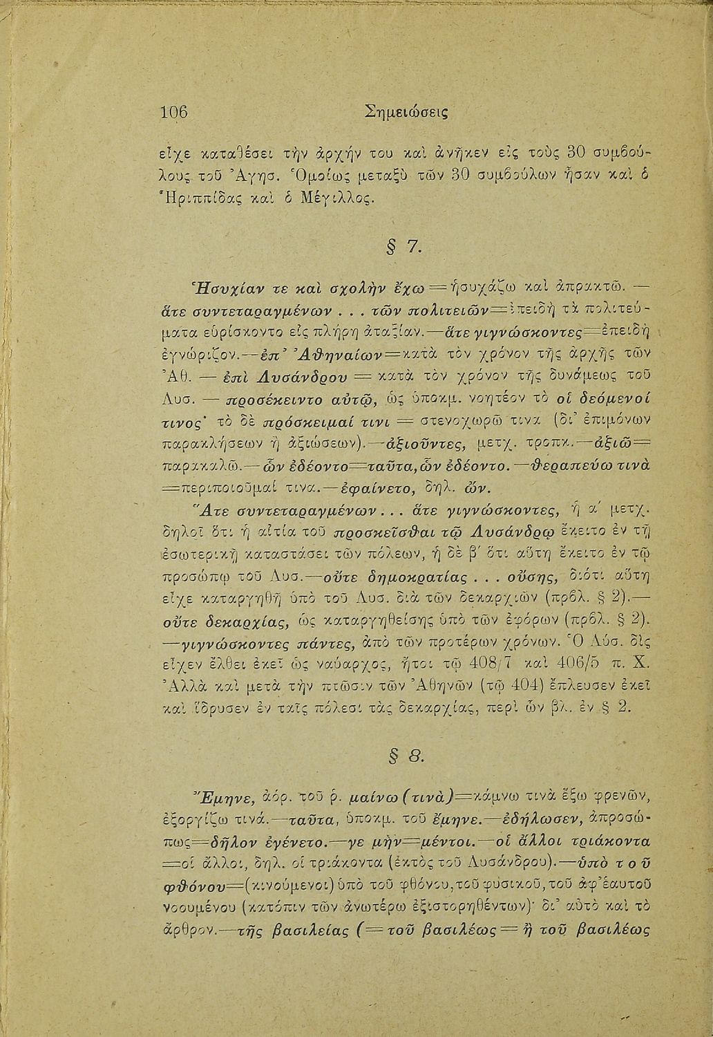 Σχολικό εγχειρίδιο Αρχαίων Ελληνικών που περιλαμβάνει αποσπάσματα από το έργο του Ξενοφώντα Ελληνικά και τα έργα του Λουκιανού Ενύπνιον και Ανάχαρσις, βιογραφικά σημειώματα των συγγραφέων, ερμηνευτικές και πραγματολογικές σημειώσεις και πίνακα των κυριοτέρων ονομάτων.
