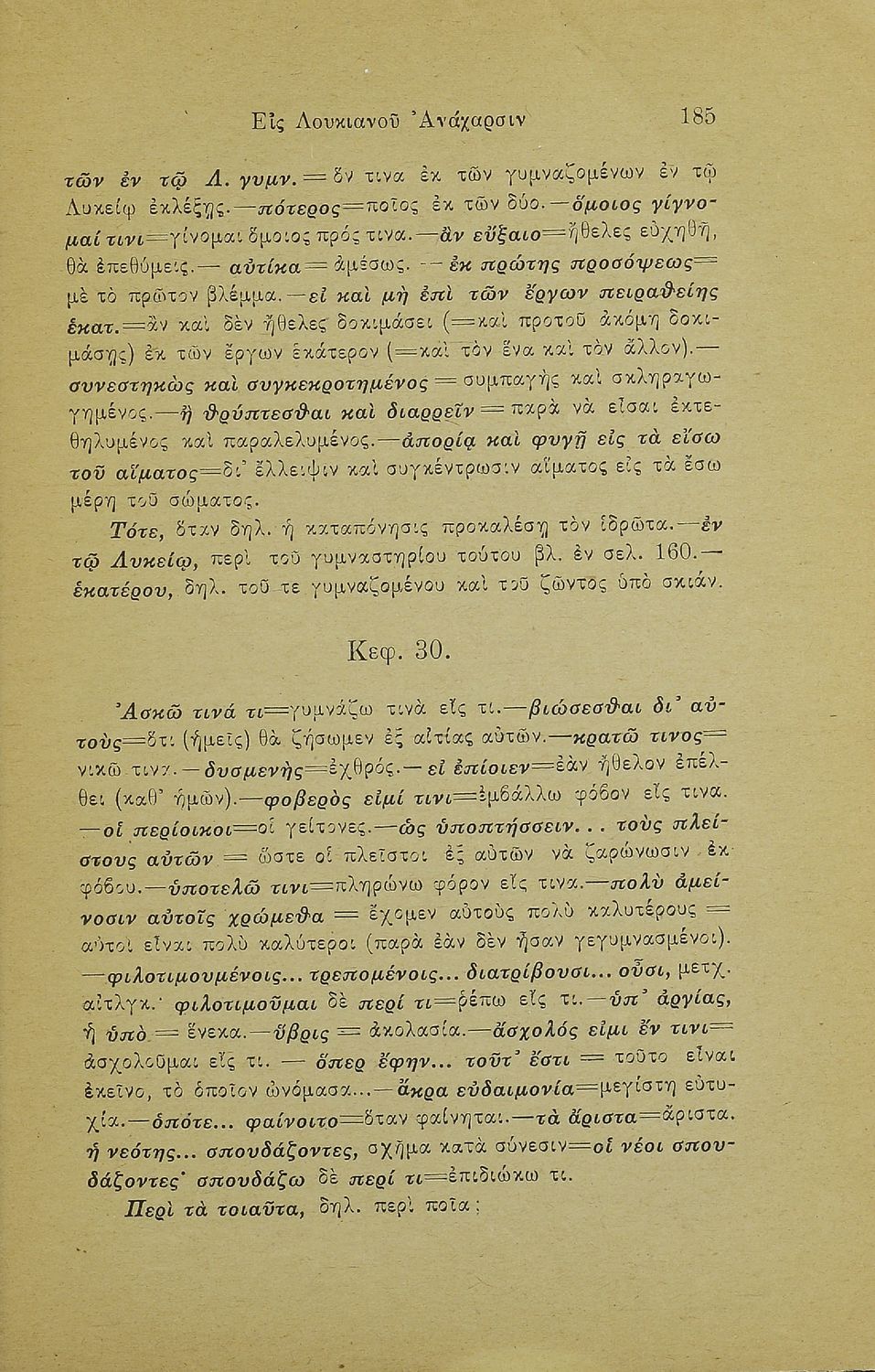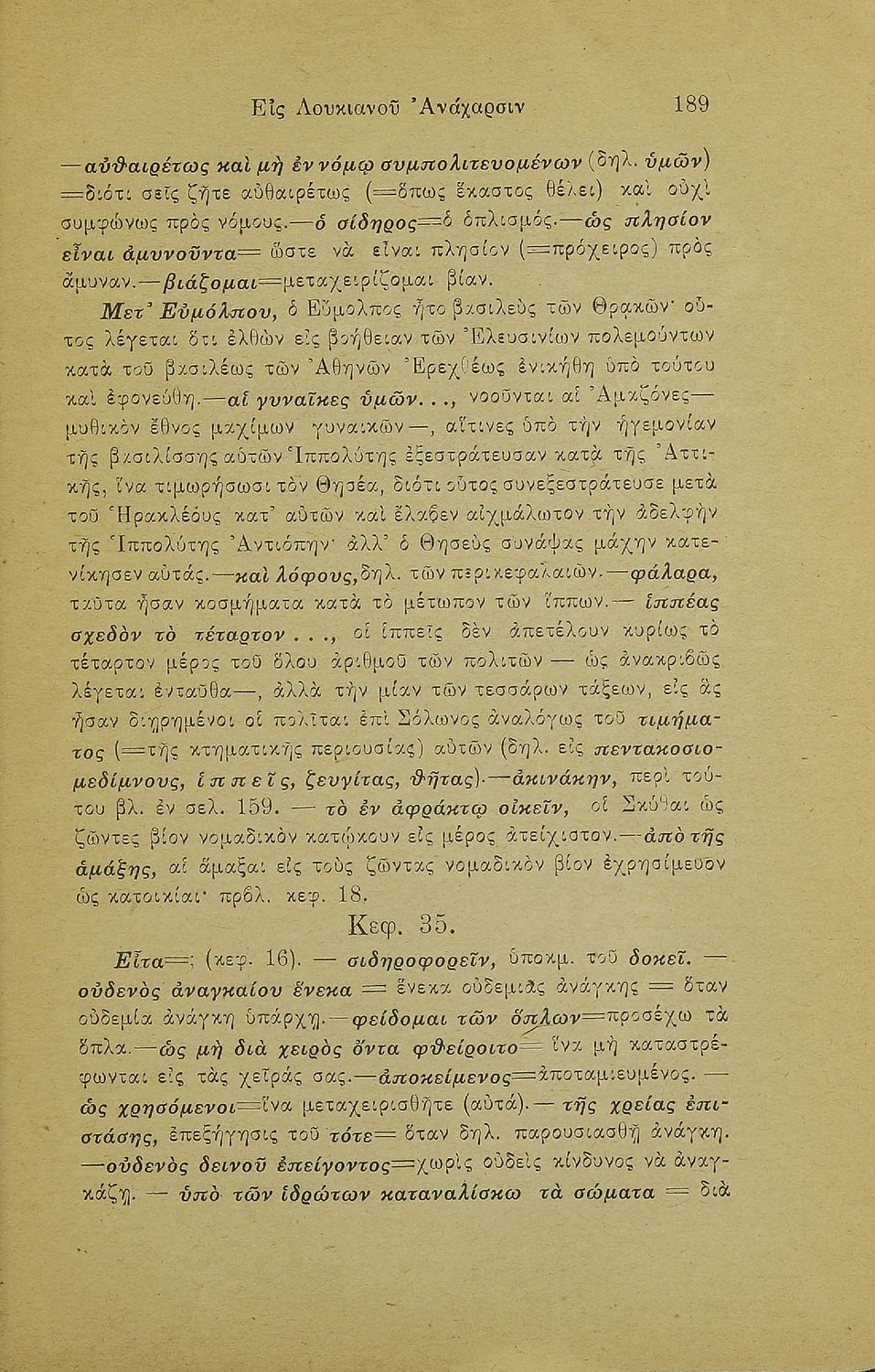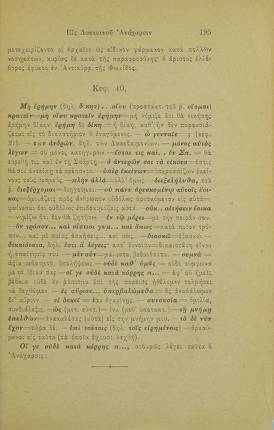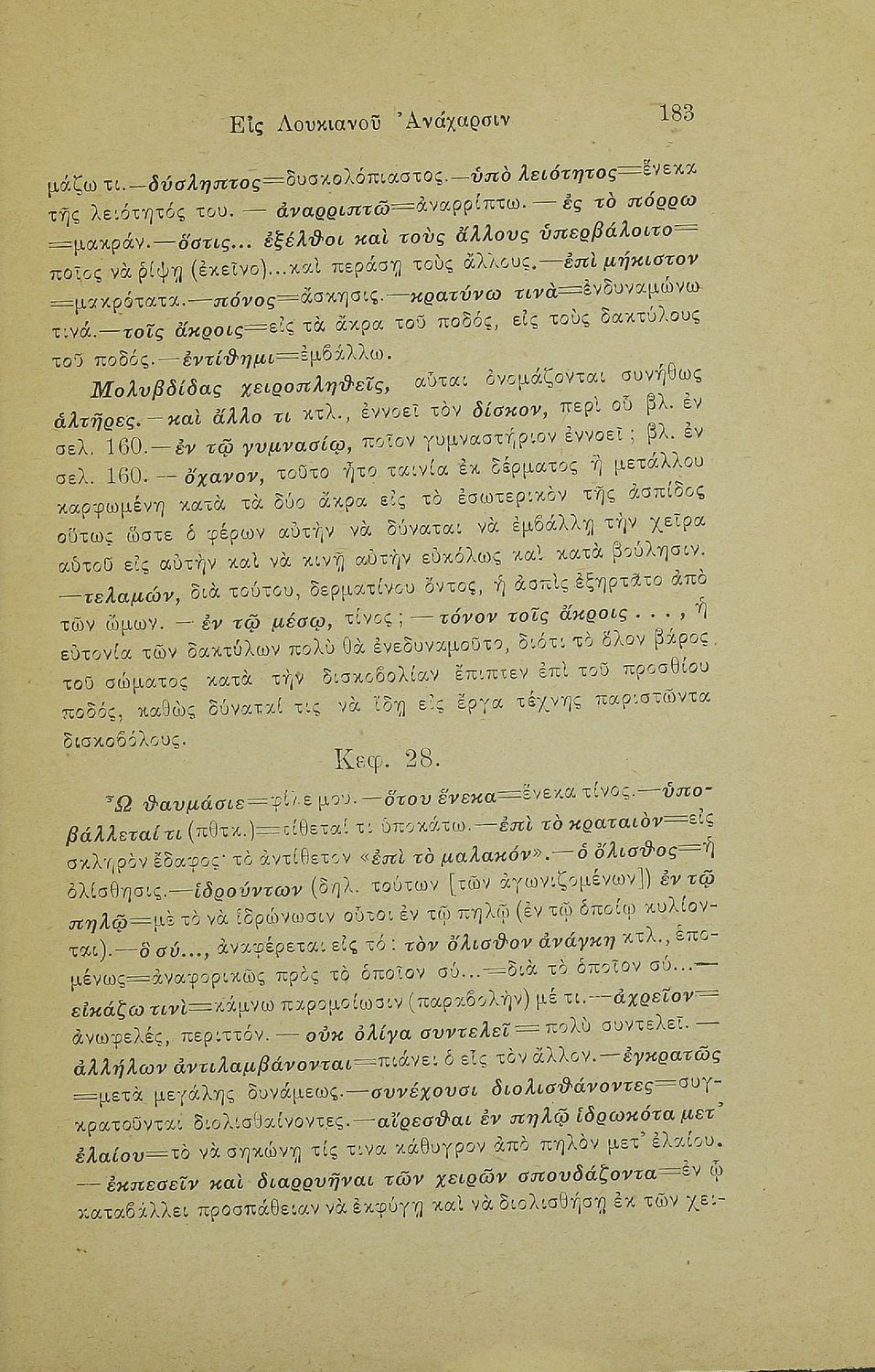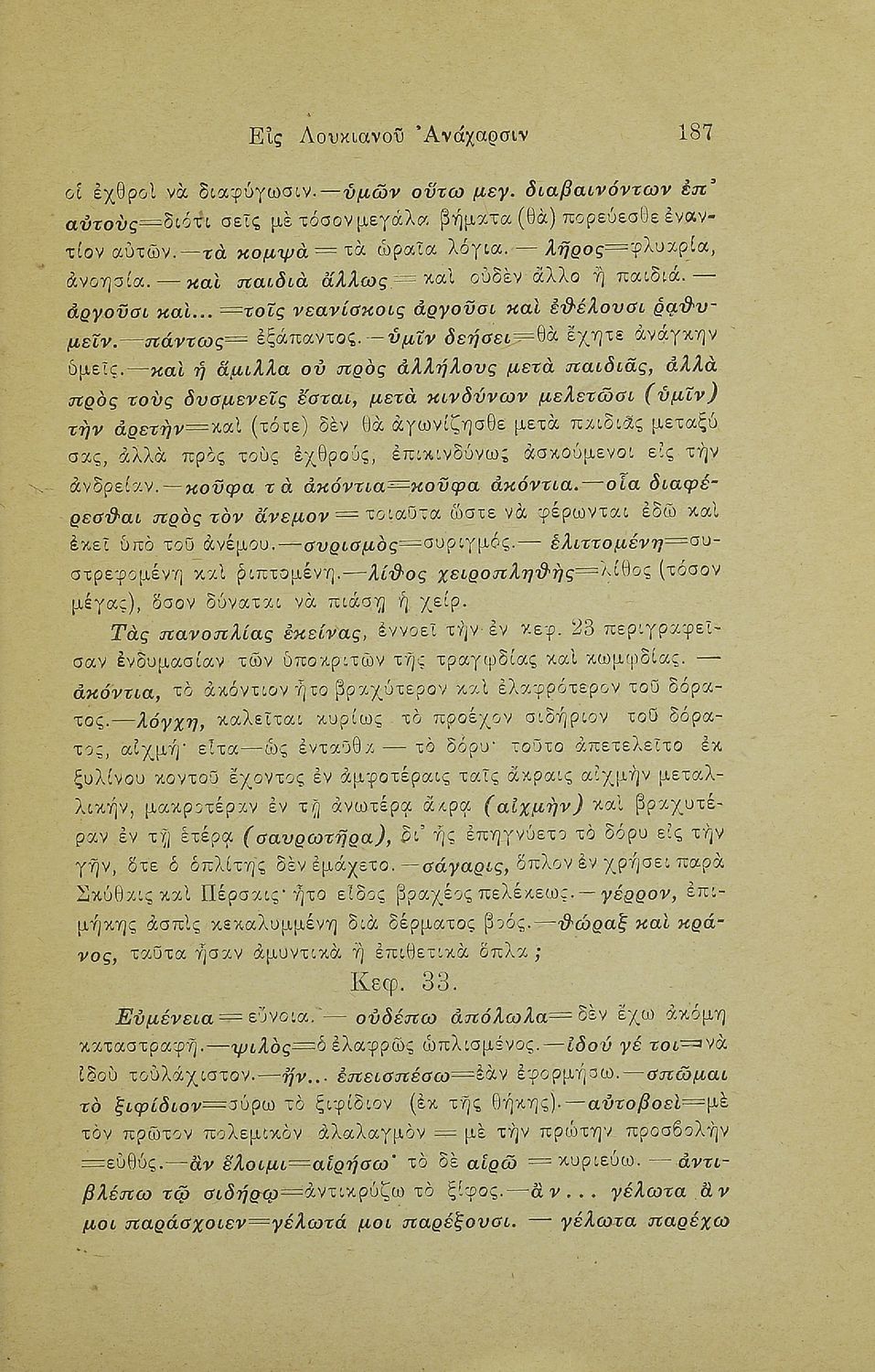 Σχολικό εγχειρίδιο Αρχαίων Ελληνικών Γ' Ελληνικού Σχολείου που περιέχει τα έργα του Λουκιανού Ανάχαρσις και Ενύπνιον και ερμηνευτικές και λεξιλογικές παρατηρήσεις.