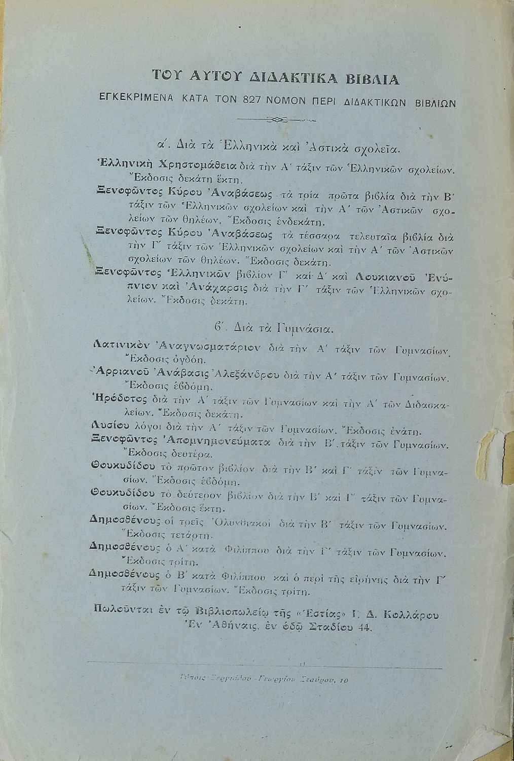 Σχολικό εγχειρίδιο Αρχαίων Ελληνικών για τα Ελληνικά Σχολεία και Παρθεναγωγεία που περιέχει αποσπάσματα από τα έργα του Ξενοφώντα Ελληνικά (βιβλία Α΄ και Β΄ ) και Κύρου Παιδεία, σημειώσεις και ερμηνευτικά ...