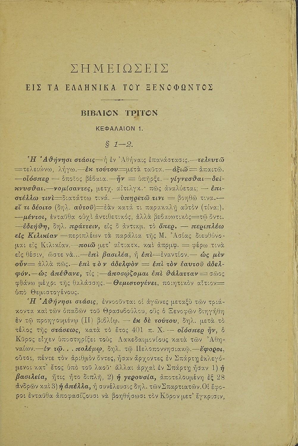 Σχολικό εγχειρίδιο Αρχαίων Ελληνικών για τα Ελληνικά Σχολεία και Παρθεναγωγεία που περιέχει αποσπάσματα από τα έργα του Ξενοφώντα Ελληνικά (βιβλία Α΄ και Β΄ ) και Κύρου Παιδεία, σημειώσεις και ερμηνευτικά ...