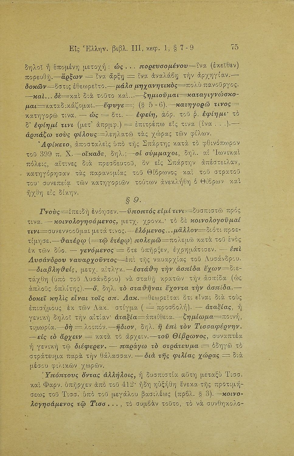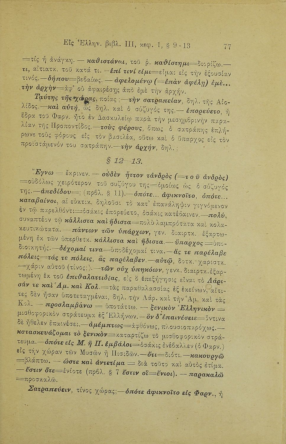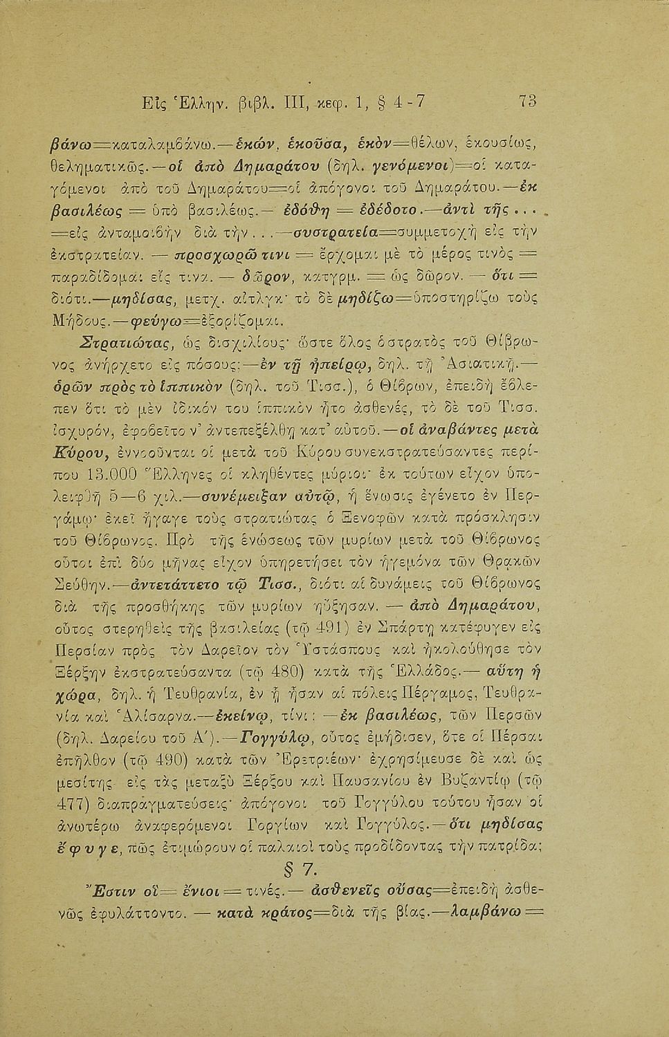 Σχολικό εγχειρίδιο Αρχαίων Ελληνικών Γ' Ελληνικού Σχολείου που περιλαμβάνει γραμματική της αρχαίας ελληνικής, αποσπάσματα από το έργο του Ξενοφώντα Ελληνικά και τα έργα του Λουκιανού Ενύπνιον και Ανάχαρσις, ...