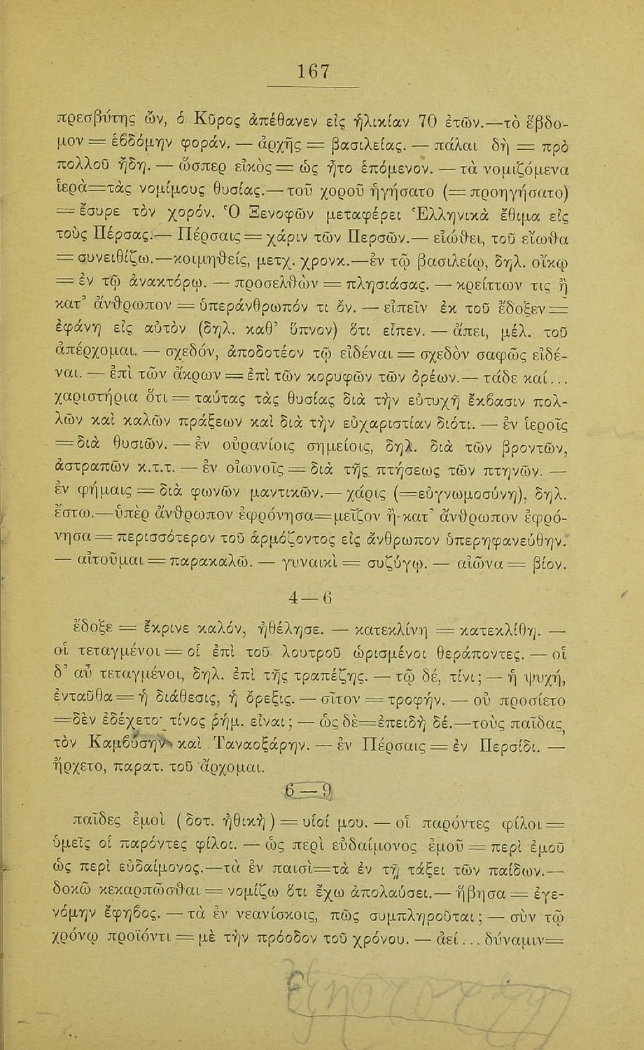 Βαθμίδα εκπαίδευσης: Δευτεροβάθμια Μάθημα: Αρχαία Ελληνικά Γλώσσα: Καθαρεύουσα Παρουσίαση περιεχομένου: Σχολικό εγχειρίδιο Αρχαίων Ελληνικών που περιλαμβάνει αποσπάσματα από τα έργα του Ξενοφώντα Ελληνικά και Κύρου Παιδεία, εισαγωγικά σχόλια στη ζωή και το έργο του, ερμηνευτικά και πραγματολογικά σχόλια και λεξιλογικές παρατηρήσεις. |