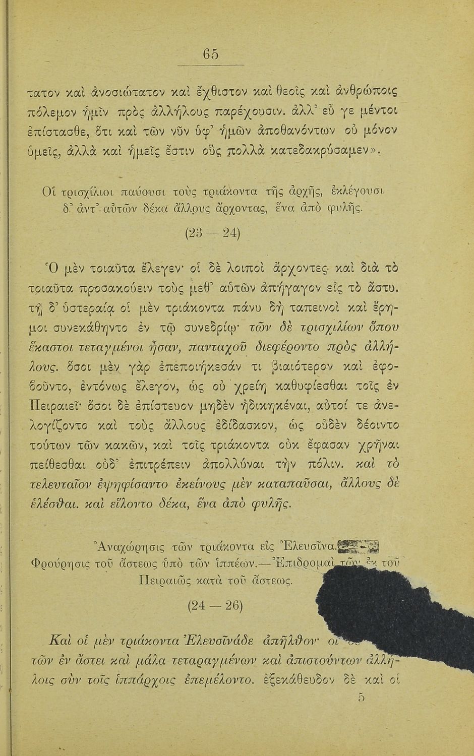 Σχολικό εγχειρίδιο Αρχαίων Ελληνικών Β΄ Γυμνασίου που περιλαμβάνει εισαγωγή στα Ελληνικά του Ξενοφώντα, το 3ο και το 4ο βιβλίο από τα Ελληνικά, ερμηνευτικές σημειώσεις και χωρογραφικό πίνακα της περιοχής.