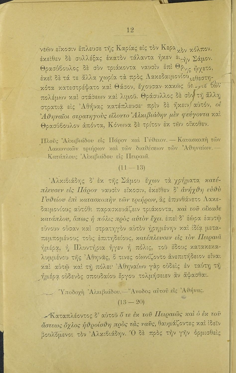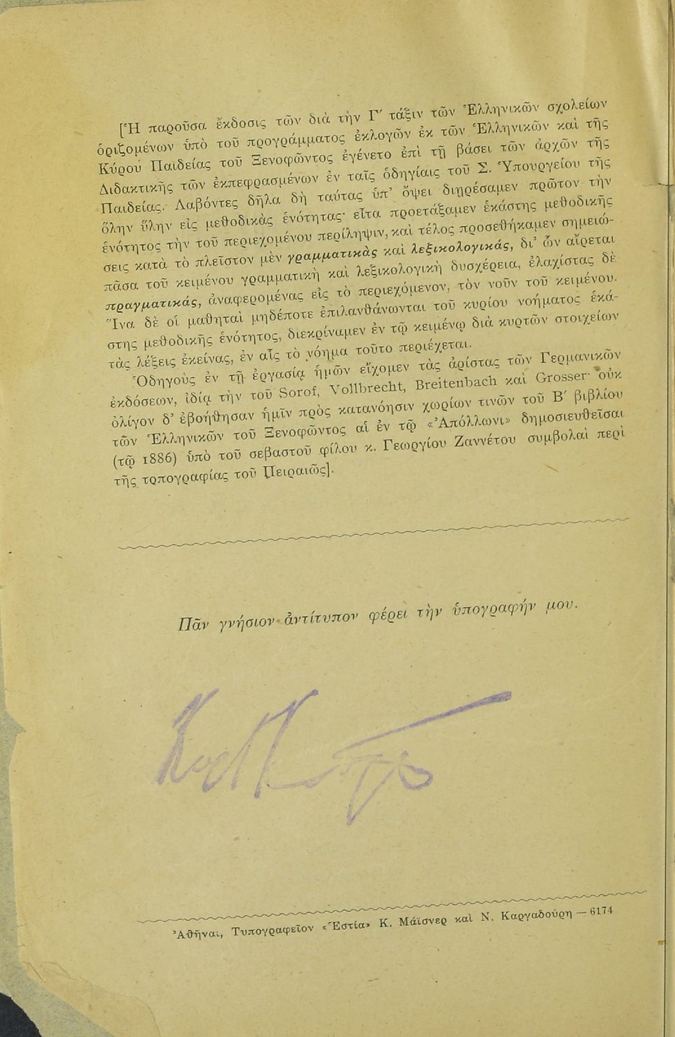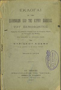 Βαθμίδα εκπαίδευσης: Δευτεροβάθμια Μάθημα: Αρχαία Ελληνικά Γλώσσα: Καθαρεύουσα Παρουσίαση περιεχομένου: Σχολικό εγχειρίδιο Αρχαίων Ελληνικών που περιλαμβάνει αποσπάσματα από τα έργα του Ξενοφώντα Ελληνικά και Κύρου Παιδεία, εισαγωγικά σχόλια στη ζωή και το έργο του, ερμηνευτικά και πραγματολογικά σχόλια και λεξιλογικές παρατηρήσεις. |