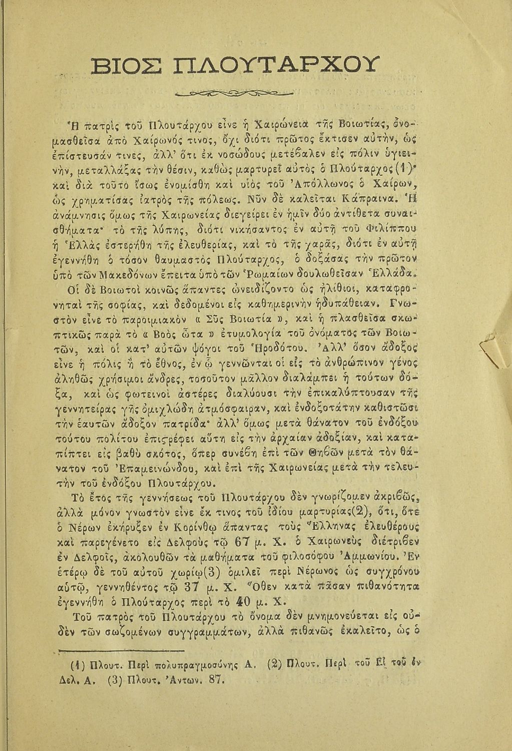 Σχολικό εγχειρίδιο Αρχαίων Ελληνικών για τις Β΄ Γυμνασίου και Γ΄ Αστικού Σχολείου που περιλαμβάνει αποσπάσματα από το έργο του Πλούταρχου Βίοι Παράλληλοι και ερμηνευτικά και πραγματολογικά σχόλια.
