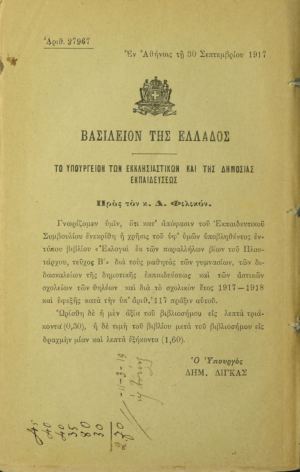 Τίτλος: Εκλογαί εκ των Παραλλήλων Βίων του Πλουτάρχου εκδοθείσαι μετά σημειώσεων προς χρήσιν των μαθητών της Β΄ τάξεως του Γυμνασίου και των μαθητριών της Γ΄ τάξεως των Αστικών Σχολείων των Θηλέων (τεύχος Β΄ )