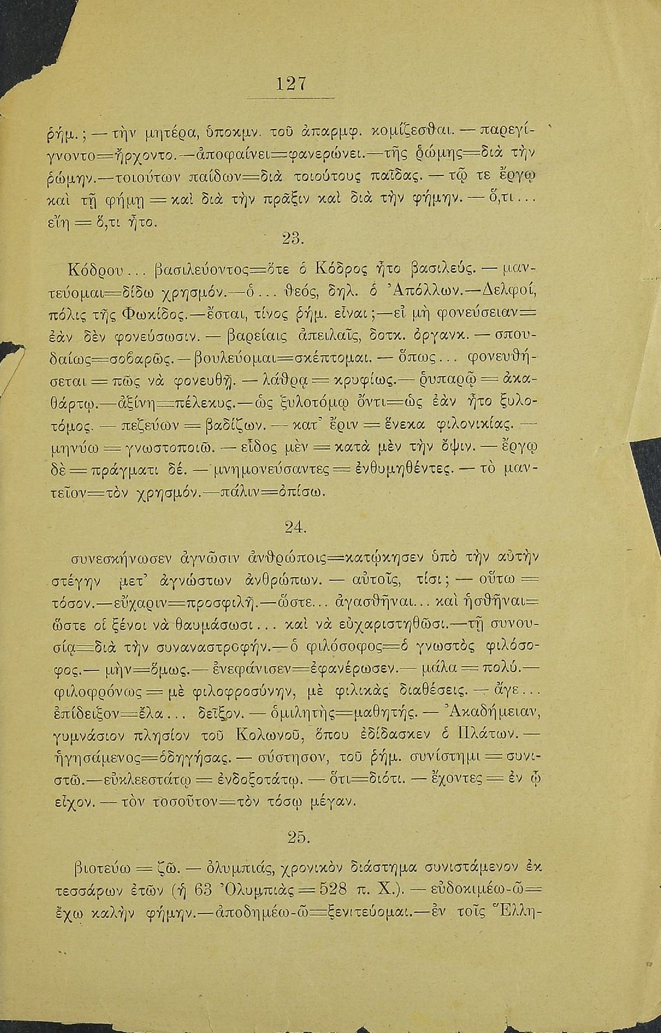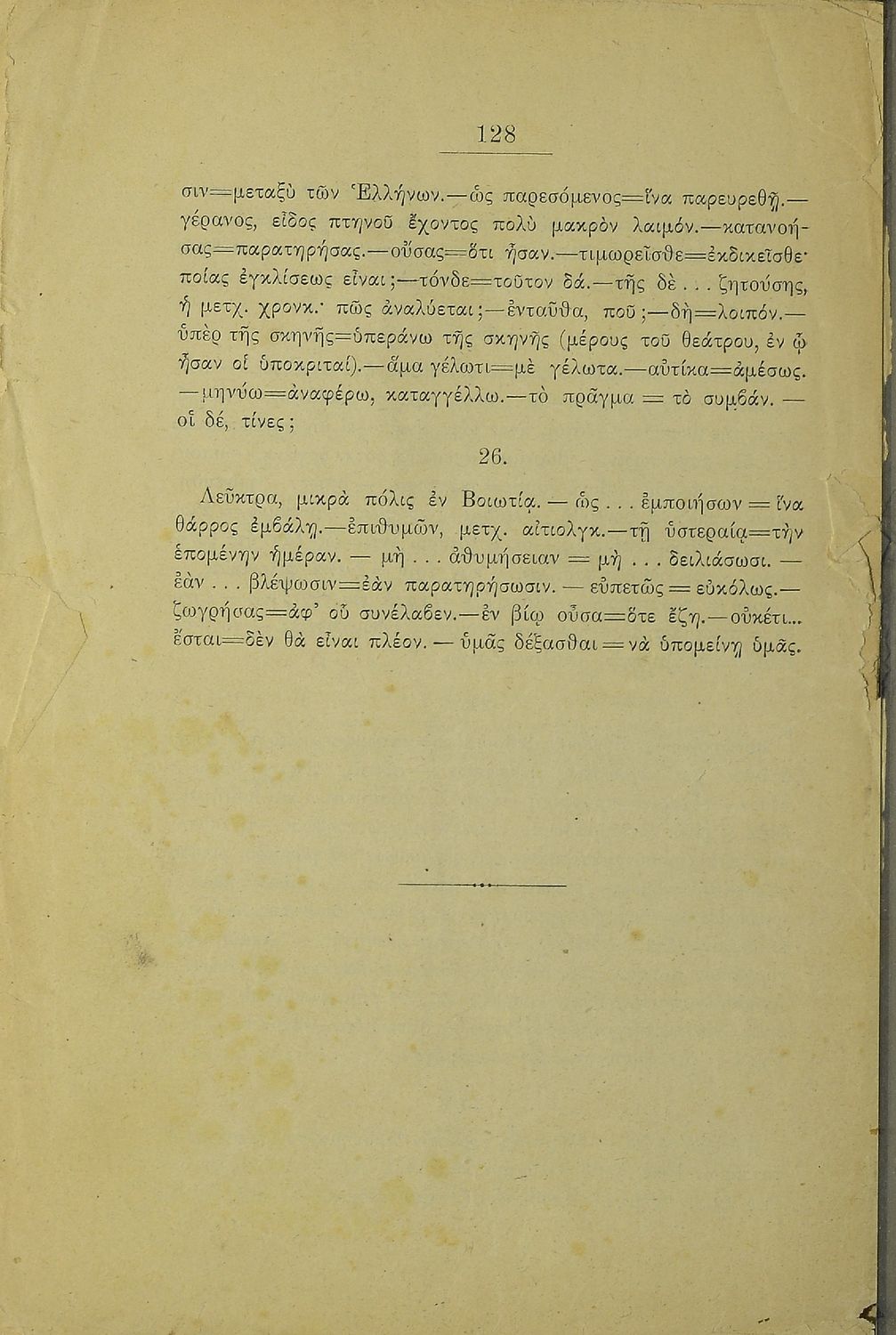 Βαθμίδα εκπαίδευσης: Δευτεροβάθμια Τάξη: Α' Ελληνικού Σχολείου Μάθημα: Αρχαία Ελληνικά Γλώσσα: Καθαρεύουσα Παρουσίαση περιεχομένου: Σχολικό εγχειρίδιο Αρχαίων Ελληνικών Α' Ελληνικού Σχολείου που περιλαμβάνει κείμενα για τη διδασκαλία της γραμματικής της αρχαίας ελληνικής, αποσπάσματα από τους μύθους του Αισώπου και την ελληνική μυθολογία και φράσεις, λεξιλογικά και γραμματικά σχόλια. |