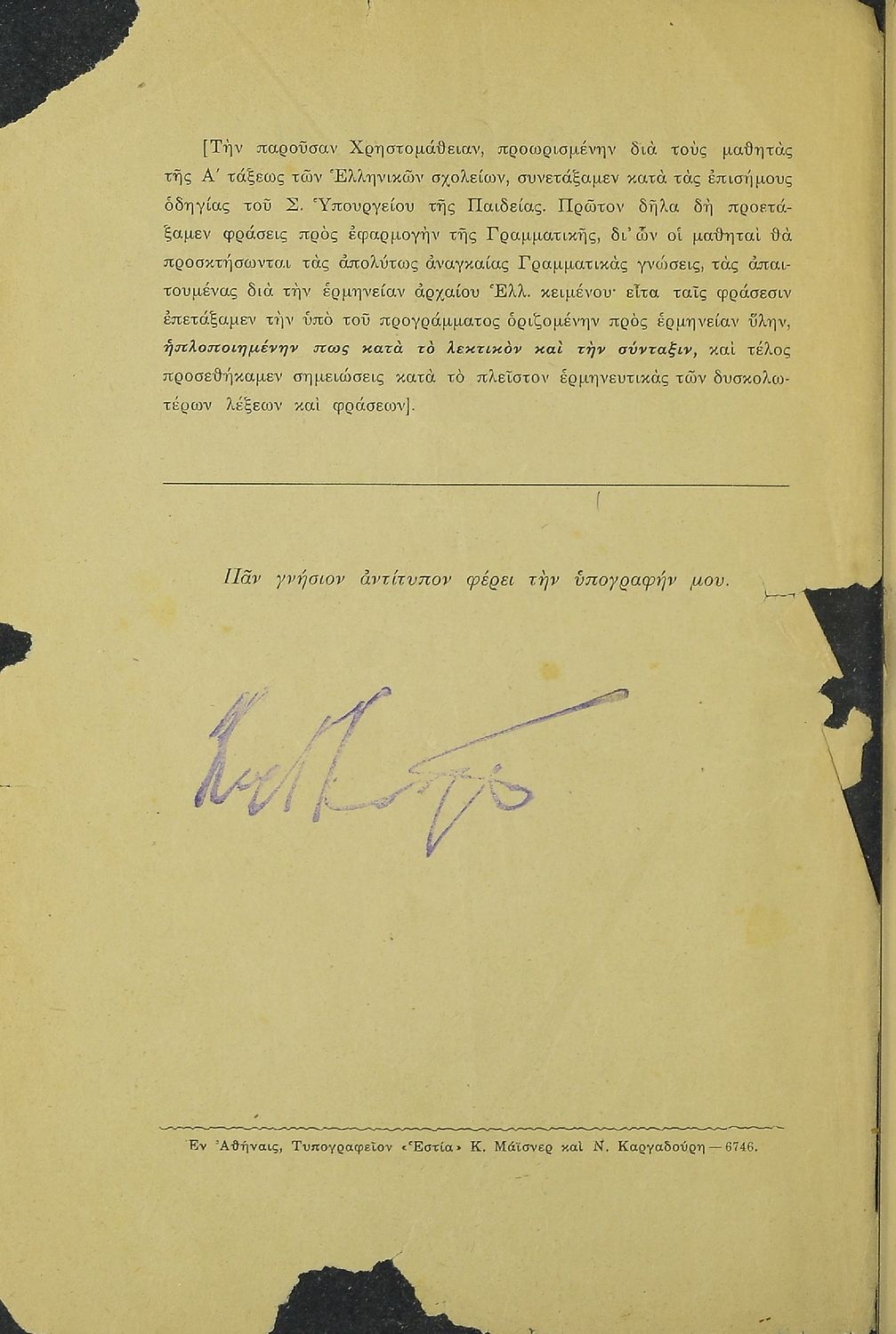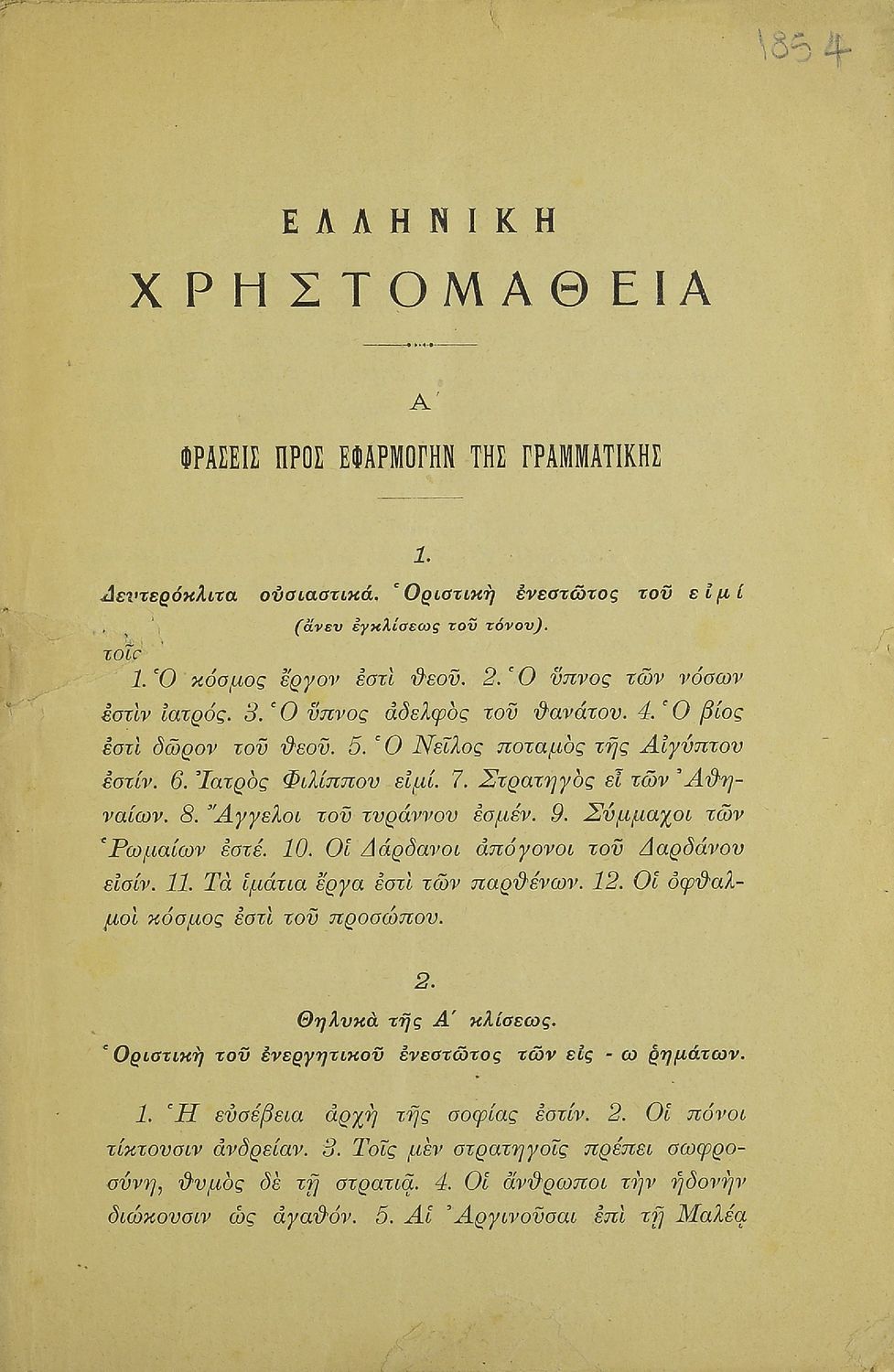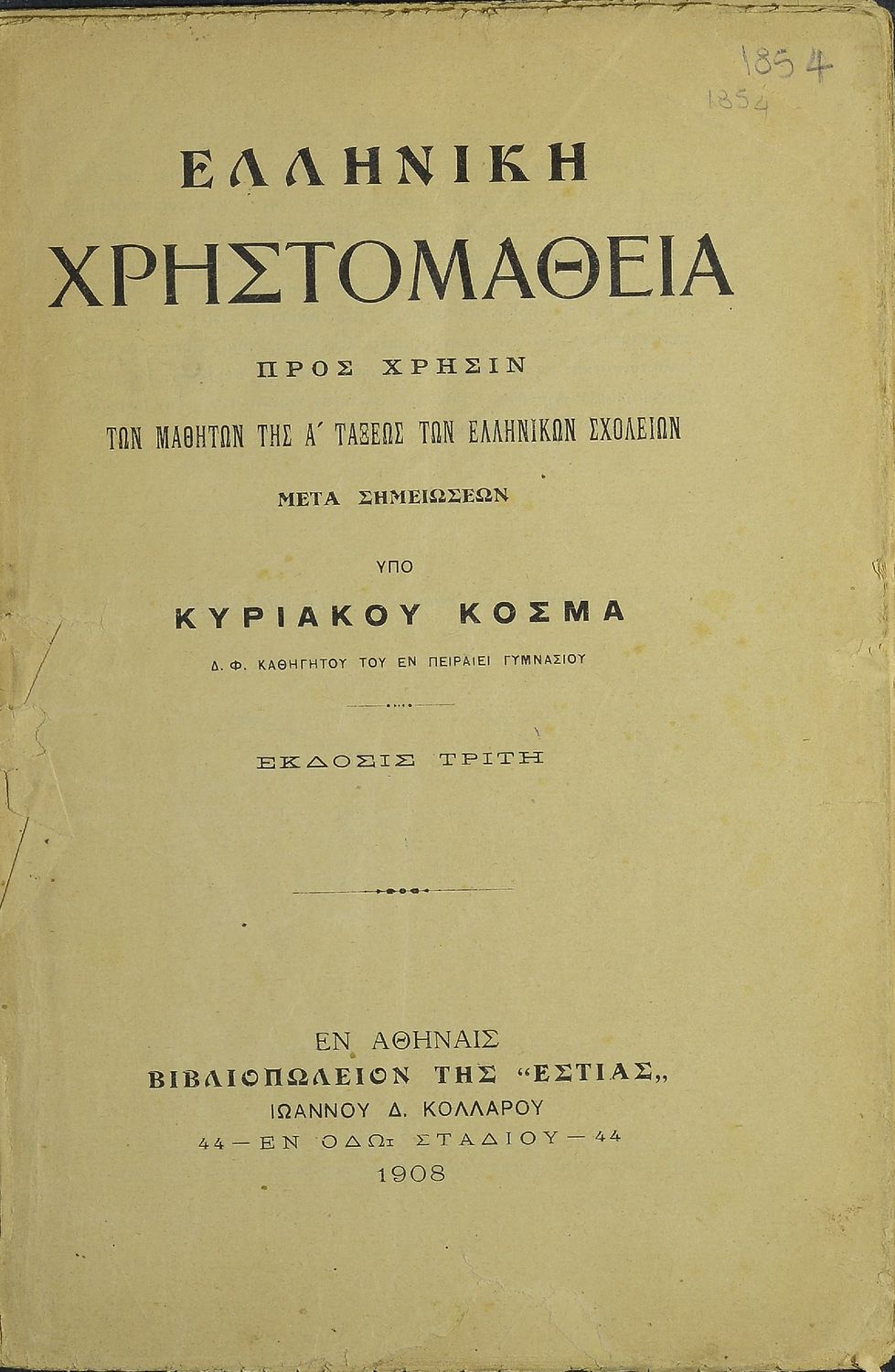 Τίτλος: Ελληνική χρηστομάθεια προς χρήσιν των μαθητών της Α΄ τάξεως των Ελληνικών Σχολείων