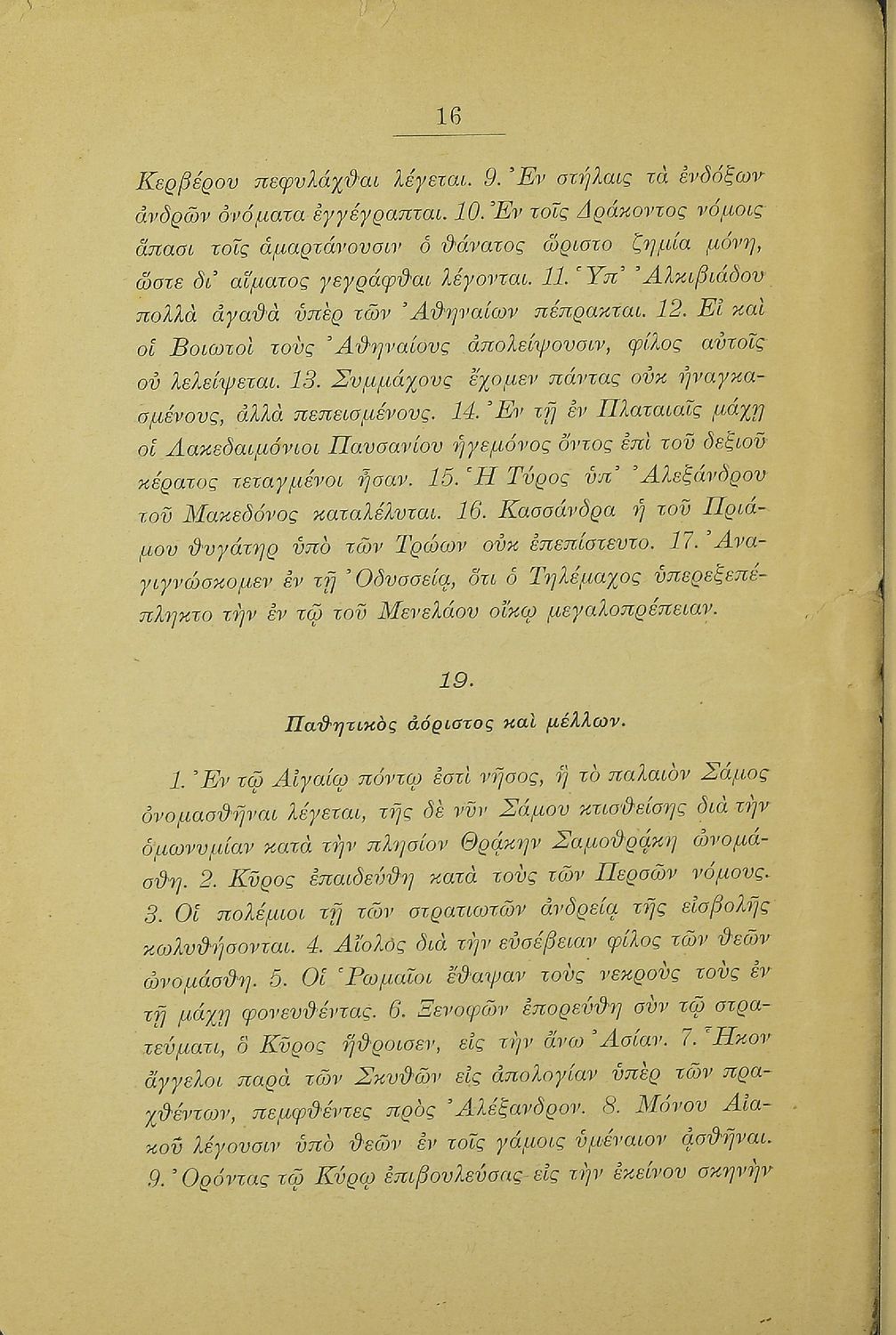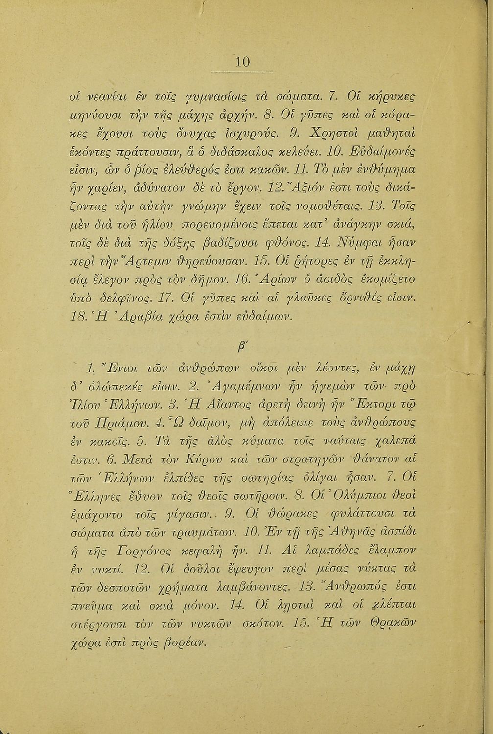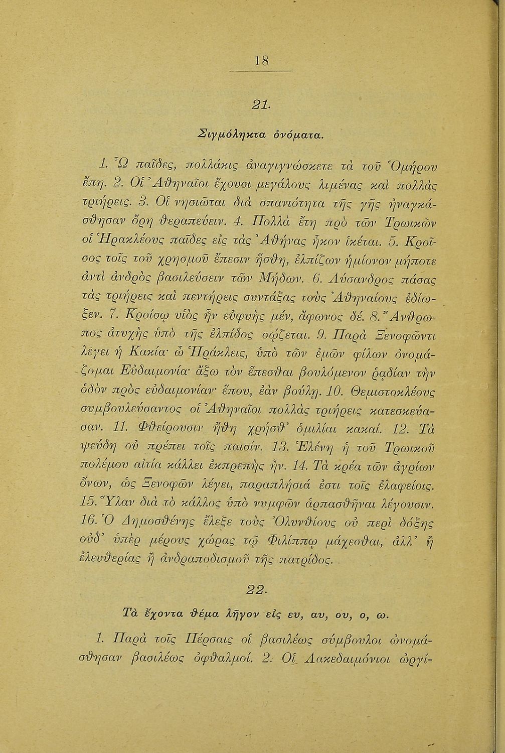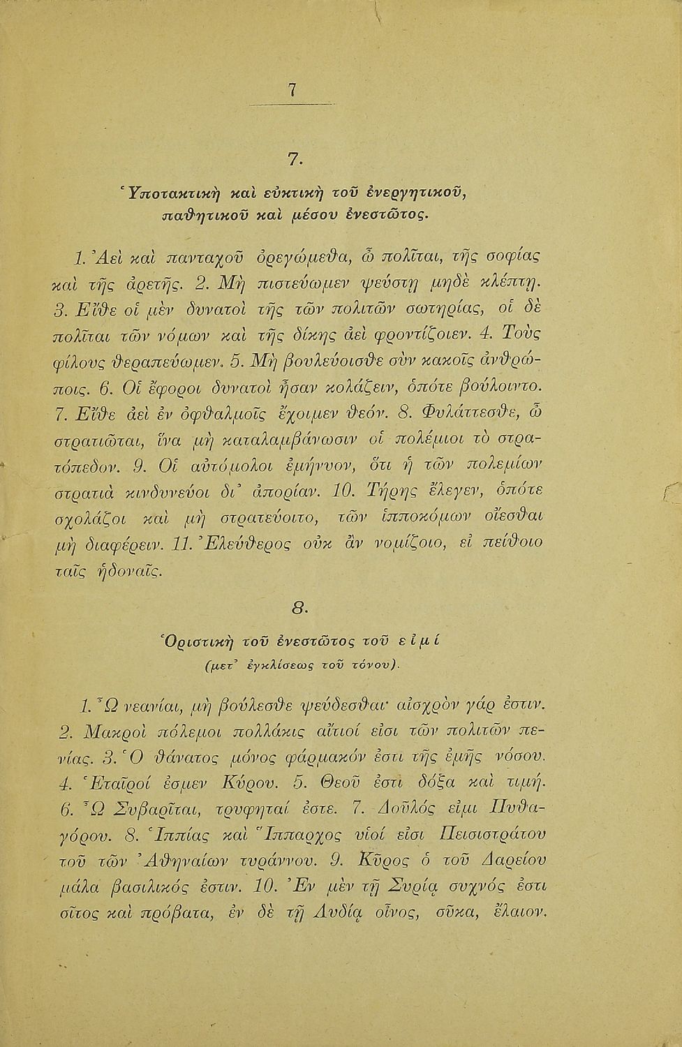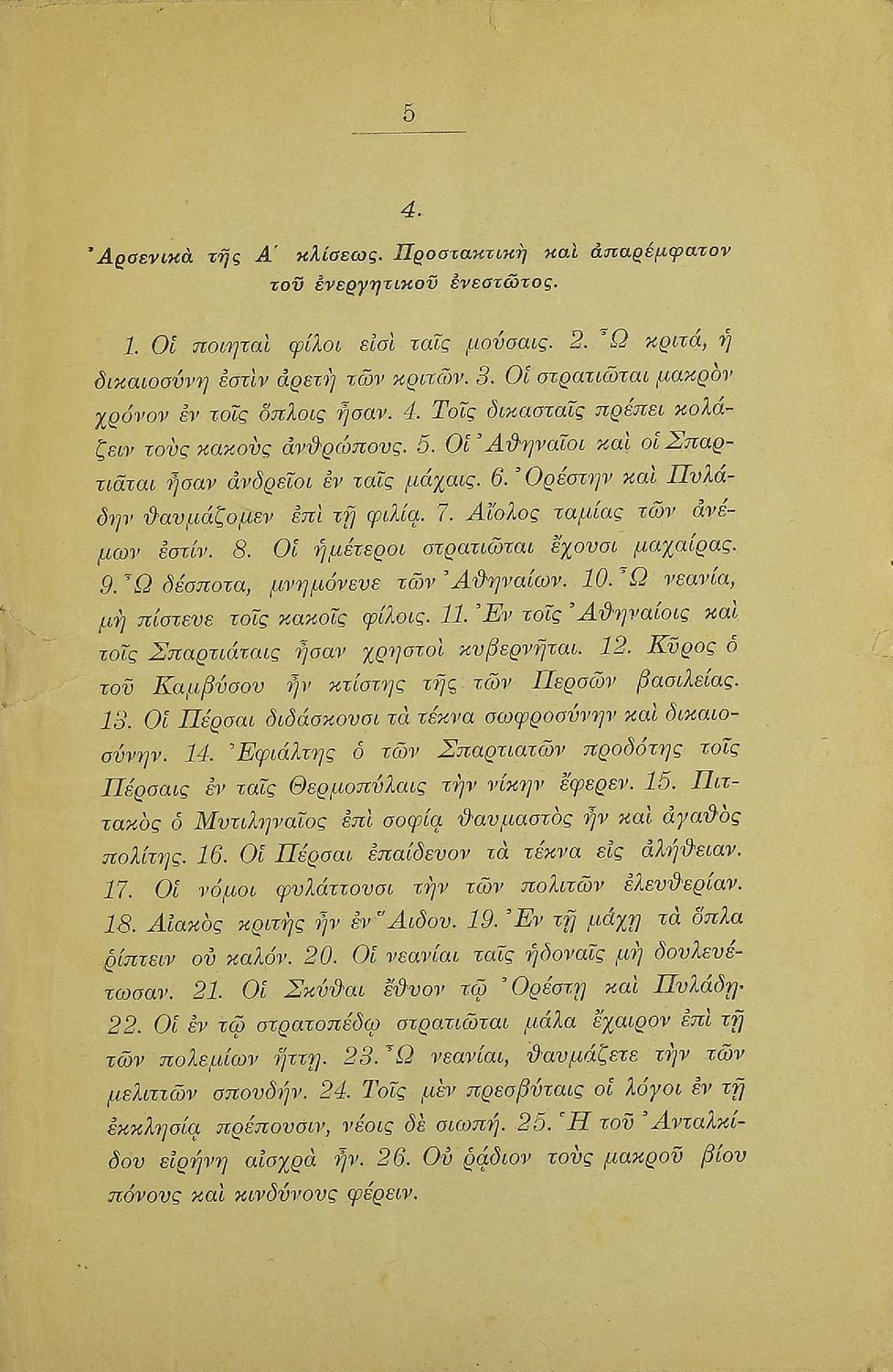 Σχολικό εγχειρίδιο Αρχαίων Ελληνικών Α' Ελληνικού Σχολείου που περιλαμβάνει κείμενα για τη διδασκαλία της γραμματικής της αρχαίας ελληνικής, αποσπάσματα από τους μύθους του Αισώπου και την ελληνική μυθολογία και φράσεις, λεξιλογικά και γραμματικά σχόλια.