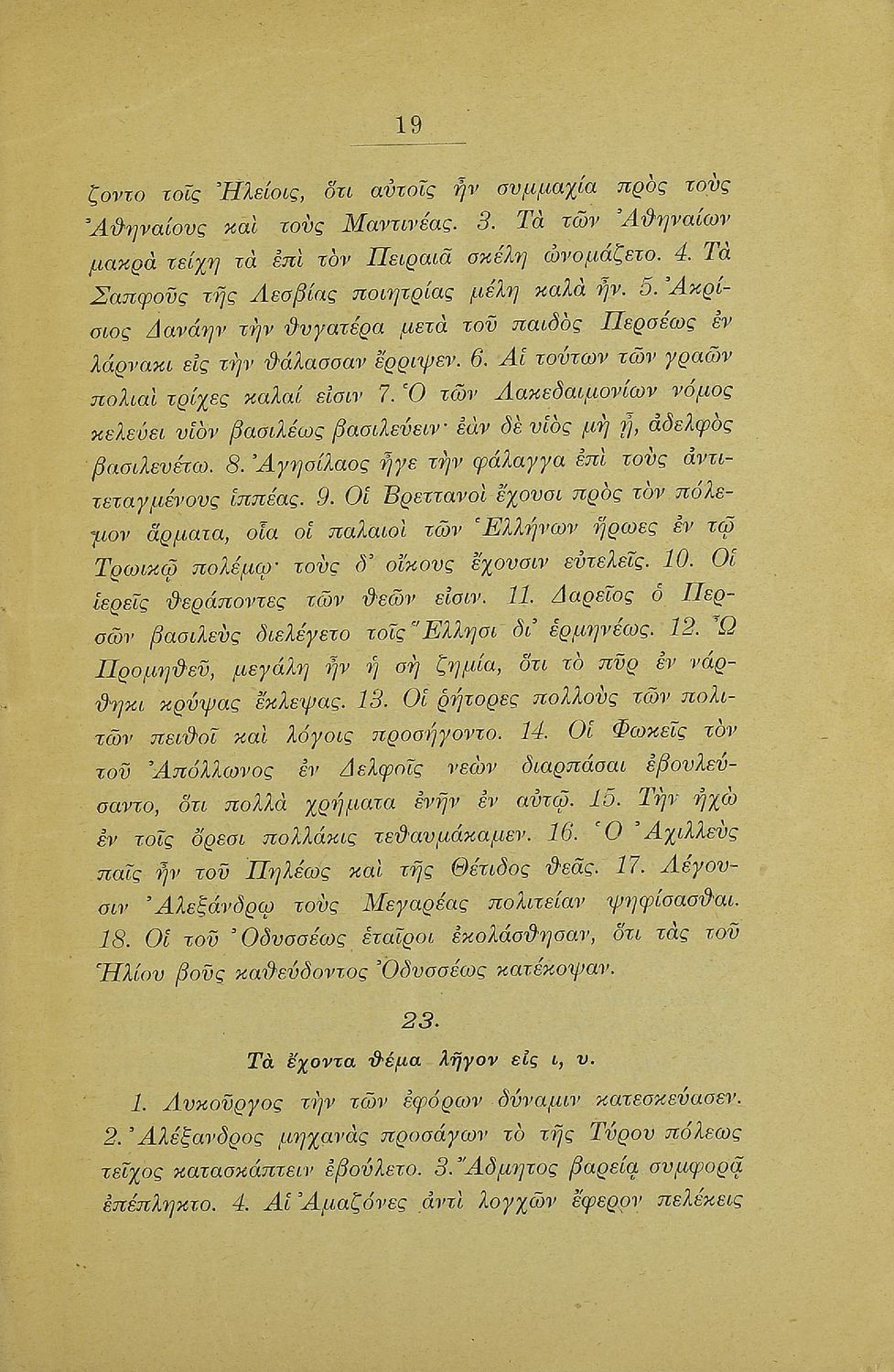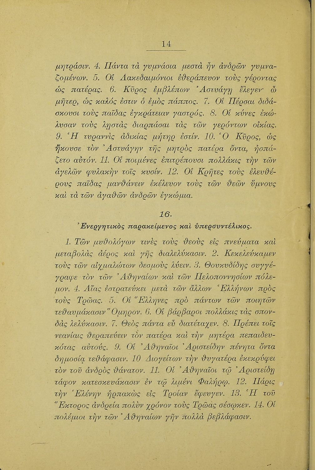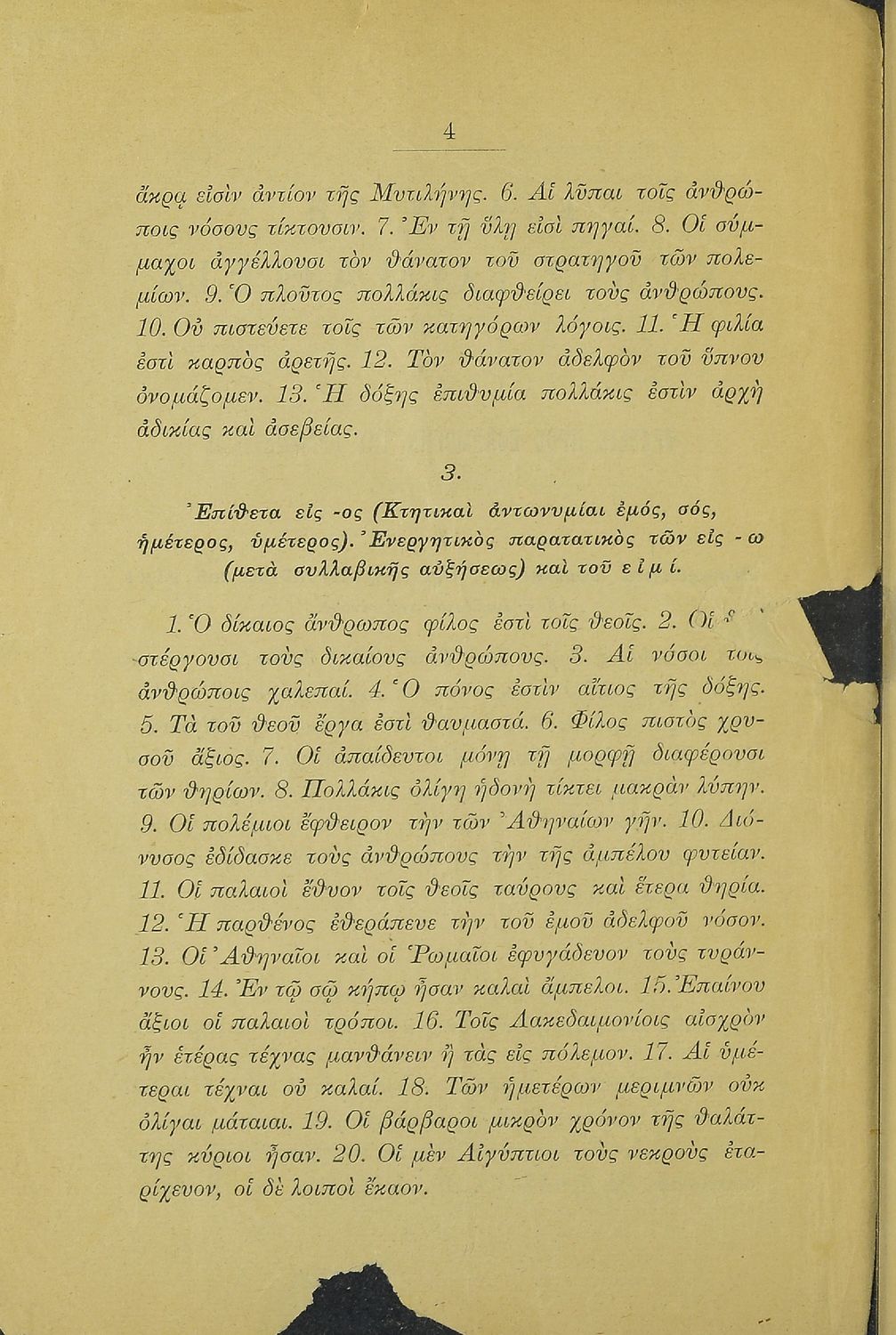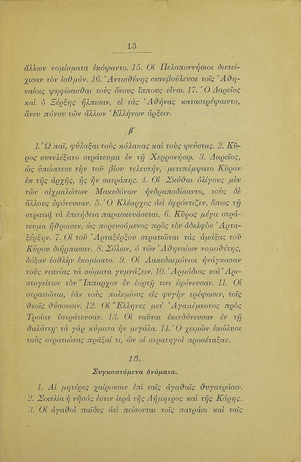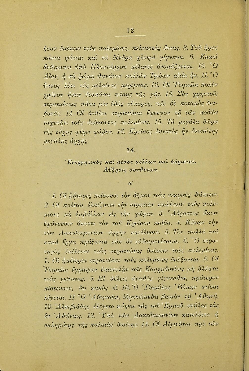 Σχολικό εγχειρίδιο Αρχαίων Ελληνικών Α' Ελληνικού Σχολείου που περιλαμβάνει κείμενα για τη διδασκαλία της γραμματικής της αρχαίας ελληνικής, αποσπάσματα από τους μύθους του Αισώπου και την ελληνική μυθολογία και φράσεις, λεξιλογικά και γραμματικά σχόλια.