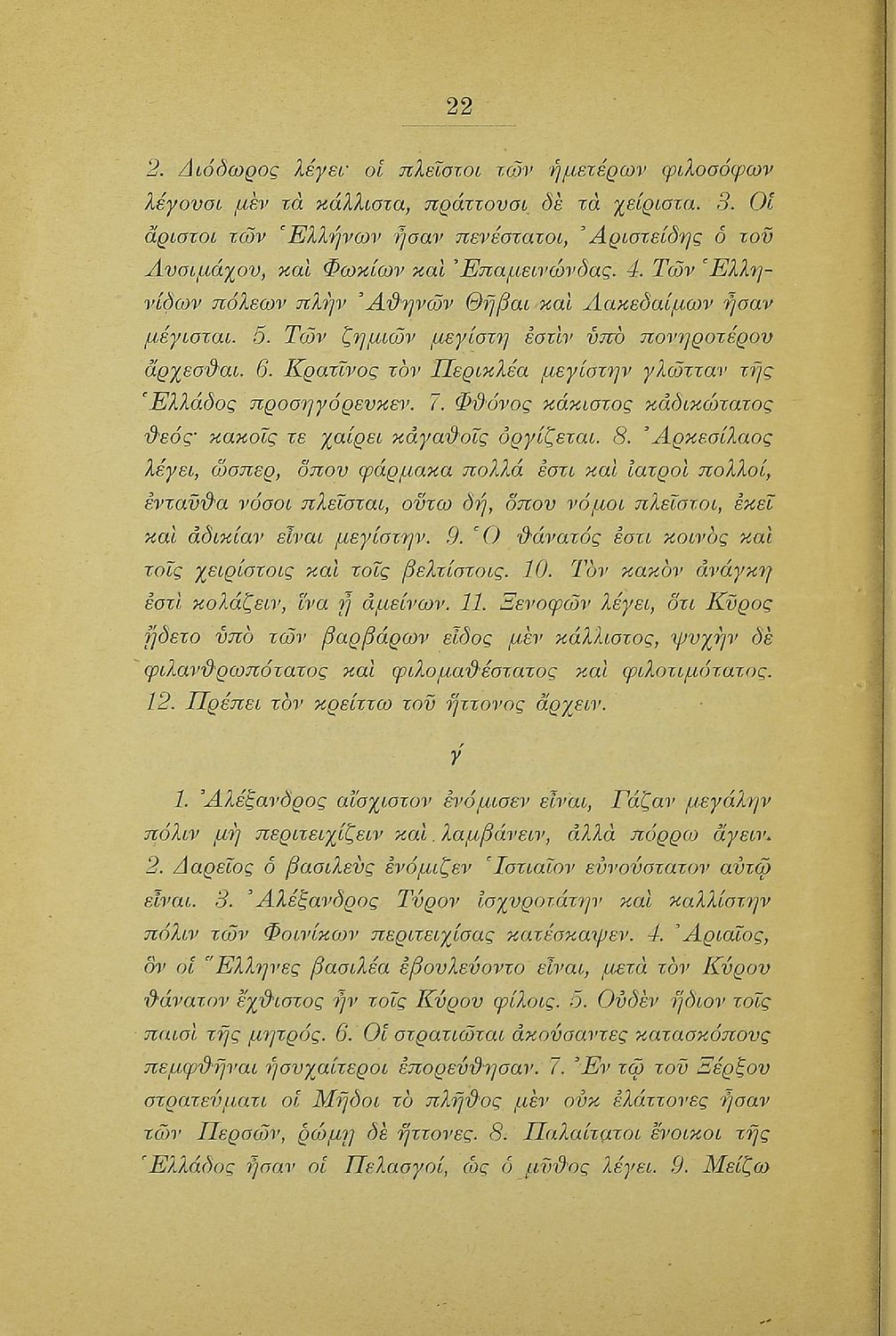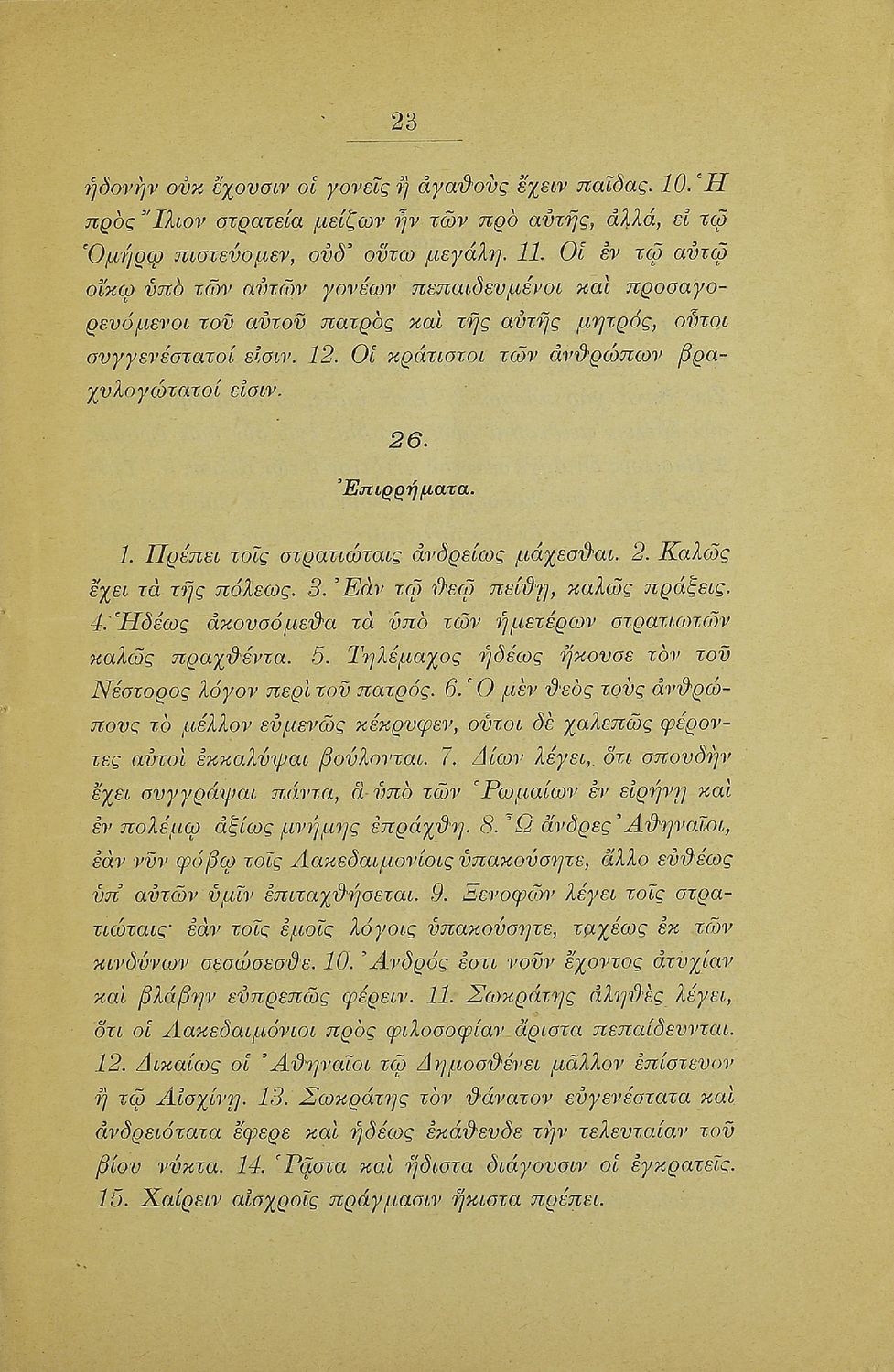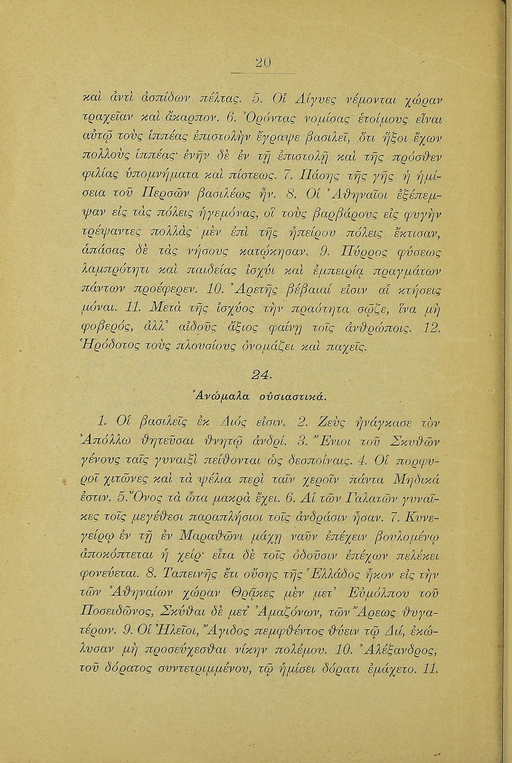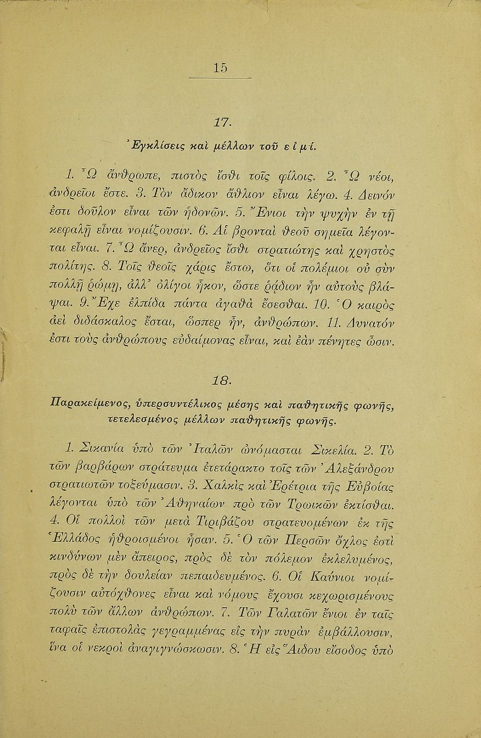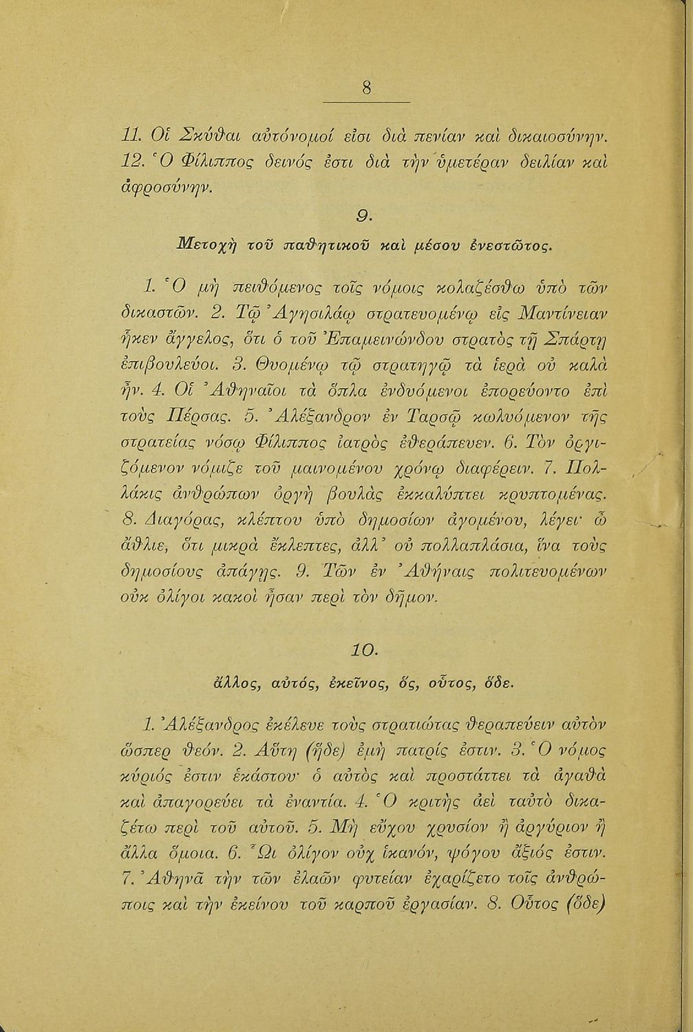 Σχολικό εγχειρίδιο Αρχαίων Ελληνικών Α' Ελληνικού Σχολείου που περιλαμβάνει κείμενα για τη διδασκαλία της γραμματικής της αρχαίας ελληνικής, αποσπάσματα από τους μύθους του Αισώπου και την ελληνική μυθολογία και φράσεις, λεξιλογικά και γραμματικά σχόλια.