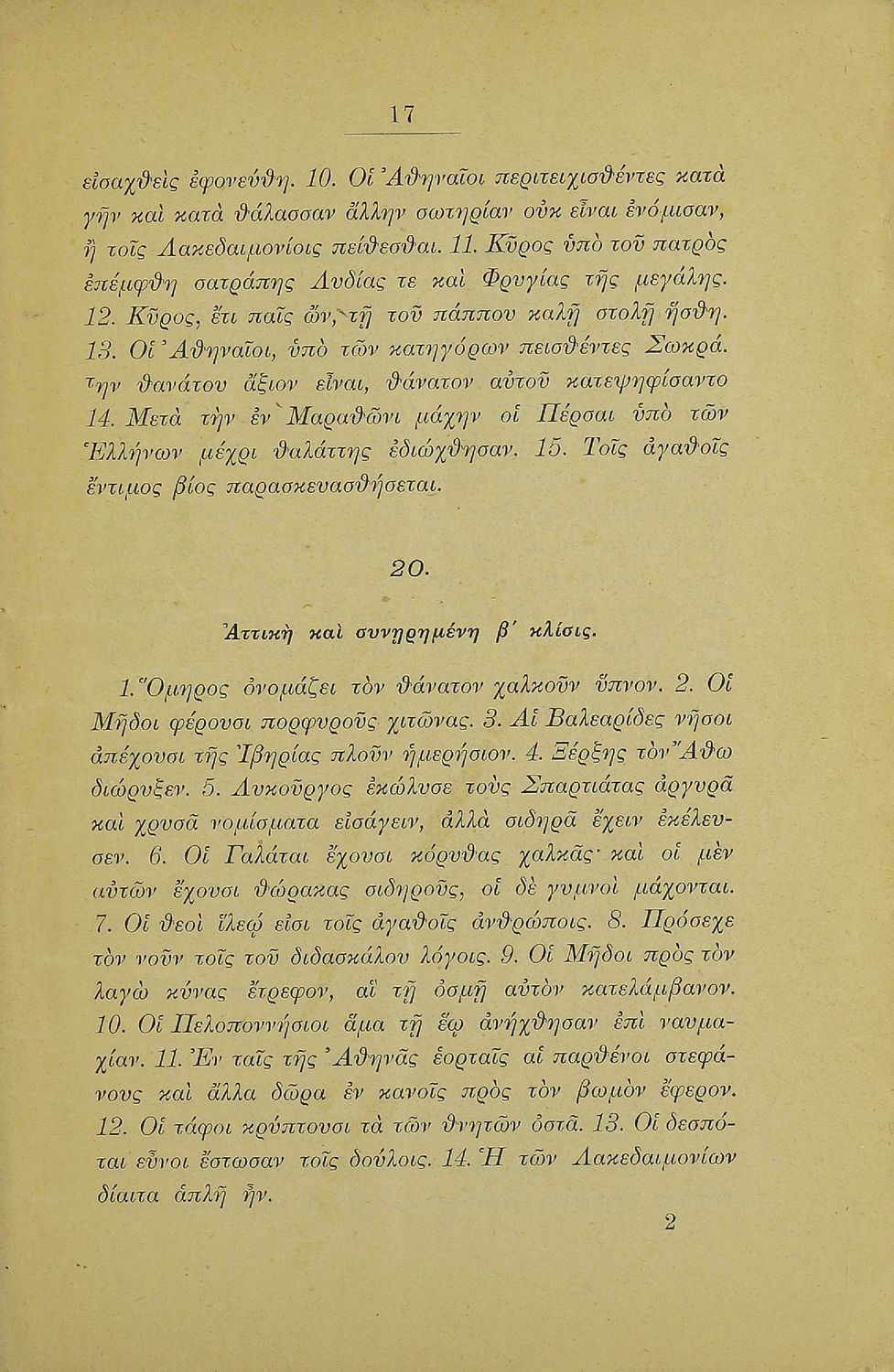 Σχολικό εγχειρίδιο Αρχαίων Ελληνικών Β' Ελληνικού Σχολείου που περιλαμβάνει αποσπάσματα από το έργο του Ξενοφώντα Κύρου Ανάβασις, ερμηνευτικές, γλωσσικές, γραμματικές και συντακτικές παρατηρήσεις, και ασκήσεις
