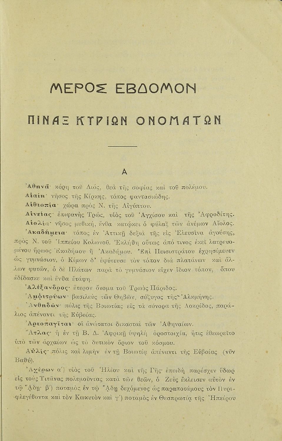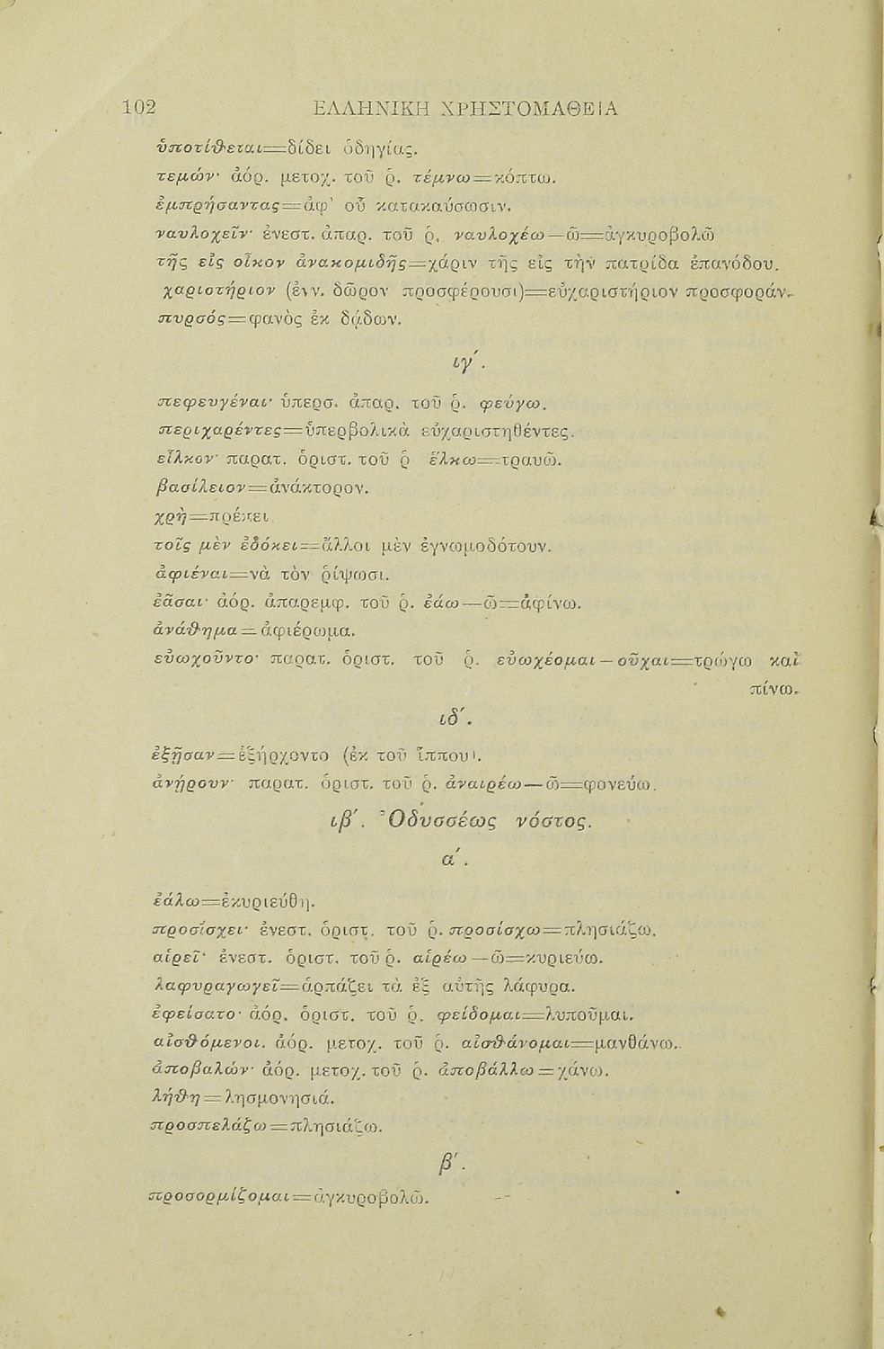 Σχολικό εγχειρίδιο Αρχαίων Ελληνικών για τις Ε΄ Δημοτικού και Α' Ελληνικού Σχολείου που περιλαμβάνει σύντομα διηγήματα εμπνευσμένα από τους μύθους του Αισώπου, περιγραφές ελληνικών πόλεων, επιστολές και ιστορίες από την ελληνική μυθολογία. Περιέχει ερμηνευτικές σημειώσεις, πίνακα κυριοτέρων ονομάτων και ηθικά πορίσματα.