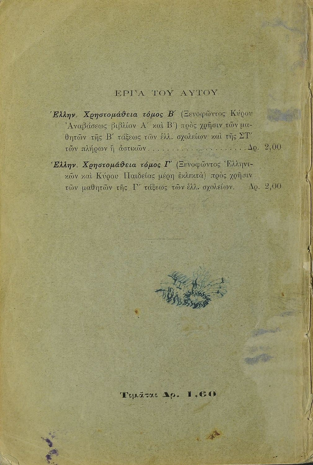 Σχολικό εγχειρίδιο Αρχαίων Ελληνικών Γ' Ελληνικού Σχολείου που περιλαμβάνει αποσπάσματα από το έργο του Ξενοφώντα Ελληνικά και τα έργα του Λουκιανού Ενύπνιον και Ανάχαρσις, βιογραφικά σημειώματα των ...