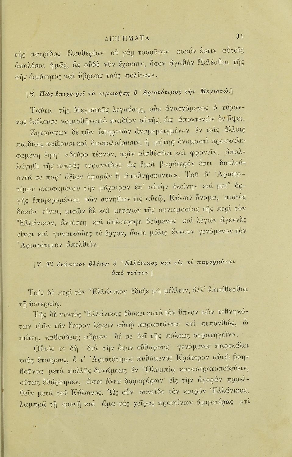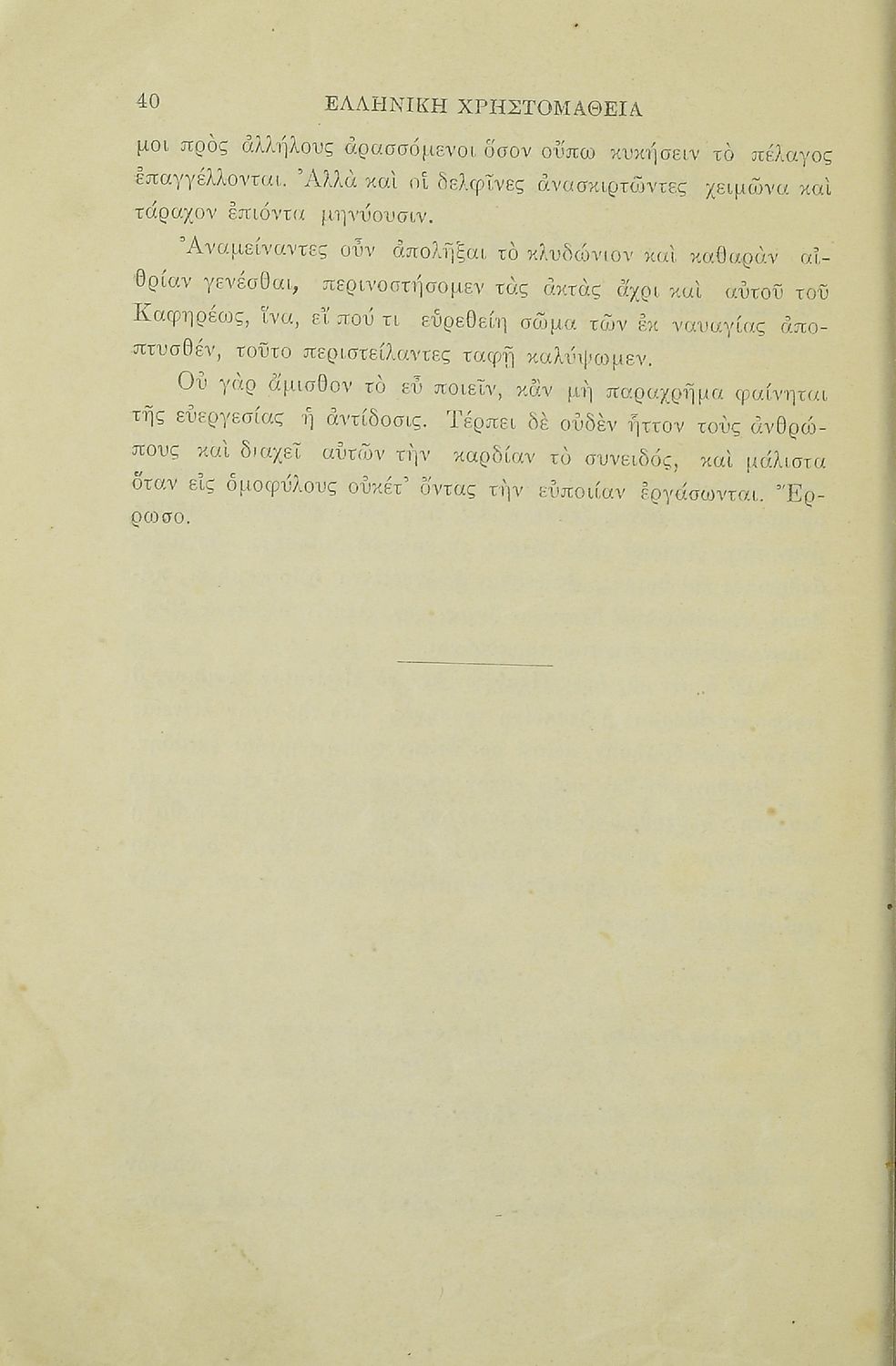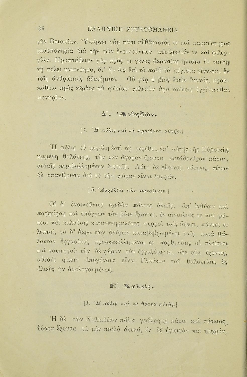 Βαθμίδα εκπαίδευσης: Πρωτοβάθμια, Δευτεροβάθμια Τάξη: Ε' Δημοτικού / Α' Ελληνικού Σχολείου Μάθημα: Αρχαία Ελληνικά Γλώσσα: Καθαρεύουσα Παρουσίαση περιεχομένου: Σχολικό εγχειρίδιο Αρχαίων Ελληνικών για τις Ε΄ Δημοτικού και Α' Ελληνικού Σχολείου που περιλαμβάνει σύντομα διηγήματα εμπνευσμένα από τους μύθους του Αισώπου, περιγραφές ελληνικών πόλεων, επιστολές και ιστορίες από την ελληνική μυθολογία. Περιέχει ερμηνευτικές σημειώσεις, πίνακα κυριοτέρων ονομάτων και ηθικά πορίσματα. |