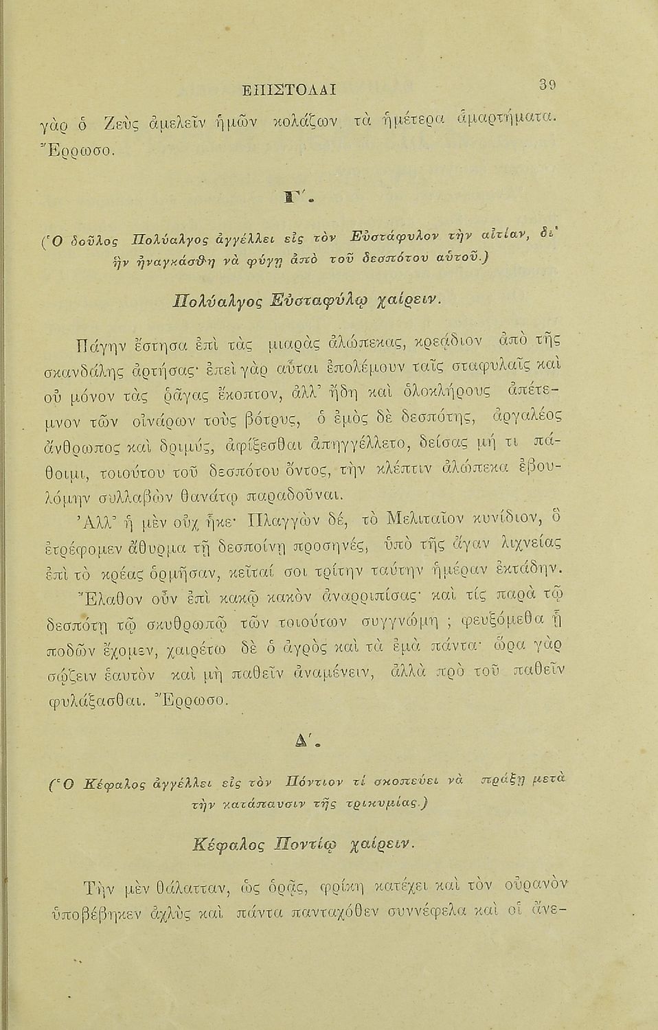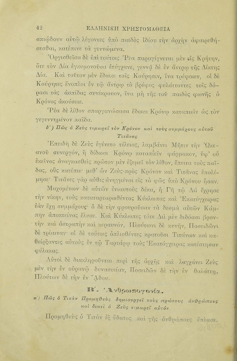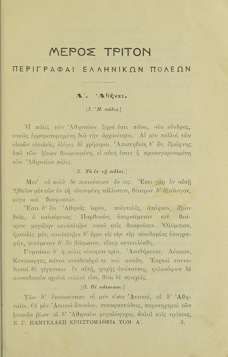 Σχολικό εγχειρίδιο Αρχαίων Ελληνικών για τις Ε΄ Δημοτικού και Α' Ελληνικού Σχολείου που περιλαμβάνει σύντομα διηγήματα εμπνευσμένα από τους μύθους του Αισώπου, περιγραφές ελληνικών πόλεων, επιστολές και ιστορίες από την ελληνική μυθολογία. Περιέχει ερμηνευτικές σημειώσεις, πίνακα κυριοτέρων ονομάτων και ηθικά πορίσματα.