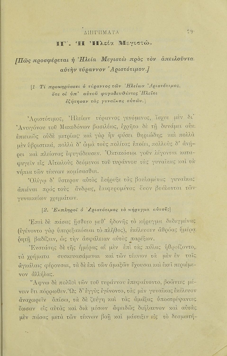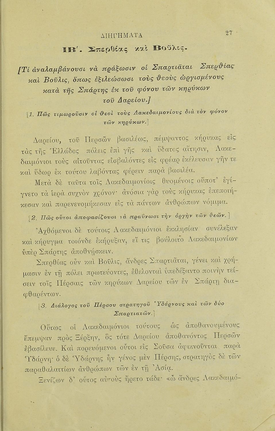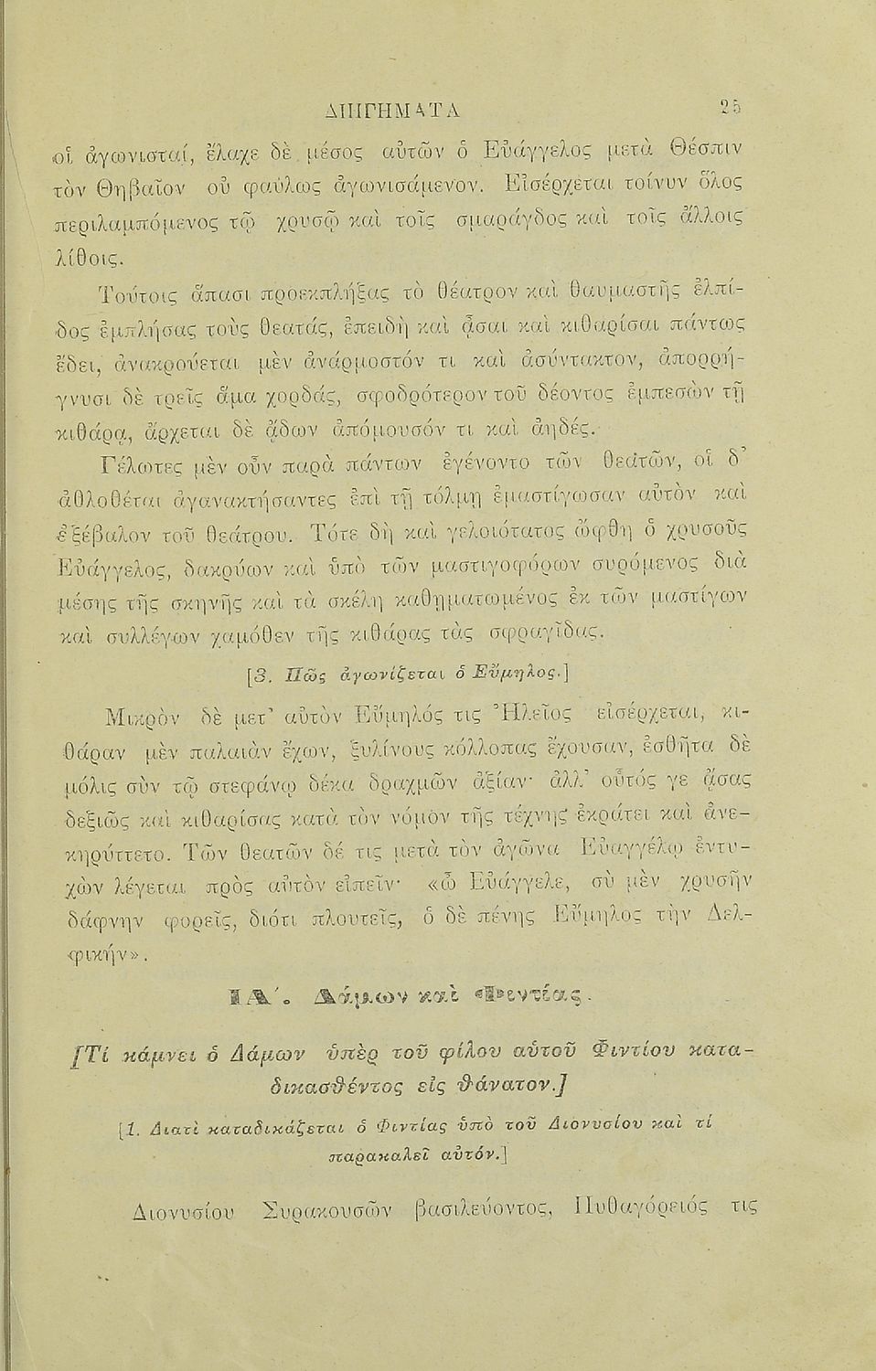 Σχολικό εγχειρίδιο Αρχαίων Ελληνικών για τις Ε΄ Δημοτικού και Α' Ελληνικού Σχολείου που περιλαμβάνει σύντομα διηγήματα εμπνευσμένα από τους μύθους του Αισώπου, περιγραφές ελληνικών πόλεων, επιστολές και ιστορίες από την ελληνική μυθολογία. Περιέχει ερμηνευτικές σημειώσεις, πίνακα κυριοτέρων ονομάτων και ηθικά πορίσματα.