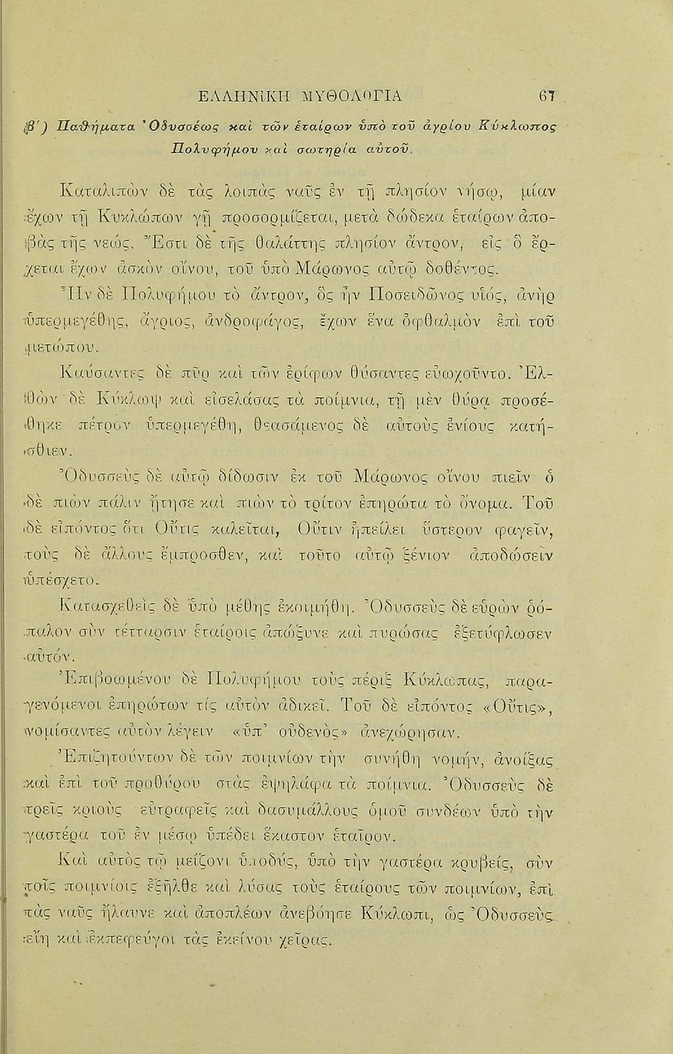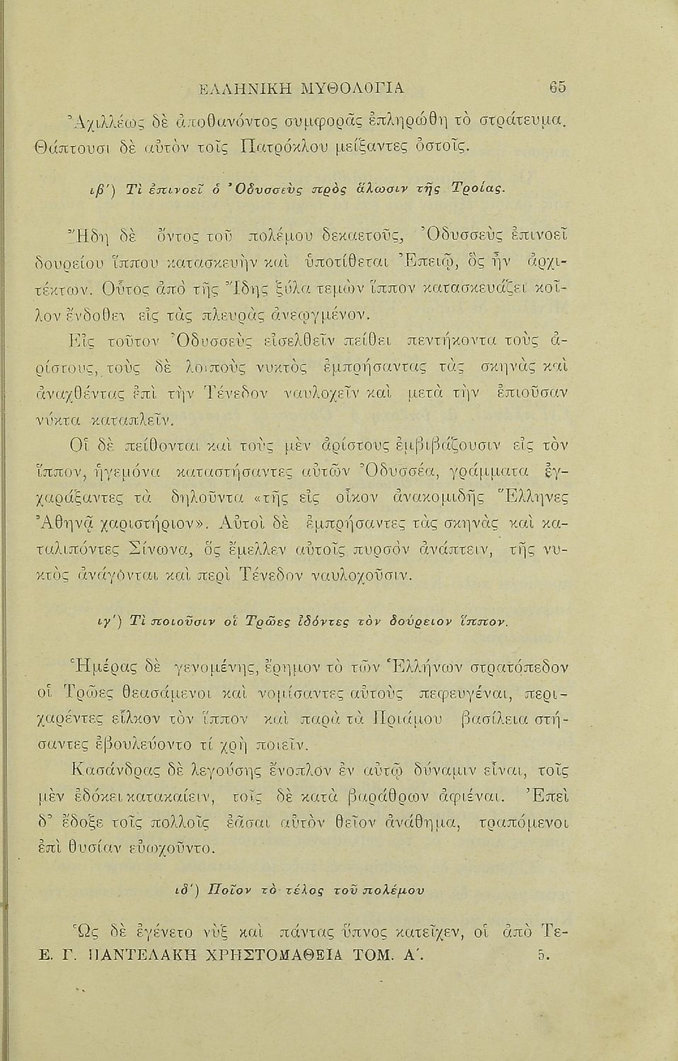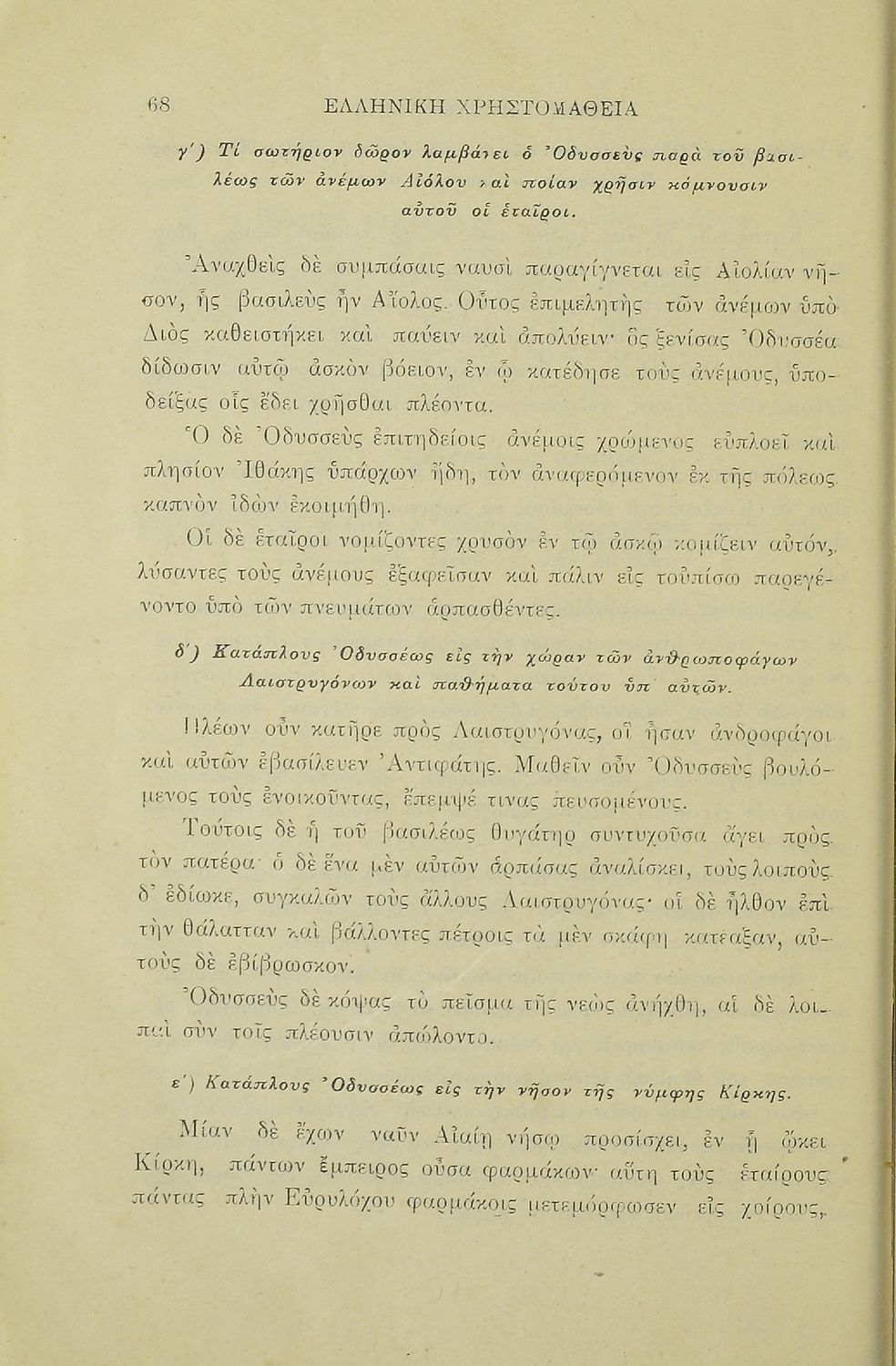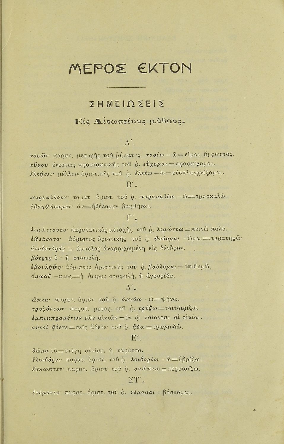 Σχολικό εγχειρίδιο Αρχαίων Ελληνικών για τις Ε΄ Δημοτικού και Α' Ελληνικού Σχολείου που περιλαμβάνει σύντομα διηγήματα εμπνευσμένα από τους μύθους του Αισώπου, περιγραφές ελληνικών πόλεων, επιστολές και ιστορίες από την ελληνική μυθολογία. Περιέχει ερμηνευτικές σημειώσεις, πίνακα κυριοτέρων ονομάτων και ηθικά πορίσματα.