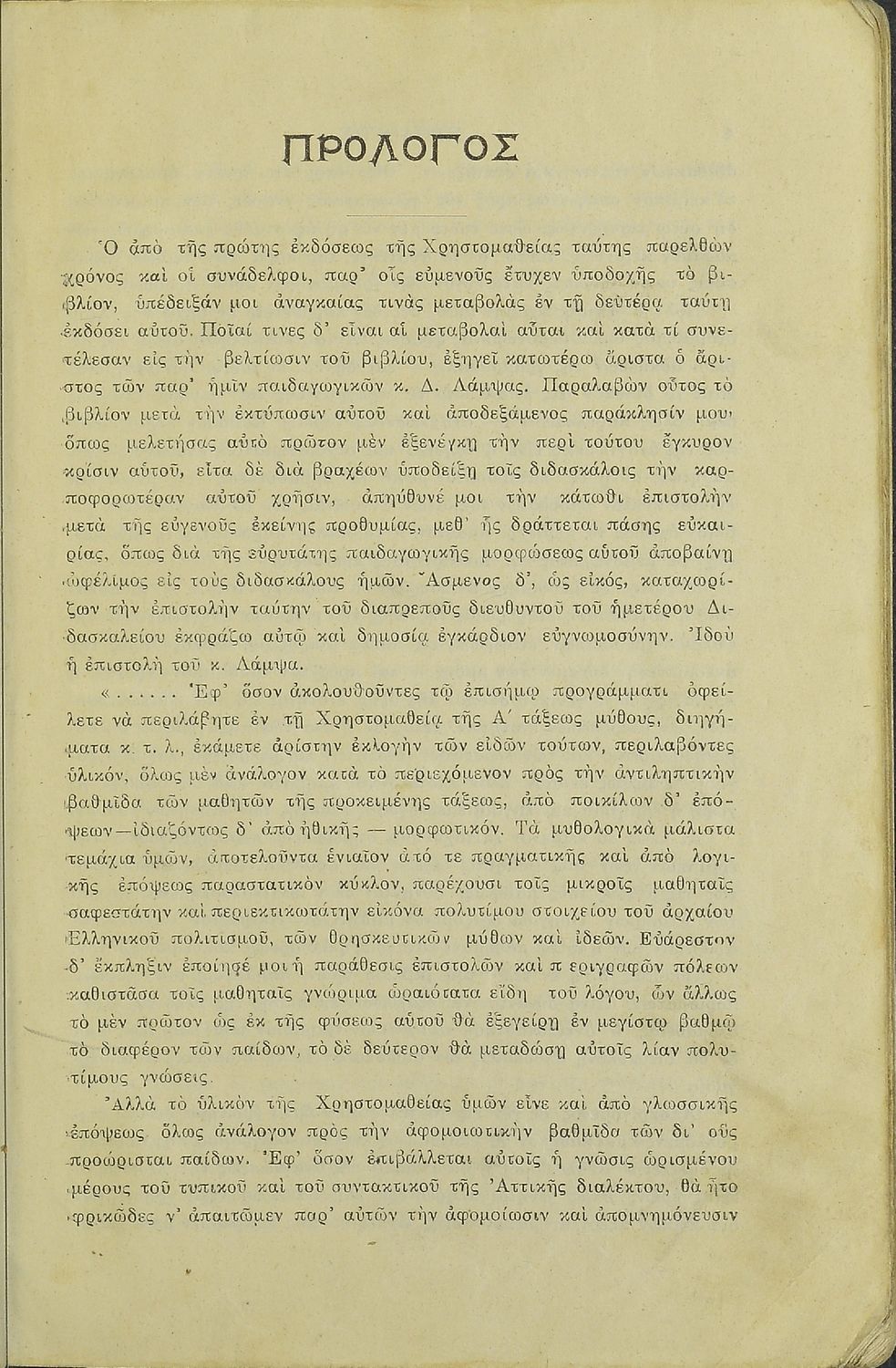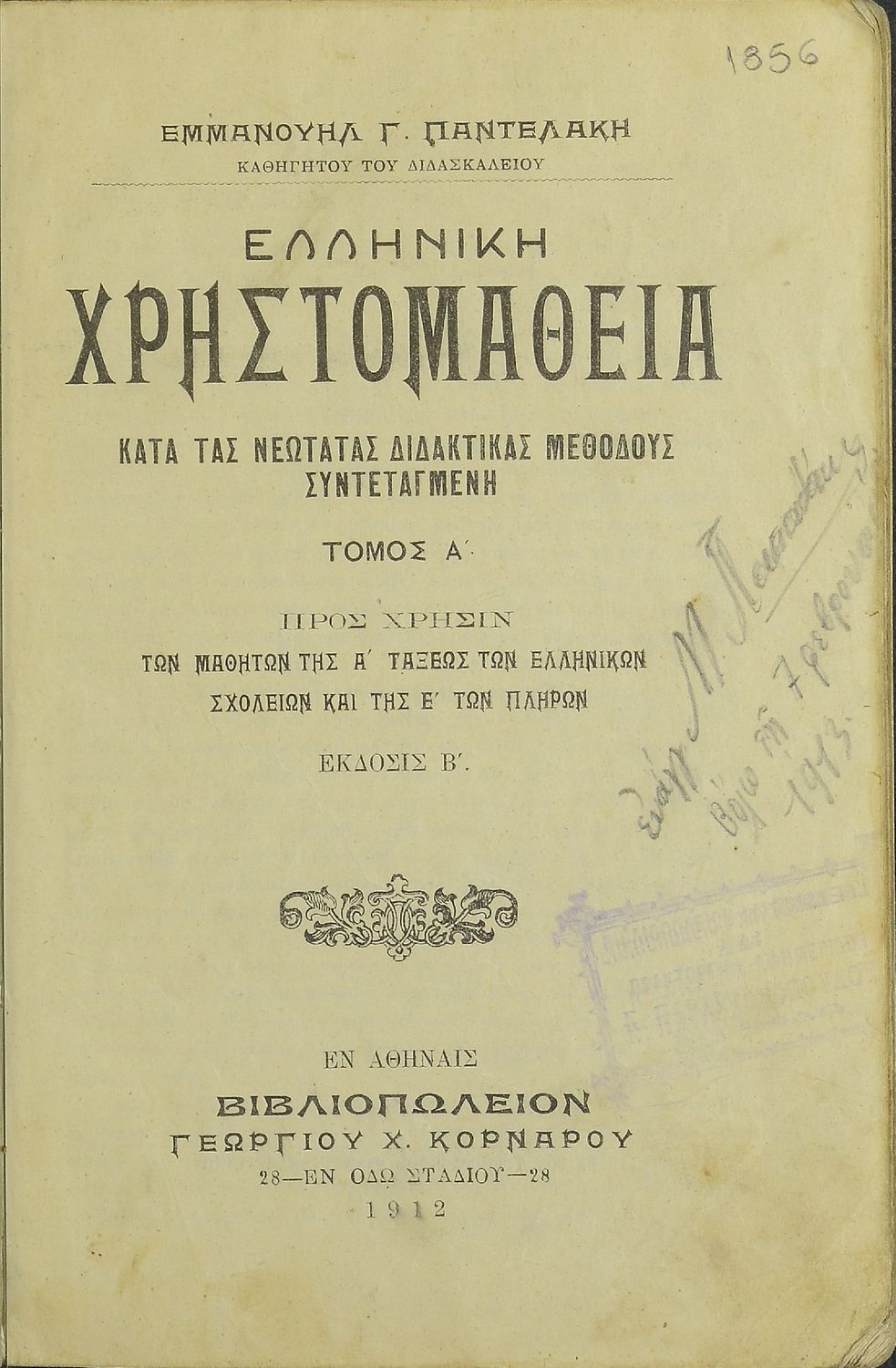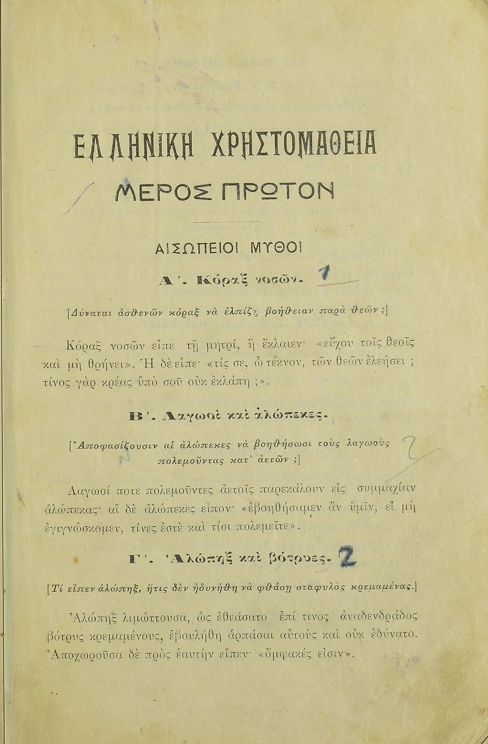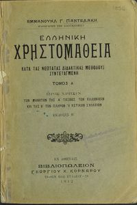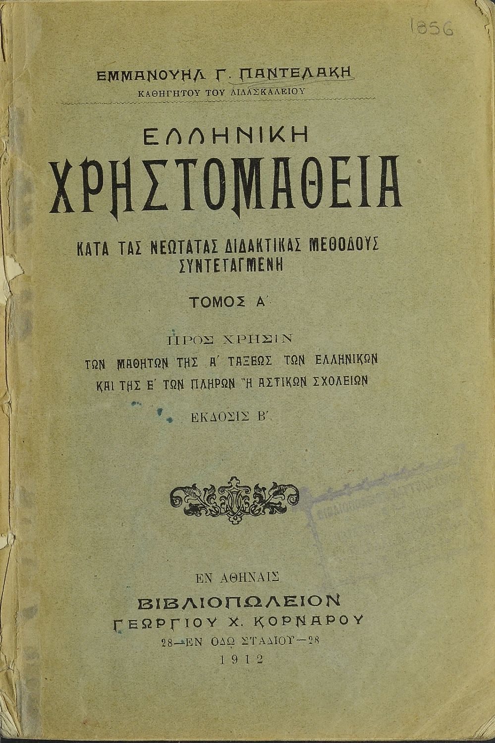 Τίτλος: Ελληνική χρηστομάθεια κατά τας νεώτατας διδακτικάς μεθόδους συντεταγμένη τόμος Α΄, προς χρήσιν της Α΄ τάξεως των Ελληνικών και της Ε΄ των Πλήρων