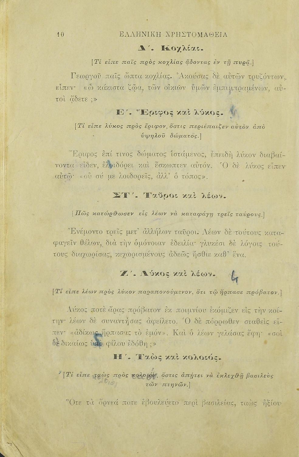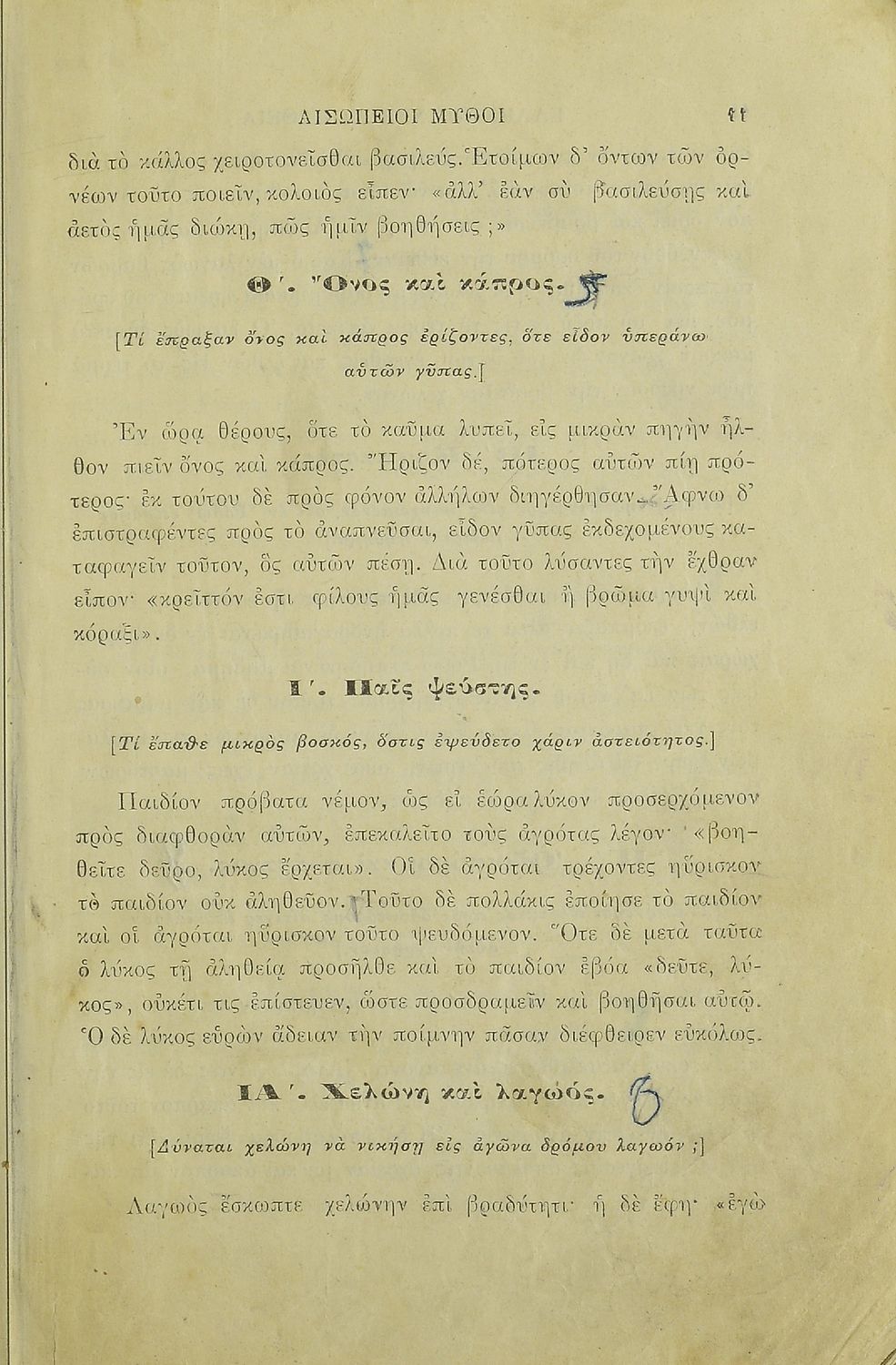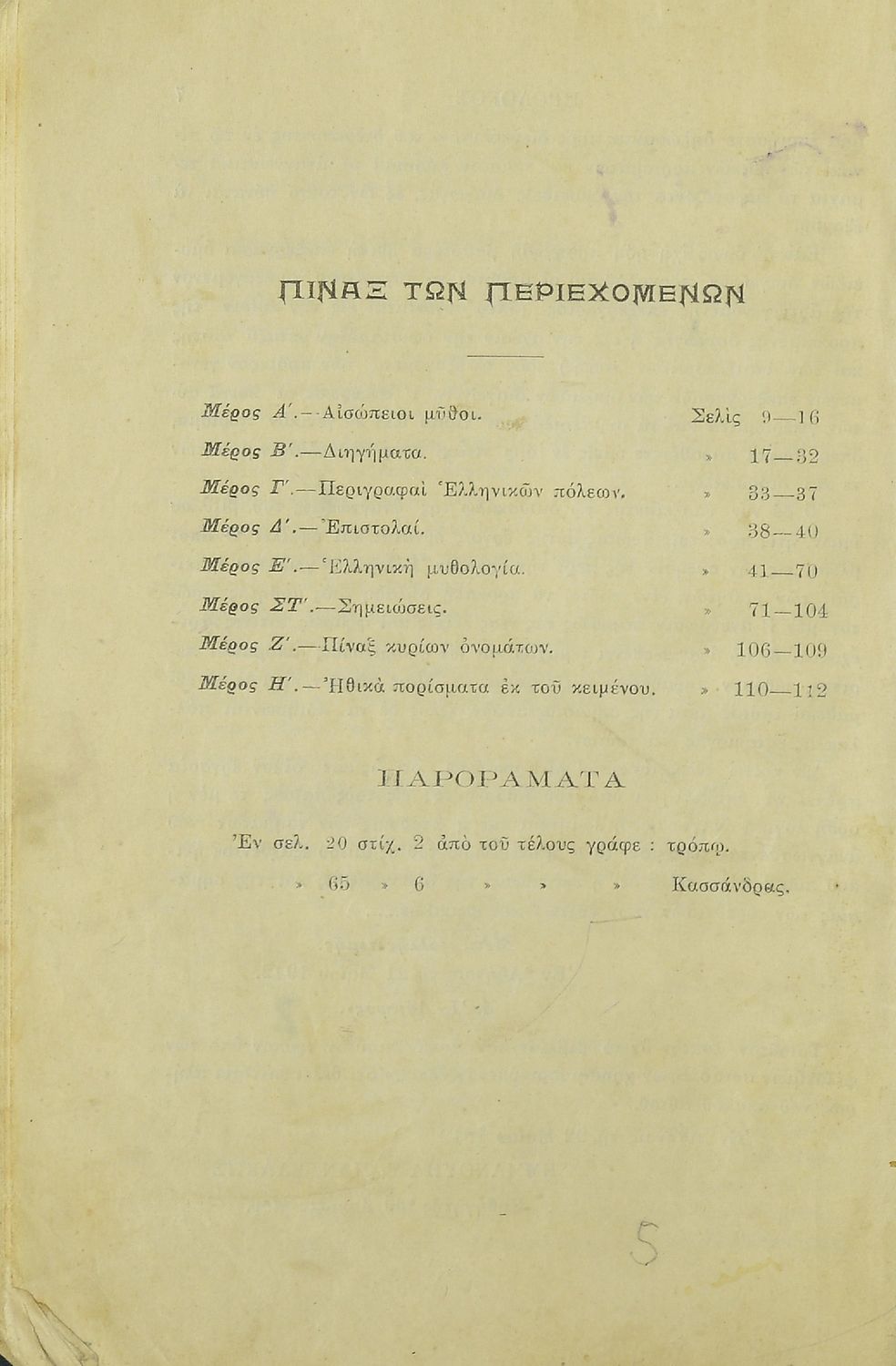 Σχολικό εγχειρίδιο Αρχαίων Ελληνικών για τις Ε΄ Δημοτικού και Α' Ελληνικού Σχολείου που περιλαμβάνει σύντομα διηγήματα εμπνευσμένα από τους μύθους του Αισώπου, περιγραφές ελληνικών πόλεων, επιστολές και ιστορίες από την ελληνική μυθολογία. Περιέχει ερμηνευτικές σημειώσεις, πίνακα κυριοτέρων ονομάτων και ηθικά πορίσματα.