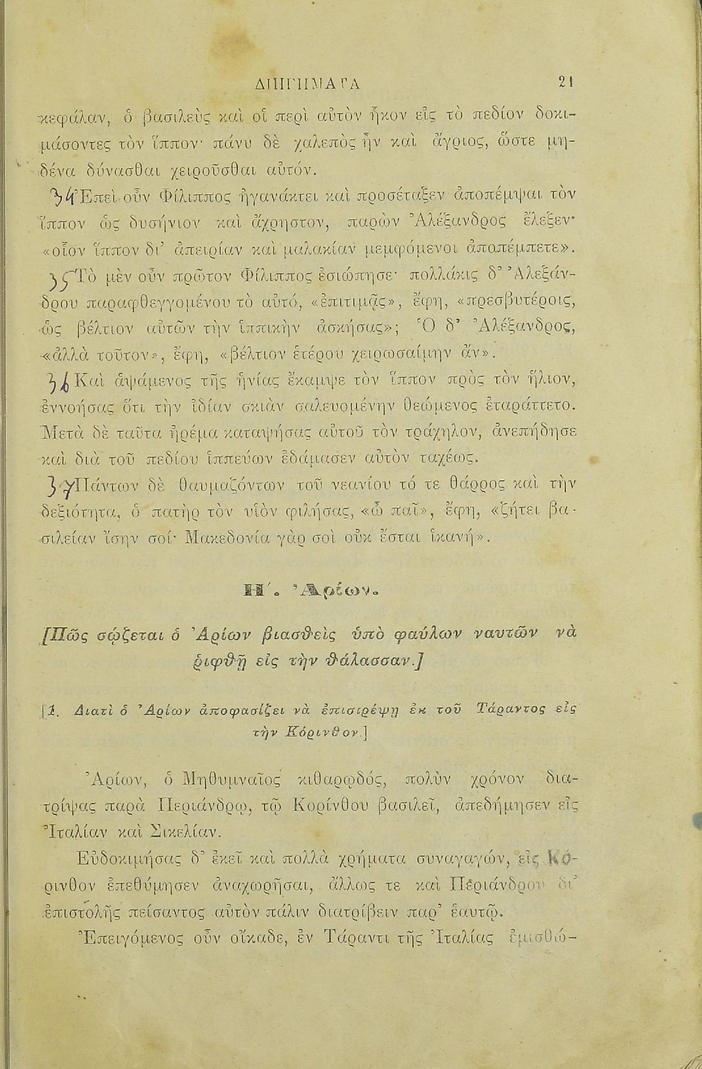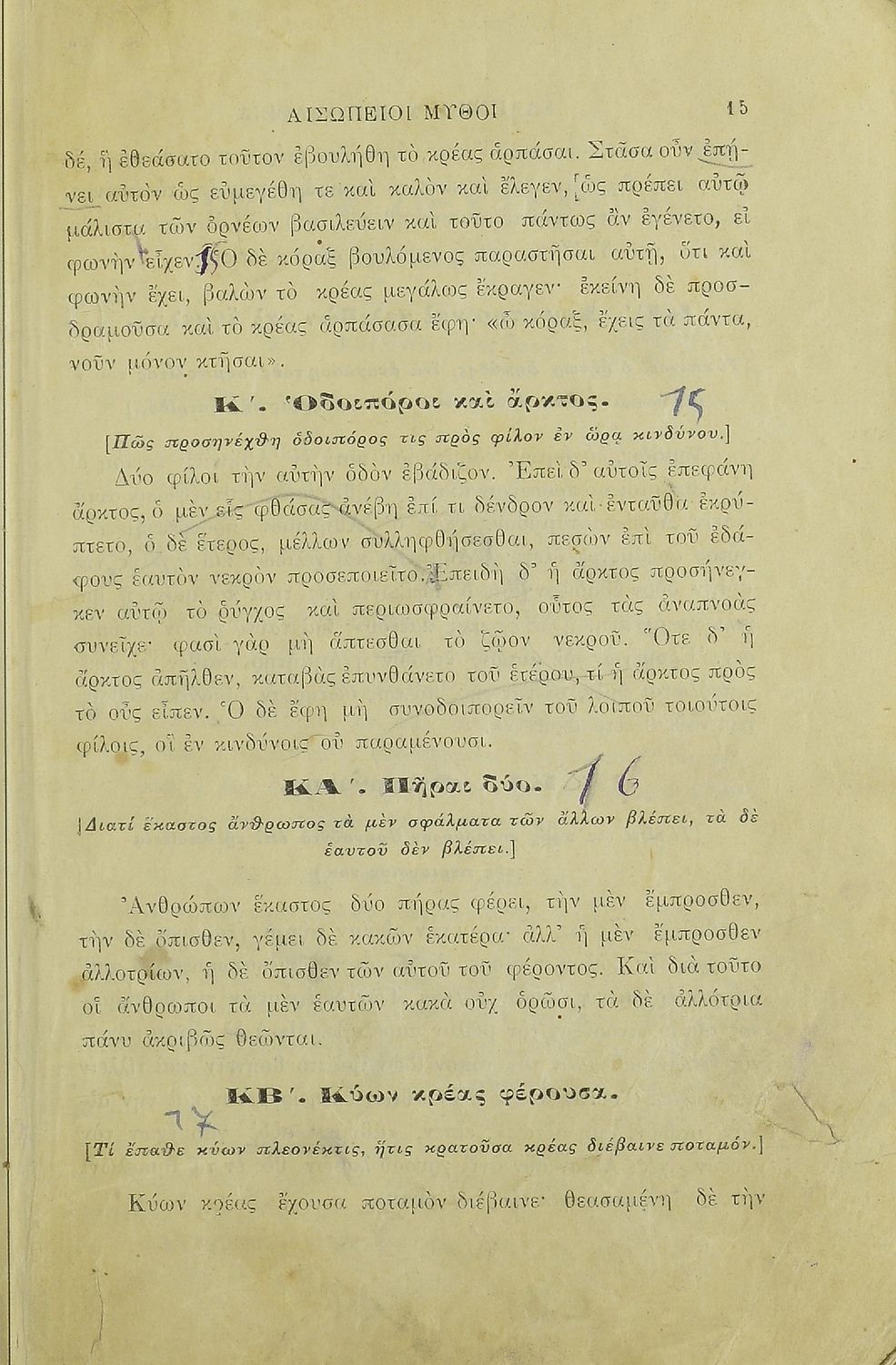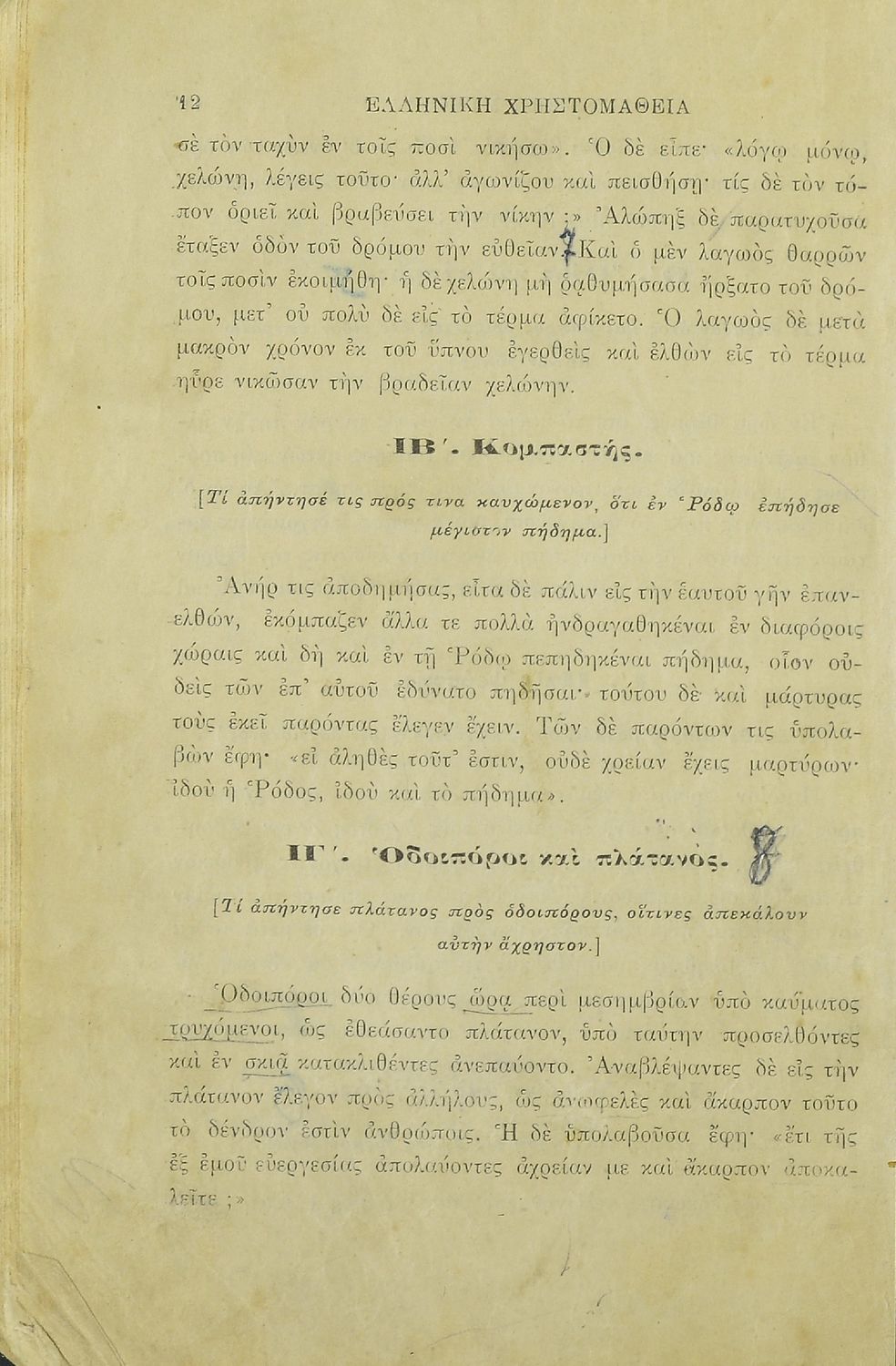 Σχολικό εγχειρίδιο Αρχαίων Ελληνικών για τις Ε΄ Δημοτικού και Α' Ελληνικού Σχολείου που περιλαμβάνει σύντομα διηγήματα εμπνευσμένα από τους μύθους του Αισώπου, περιγραφές ελληνικών πόλεων, επιστολές και ιστορίες από την ελληνική μυθολογία. Περιέχει ερμηνευτικές σημειώσεις, πίνακα κυριοτέρων ονομάτων και ηθικά πορίσματα.