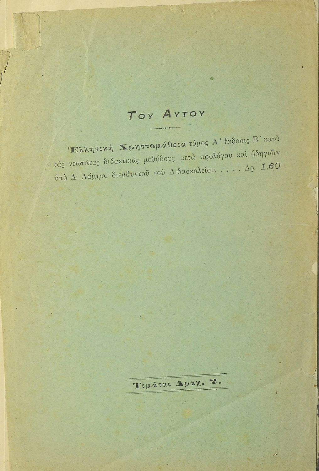 Τίτλος: Ελληνική χρηστομάθεια κατά τας νεώτατας διδακτικάς μεθόδους, τόμος Β΄, Ξενοφώντος Κύρου Ανάβασις προς χρήσιν των μαθητών της Β΄ τάξεως των Ελληνικών και της ΣΤ΄ των Πλήρων Σχολείων