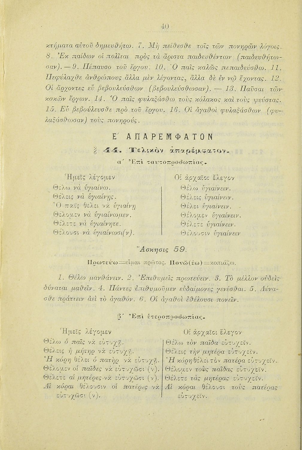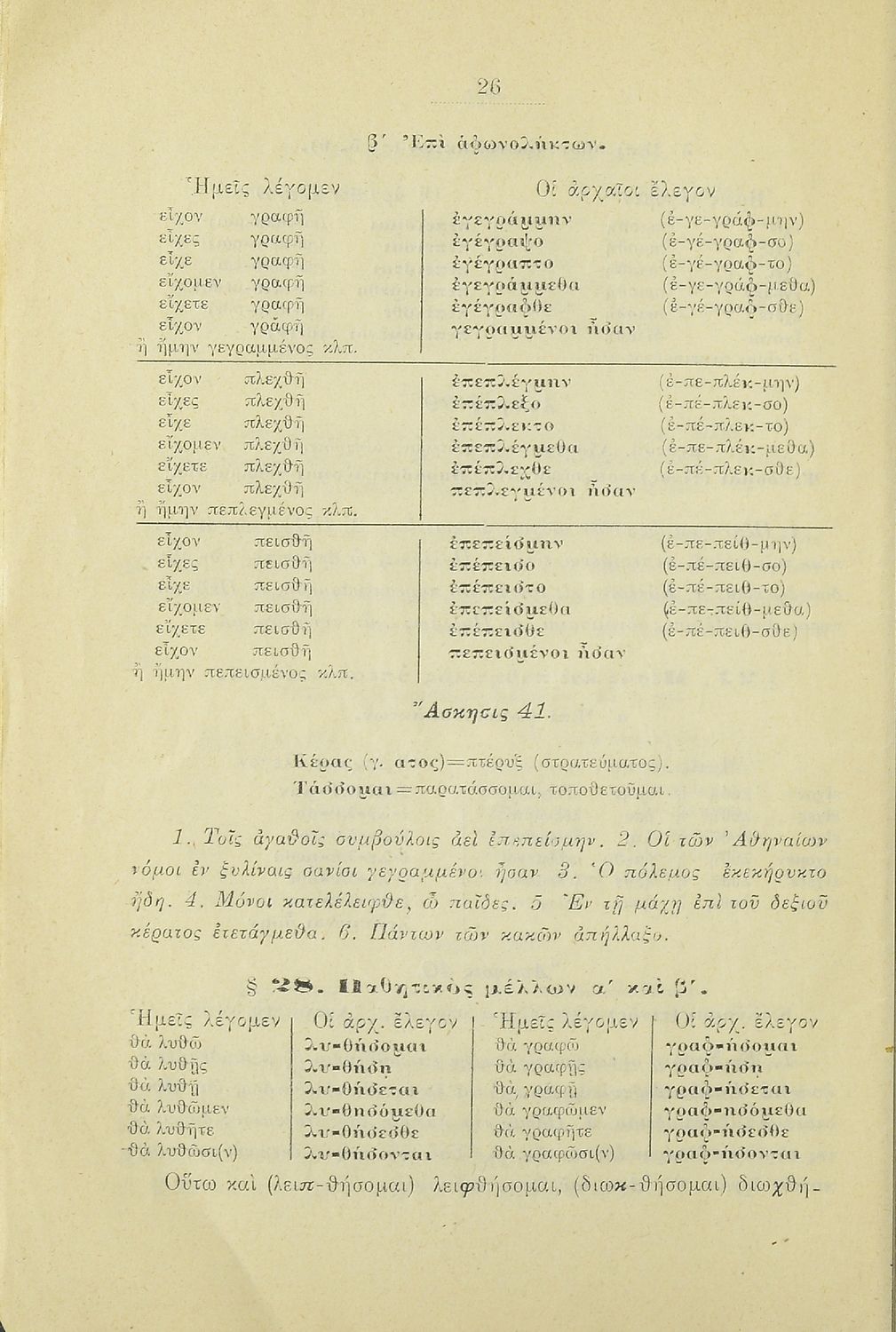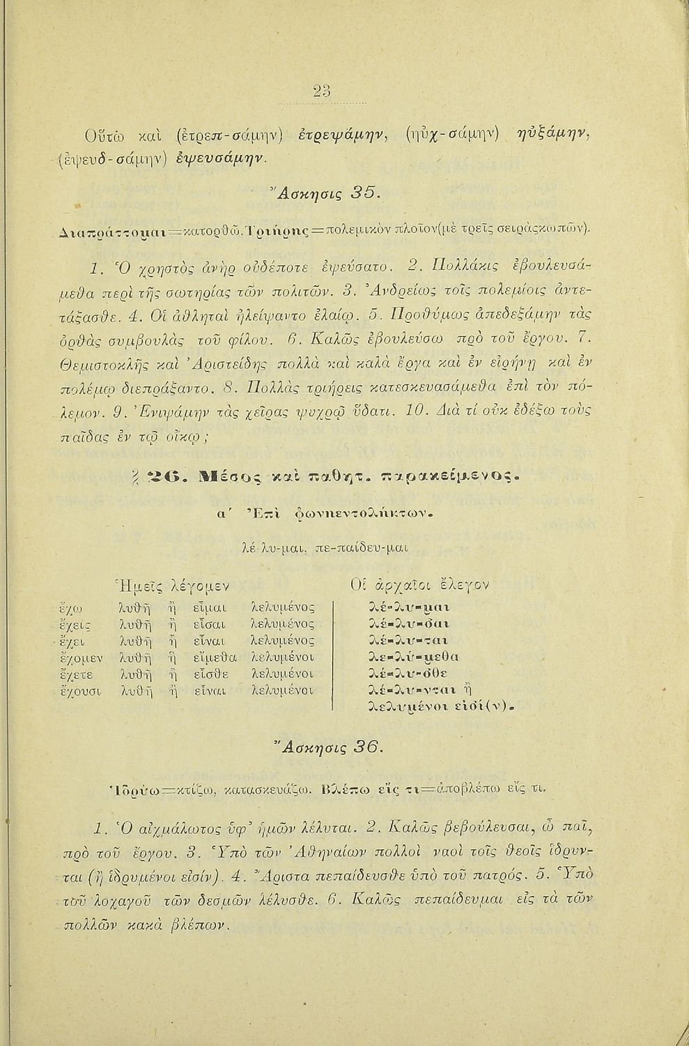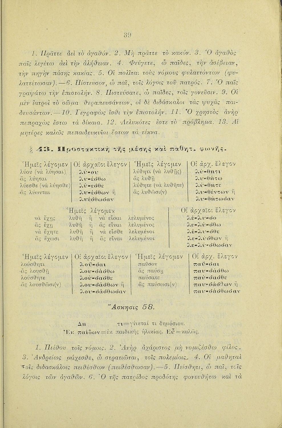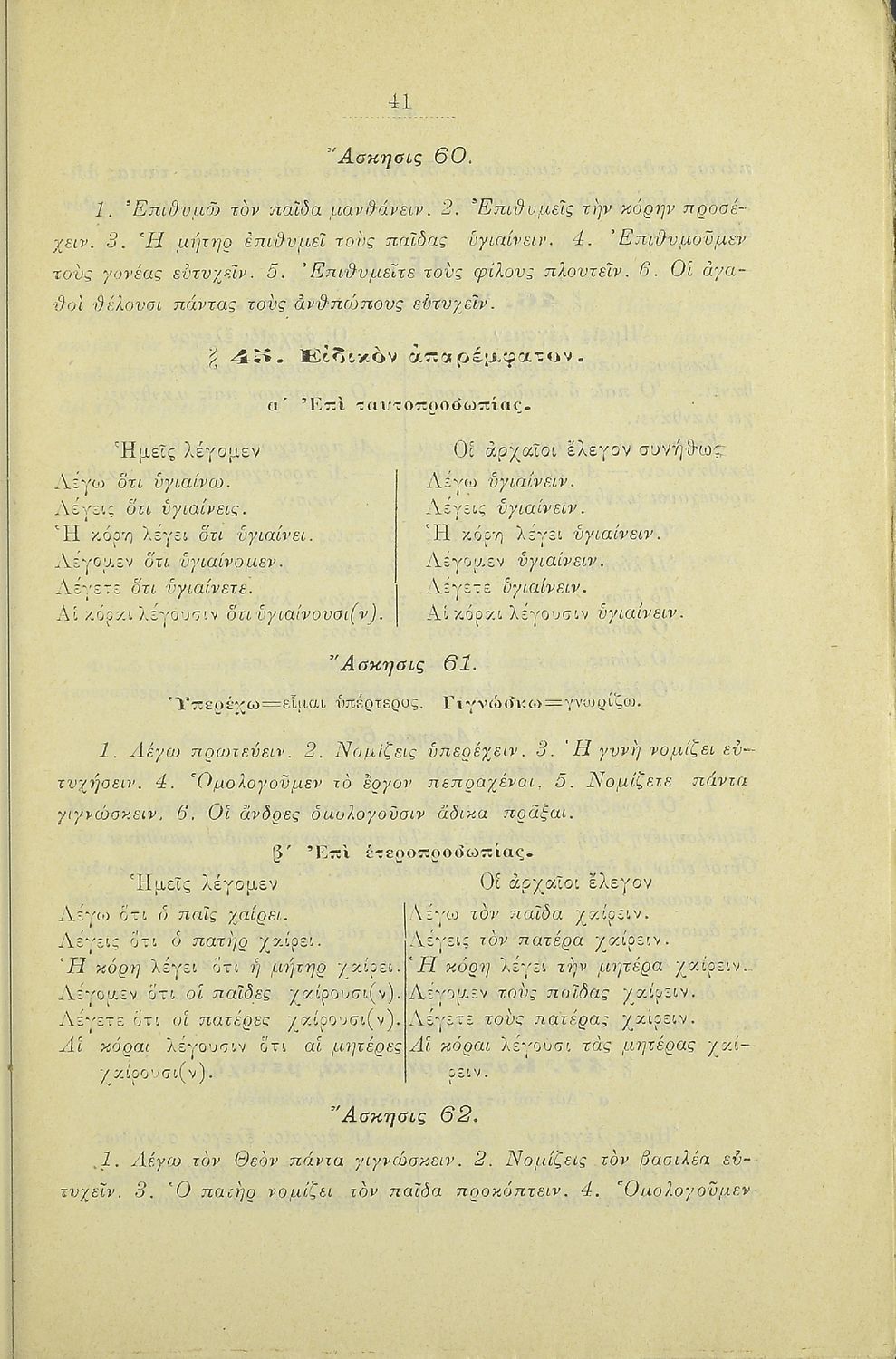 Σχολικό εγχειρίδιο Αρχαίων Ελληνικών για τις ΣΤ΄ Δημοτικού και Α' Ελληνικού Σχολείου που αναλύει τα συντακτικά και γραμματικά φαινόμενα της αρχαίας ελληνικής και περιλαμβάνει κείμενα από την ελληνική μυθολογία, ηθικά διδάγματα και παραινέσεις, και ερμηνευτικές σημειώσεις.