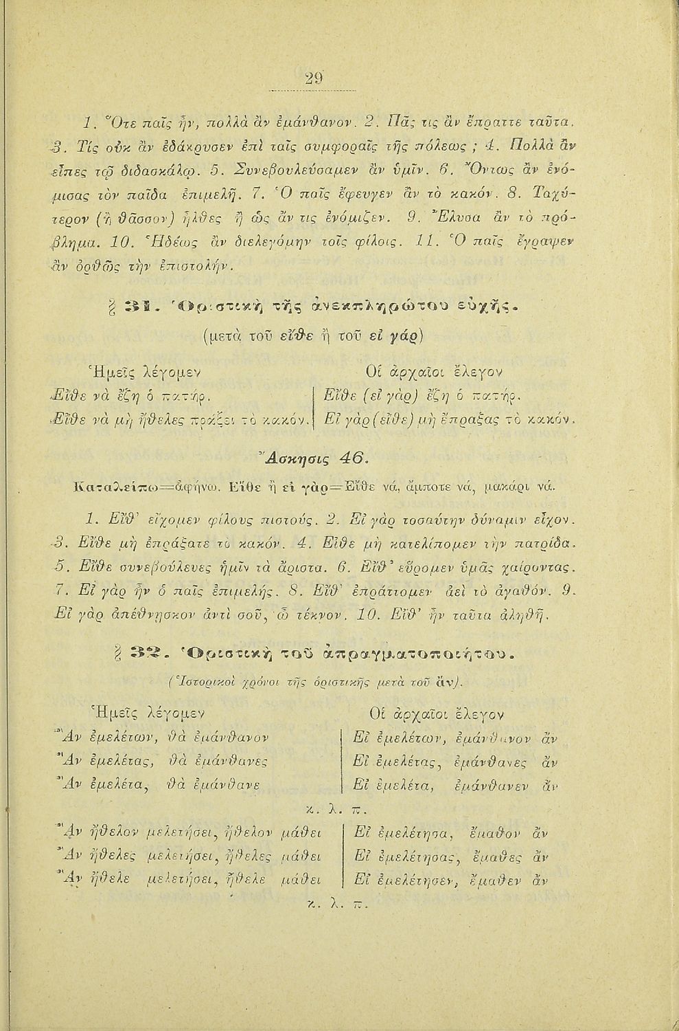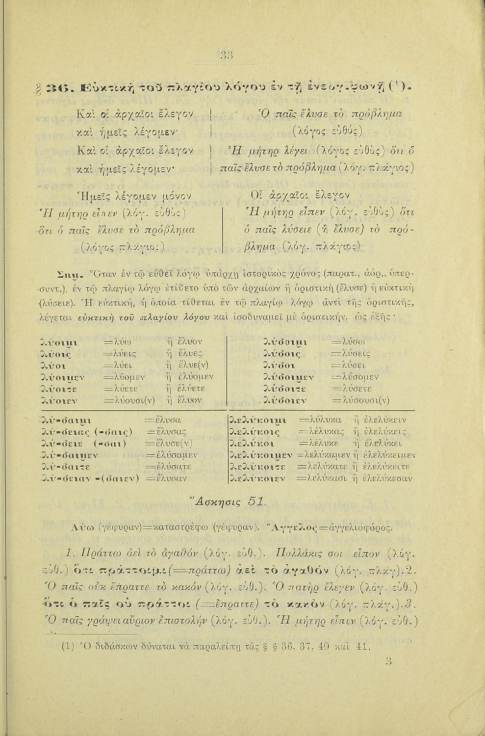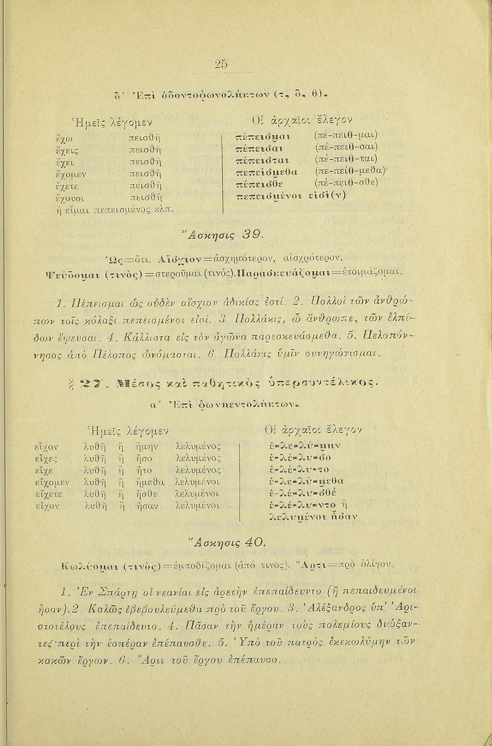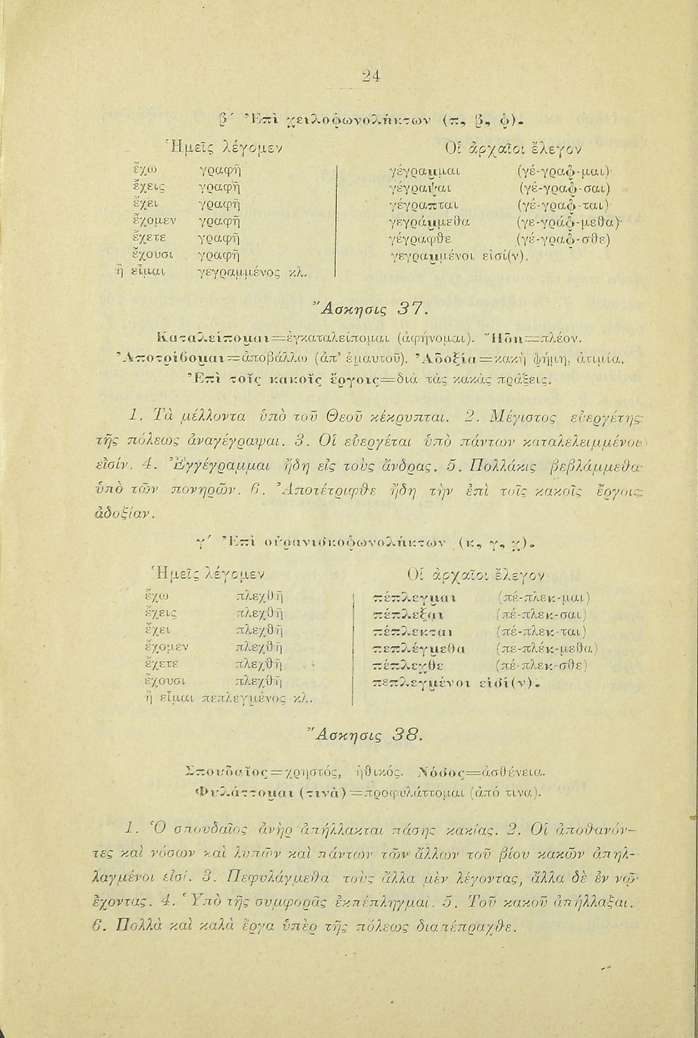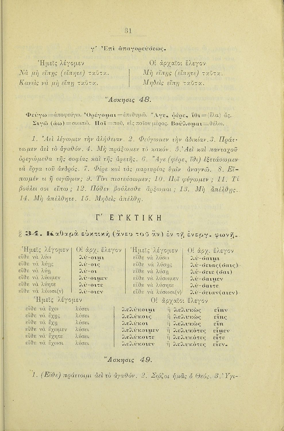 Σχολικό εγχειρίδιο Αρχαίων Ελληνικών για τις ΣΤ΄ Δημοτικού και Α' Ελληνικού Σχολείου που αναλύει τα συντακτικά και γραμματικά φαινόμενα της αρχαίας ελληνικής και περιλαμβάνει κείμενα από την ελληνική μυθολογία, ηθικά διδάγματα και παραινέσεις, και ερμηνευτικές σημειώσεις.