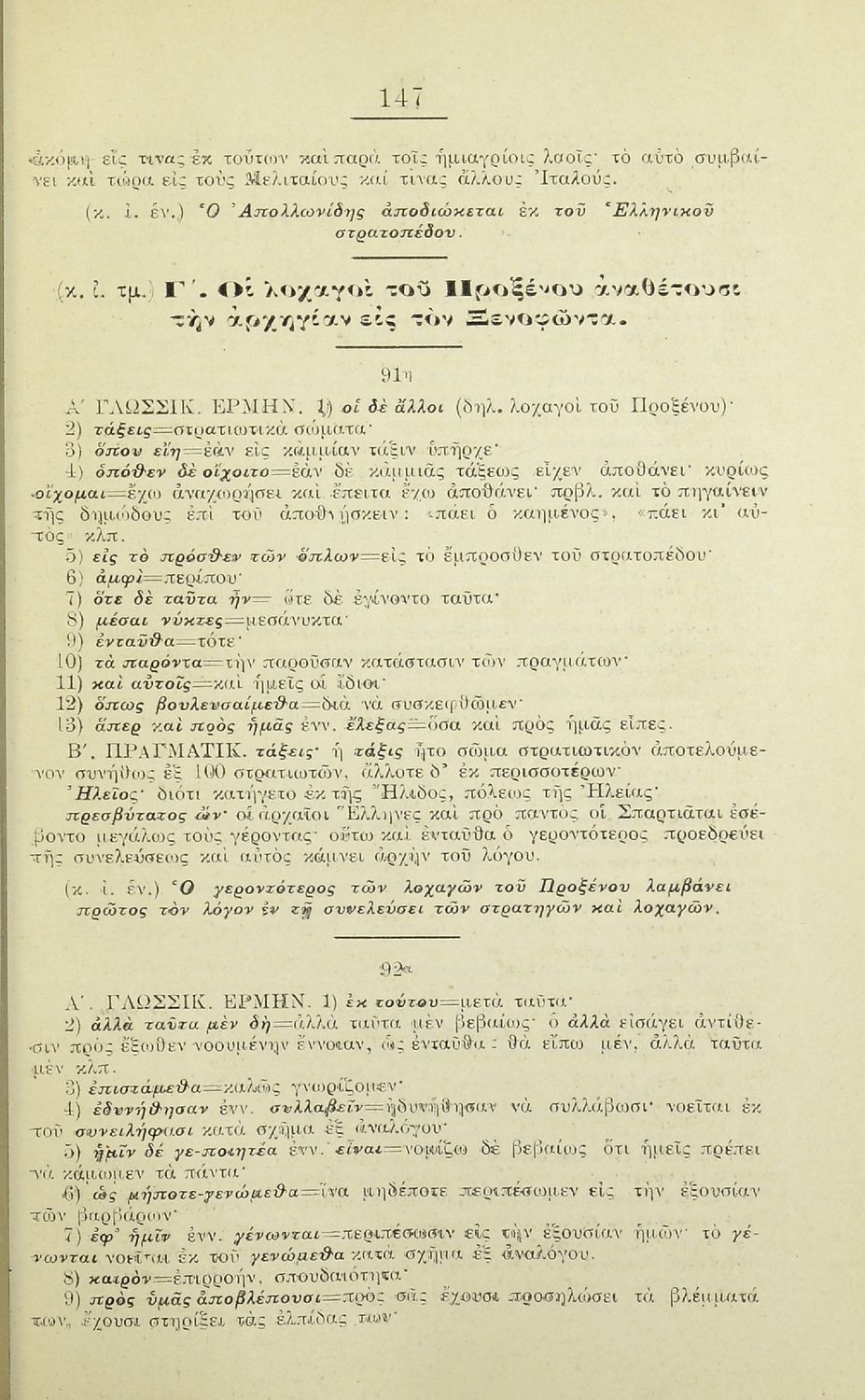 Σχολικό εγχειρίδιο Αρχαίων Ελληνικών Γ' Ελληνικού Σχολείου που περιλαμβάνει γραμματική της αρχαίας ελληνικής, αποσπάσματα από το έργο του Ξενοφώντα Ελληνικά και τα έργα του Λουκιανού Ενύπνιον και Ανάχαρσις, ...