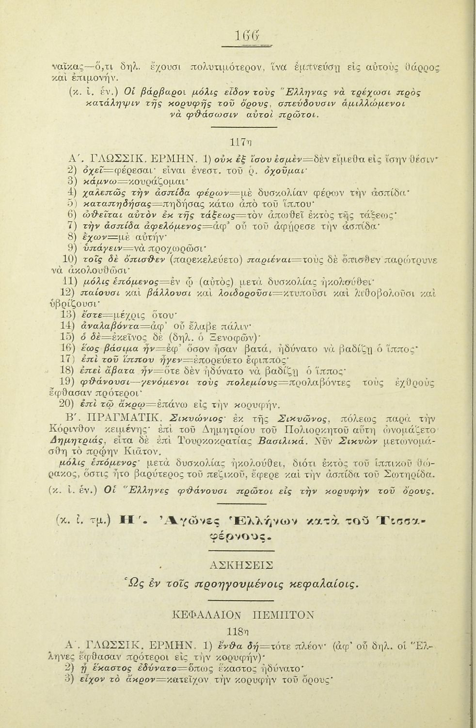 Σχολικό εγχειρίδιο Αρχαίων Ελληνικών Γ' Ελληνικού Σχολείου που περιλαμβάνει γραμματική της αρχαίας ελληνικής, αποσπάσματα από το έργο του Ξενοφώντα Ελληνικά και τα έργα του Λουκιανού Ενύπνιον και Ανάχαρσις, ...