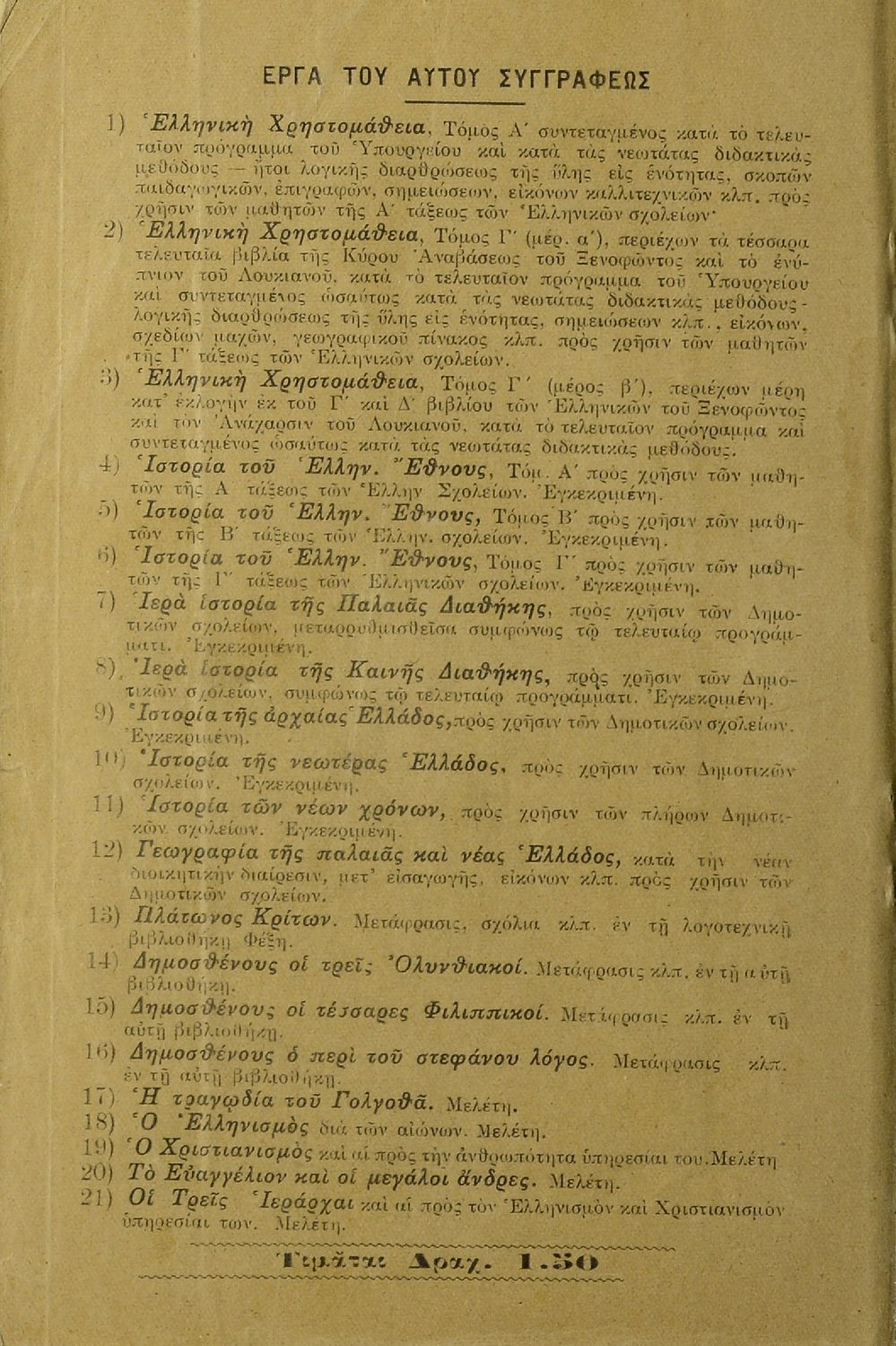 Σχολικό εγχειρίδιο Αρχαίων Ελληνικών για τα Ιερατικά Σχολεία. Ο τόμος περιέχει «..τεμάχια κατ’ εκλογήν εκ της Ξενοφώντος Κύρου Ανάβασεως και εκ των Γεωγραφικών και Εθνογραφικών Στράβωνος, Διοδώρου και άλλων, ...