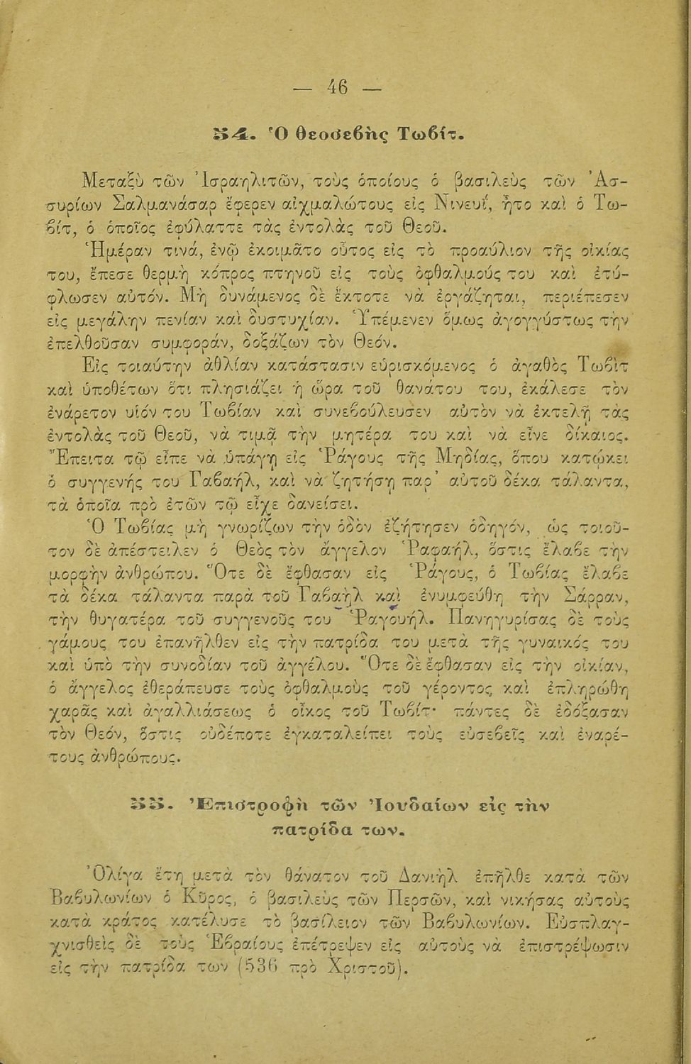 Σχολικό εγχειρίδιο Θρησκευτικών Δημοτικού που συνιστά μία εξιστόρηση της Παλαιάς Διαθήκης από τη δημιουργία του κόσμου ως την υποταγή των Εβραίων στους Ρωμαίους.