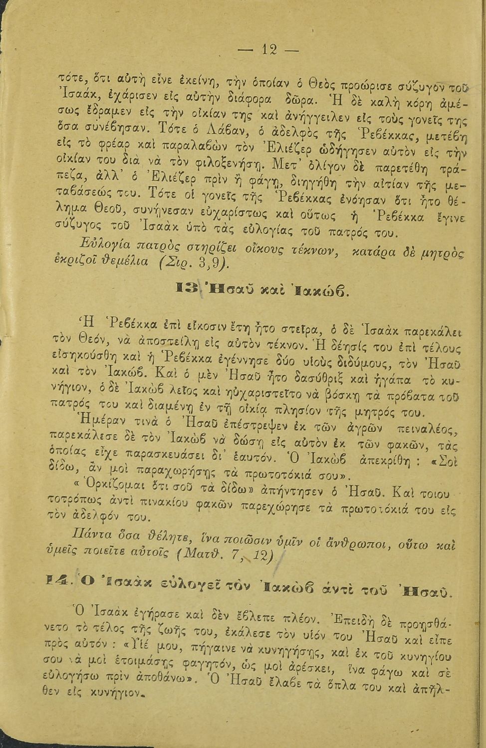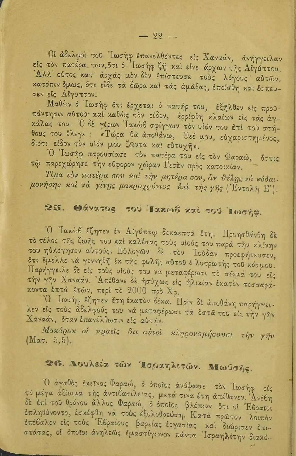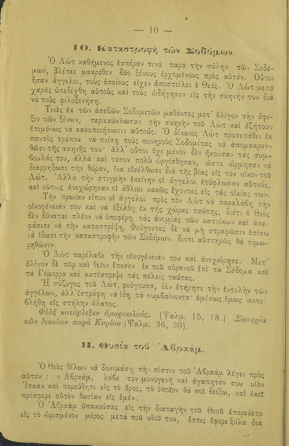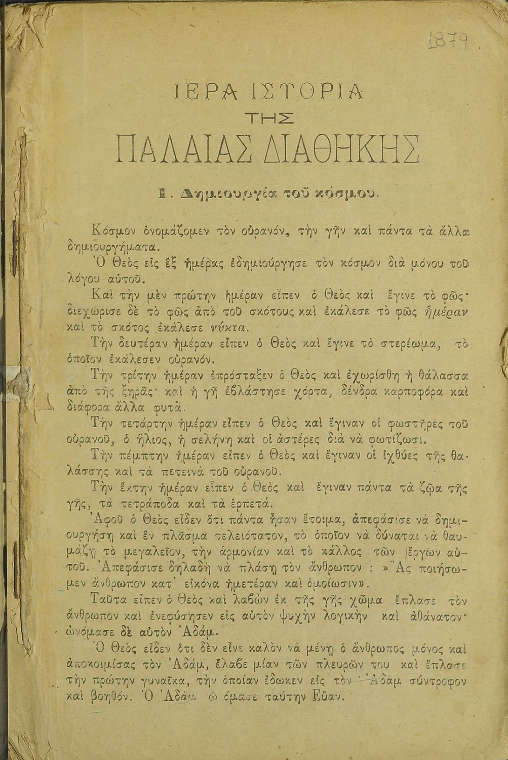 Βαθμίδα εκπαίδευσης: Πρωτοβάθμια Μάθημα: Θρησκευτικά Γλώσσα: Καθαρεύουσα Παρουσίαση περιεχομένου: Σχολικό εγχειρίδιο Θρησκευτικών Δημοτικού που συνιστά μία εξιστόρηση της Παλαιάς Διαθήκης από τη δημιουργία του κόσμου ως τους Μακκαβαίους. |