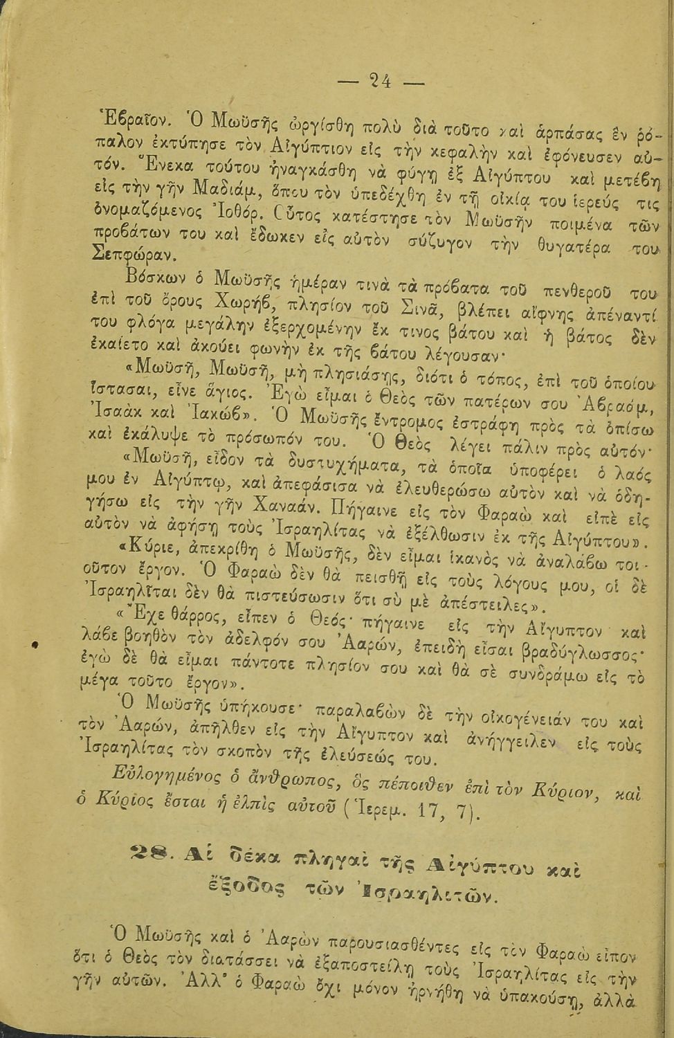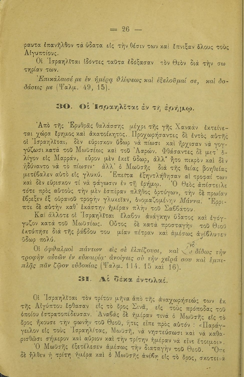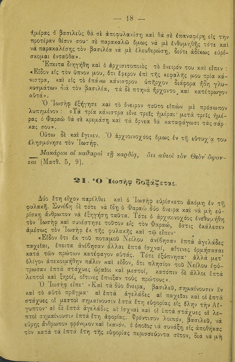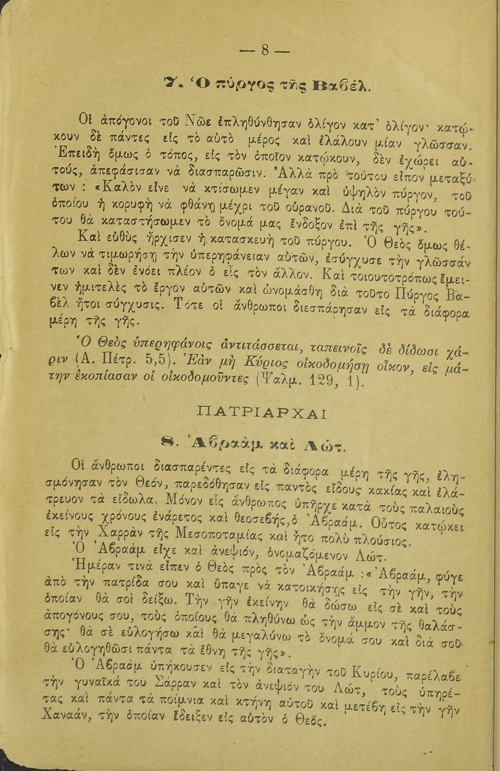 Βαθμίδα εκπαίδευσης: Πρωτοβάθμια Μάθημα: Θρησκευτικά Γλώσσα: Καθαρεύουσα Παρουσίαση περιεχομένου: Σχολικό εγχειρίδιο Θρησκευτικών Δημοτικού που συνιστά μία εξιστόρηση της Παλαιάς Διαθήκης από τη δημιουργία του κόσμου ως τους Μακκαβαίους. |