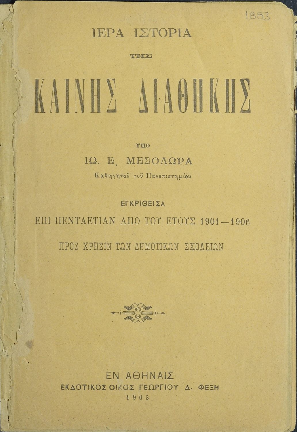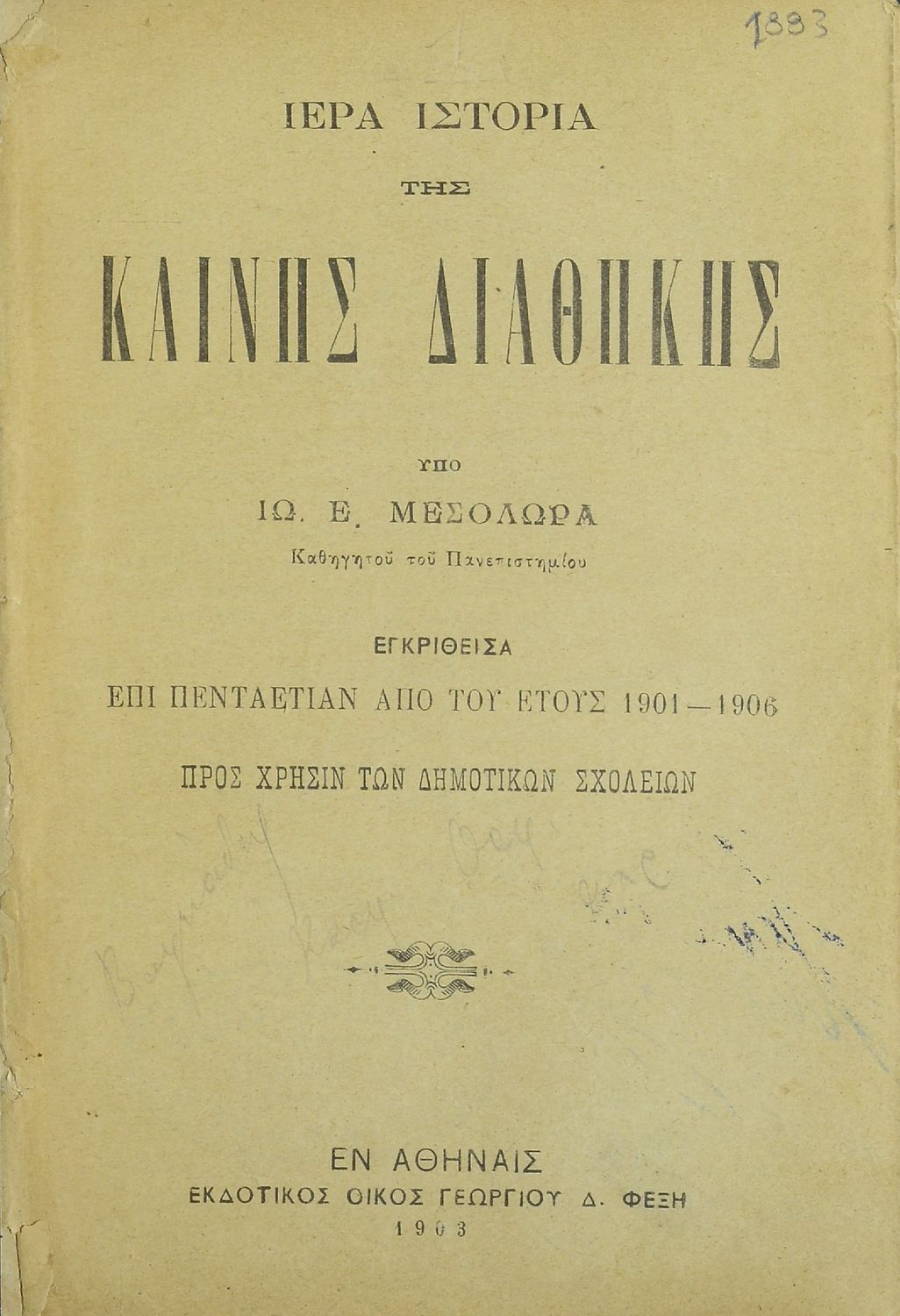 Εκδότης: Γεώργιος Δ. Φέξης Έτος έκδοσης: 1903 Τόπος έκδοσης: Αθήνα Υπουργική απόφαση / Σύμβαση: 7704/19-5-1901 Έτος έγκρισης: 1901 |
