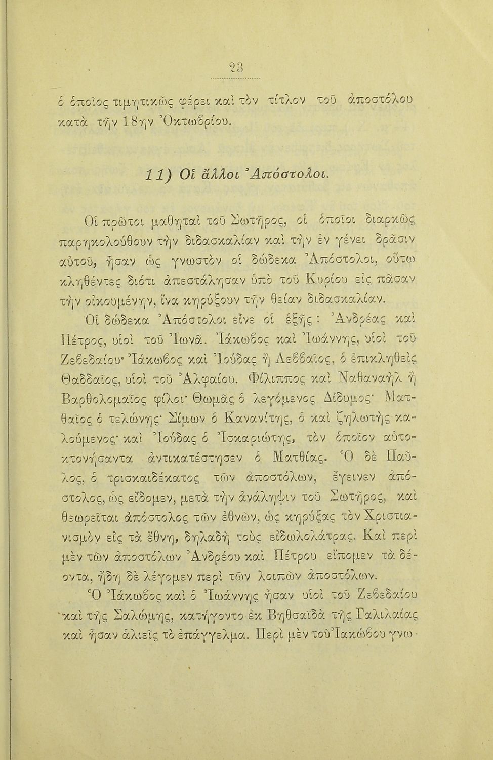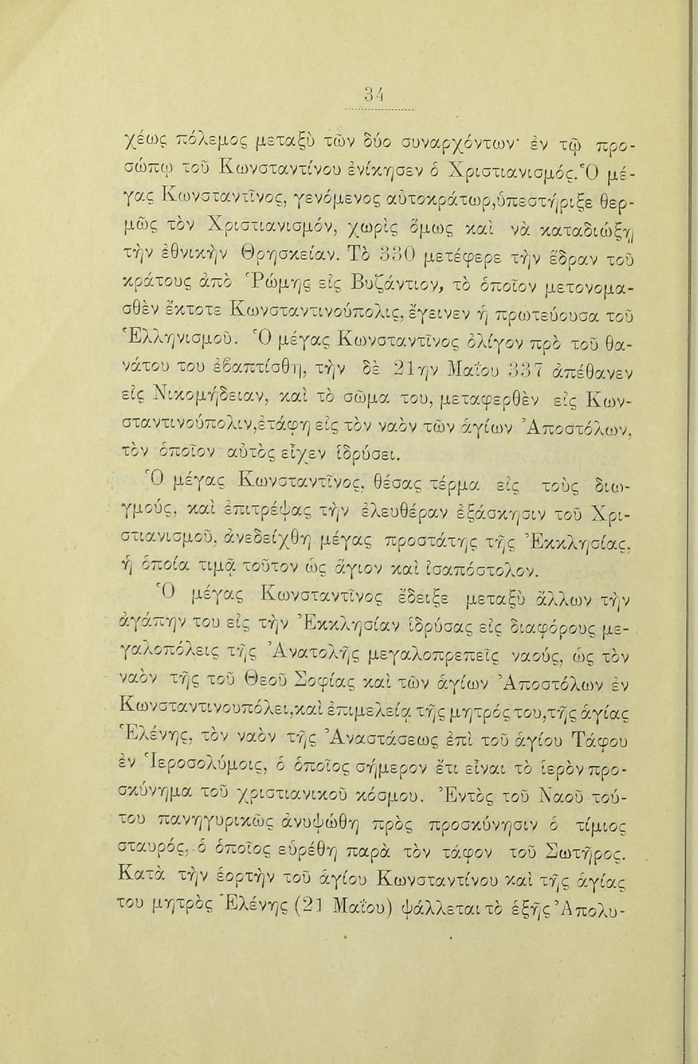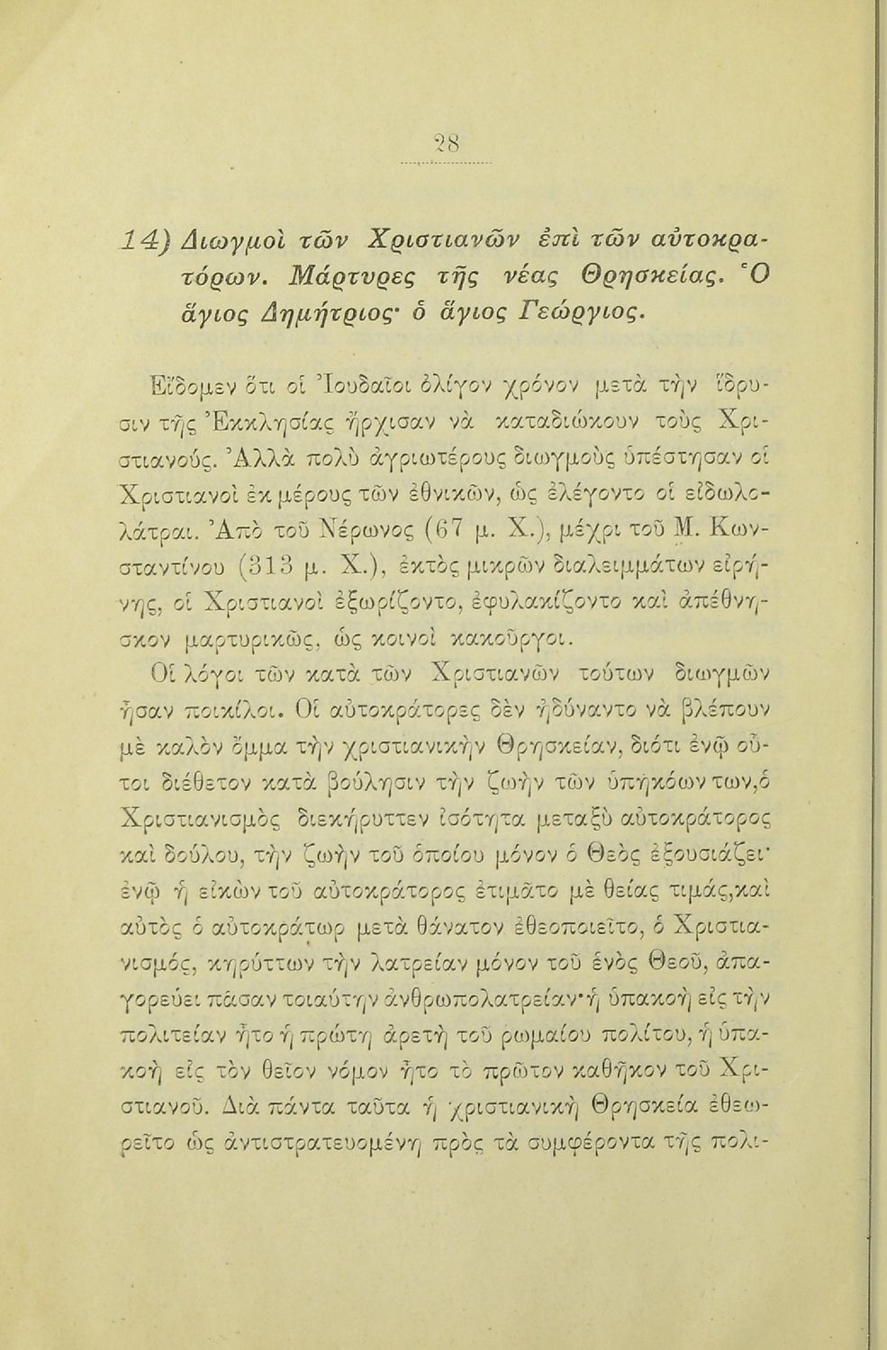 Βαθμίδα εκπαίδευσης: Πρωτοβάθμια Μάθημα: Θρησκευτικά Γλώσσα: Καθαρεύουσα Παρουσίαση περιεχομένου: Σχολικό εγχειρίδιο Θρησκευτικών Δημοτικού που εστιάζει στην ορθόδοξη χριστιανική εκκλησία και τις παραδόσεις της. Αναλύονται η ζωή και τα έργα των Αγίων, των Αποστόλων, του Θεοδόσιου, του Ιουλιανού και του Ιουστινιανού, οι εικονομάχοι και οι εικονολάτρες, το σχίσμα, και η ιστορική πορεία των Πατριαρχείων. |