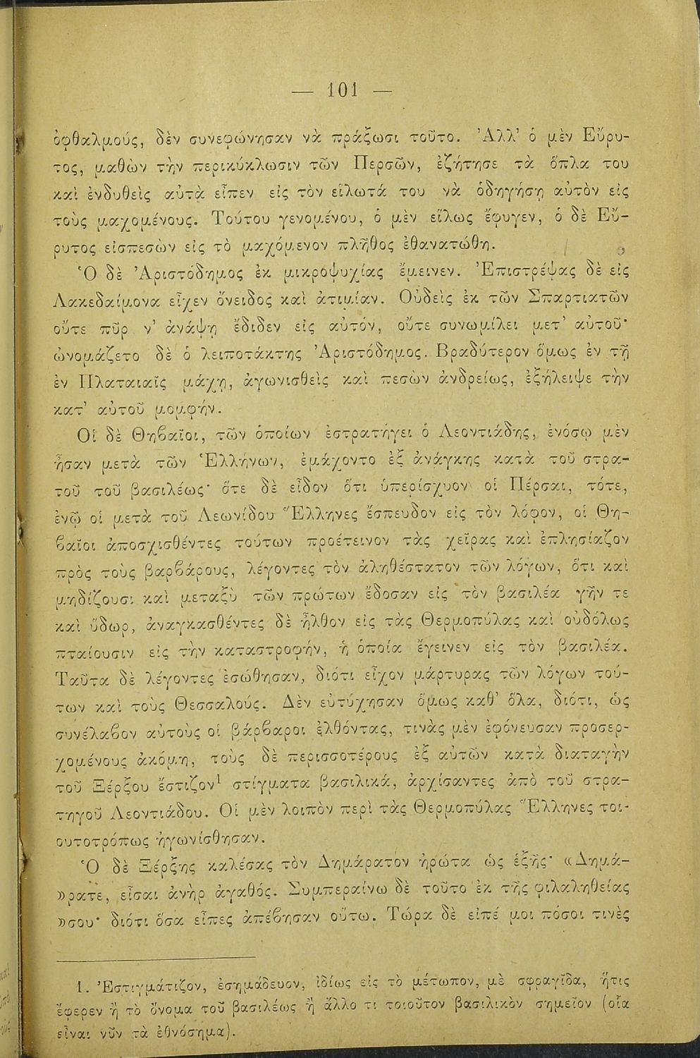 Βαθμίδα εκπαίδευσης: Πρωτοβάθμια Τάξη: Δ' Δημοτικού Μάθημα: Νέα Ελληνικά Γλώσσα: Καθαρεύουσα Παρουσίαση περιεχομένου: Αναγνωστικό Δ΄ Δημοτικού που περιλαμβάνει εισαγωγικά σχόλια στη ζωή και στο έργο του Ηρόδοτου, διασκευασμένα αποσπάσματα από το έργο του, και ποιήματα εμπνευσμένα από τη νεώτερη ελληνική ιστορία, τη θρησκευτική και εθνική παράδοση, την κοινωνική ζωή των ανθρώπων και την αγάπη για την φύση και τα ζώα. |