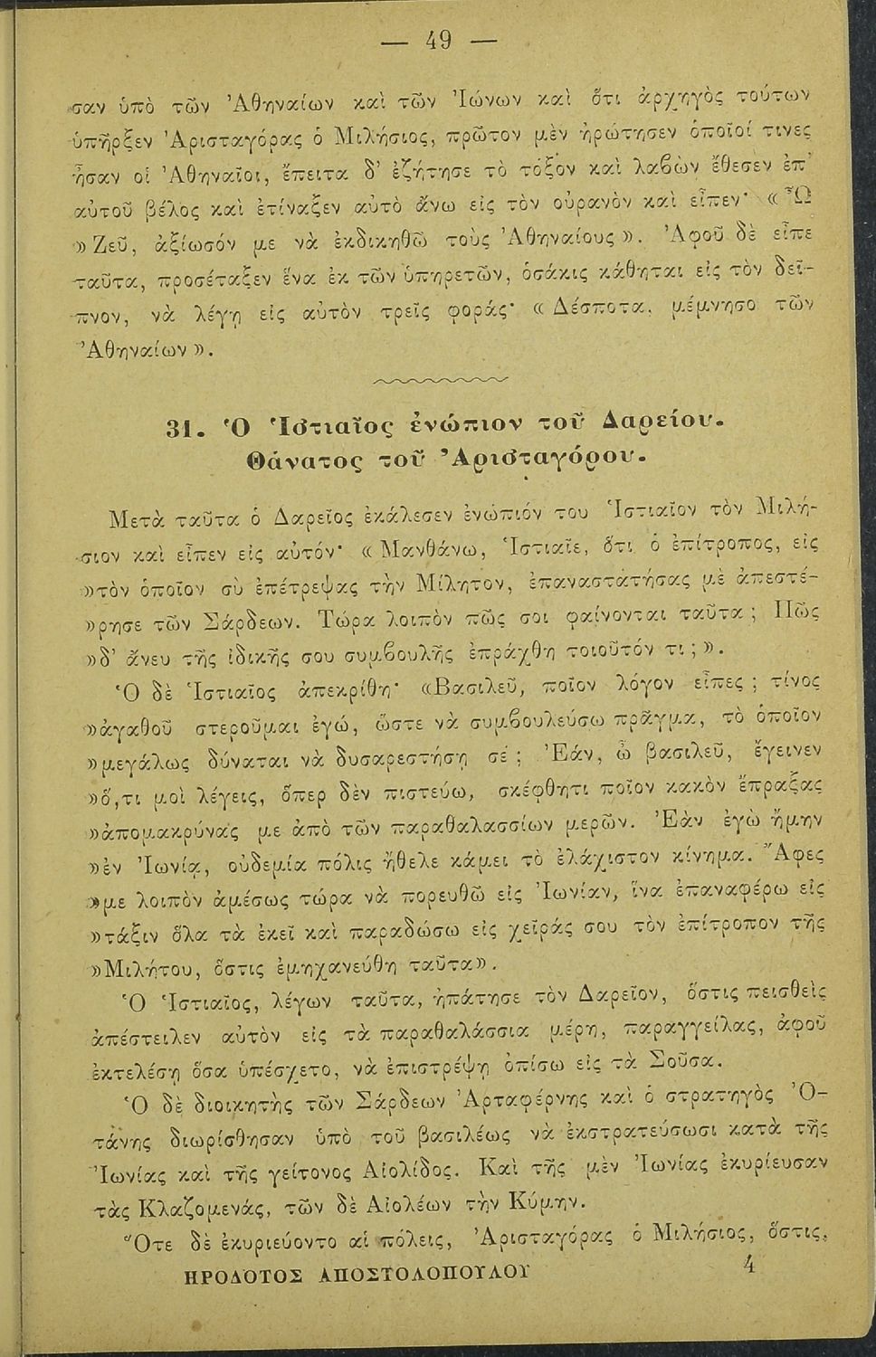 520 ## _aΑναγνωστικό Δ΄ Δημοτικού που περιλαμβάνει εισαγωγικά σχόλια στη ζωή και στο έργο του Ηρόδοτου, διασκευασμένα αποσπάσματα από το έργο του, και ποιήματα εμπνευσμένα από τη νεώτερη ελληνική ιστορία, τη θρησκευτική και εθνική παράδοση, την κοινωνική ζωή των ανθρώπων και την αγάπη για την φύση και τα ζώα.