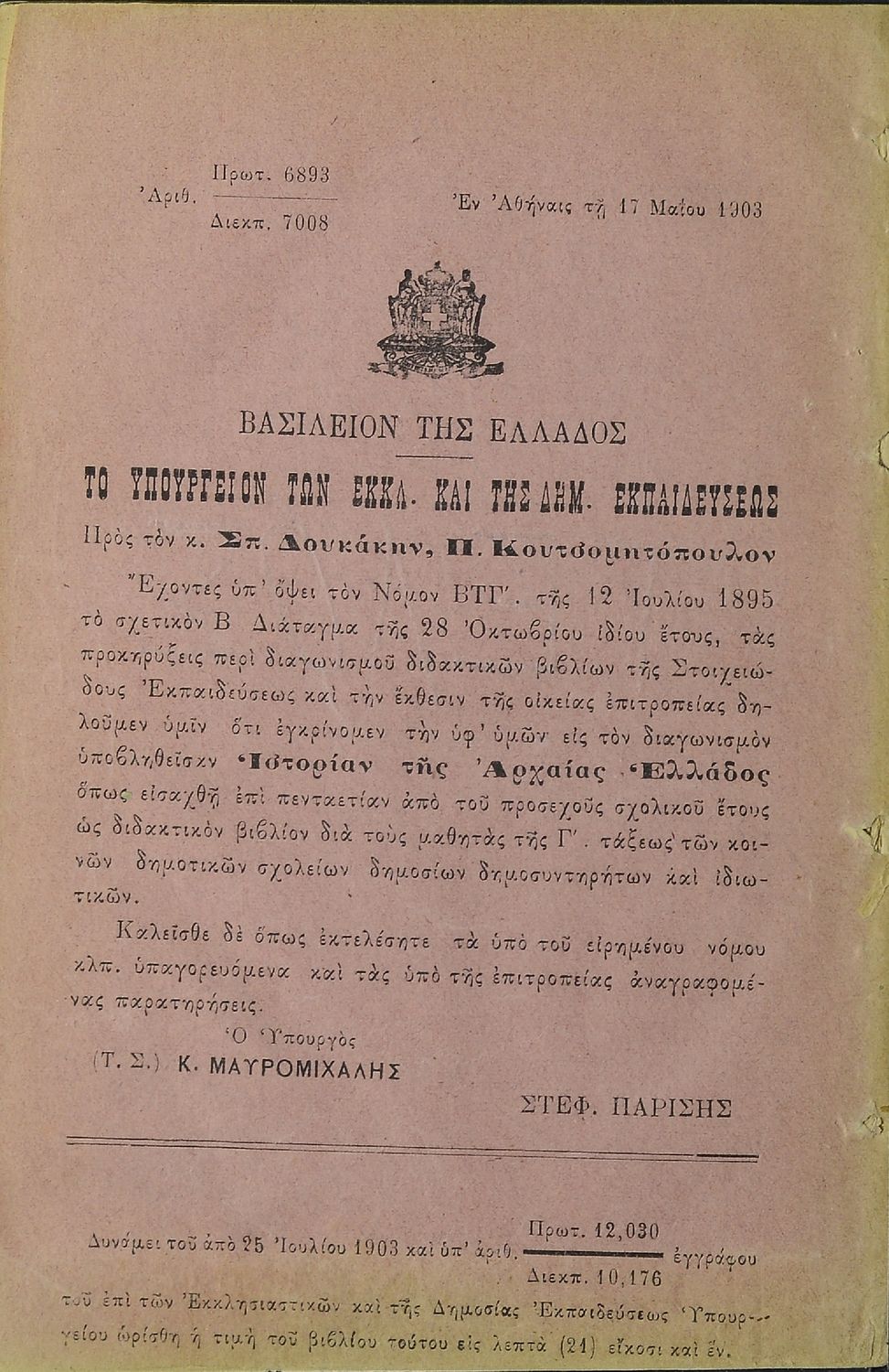 Υπουργική απόφαση / Σύμβαση: 6893/17-5-1903