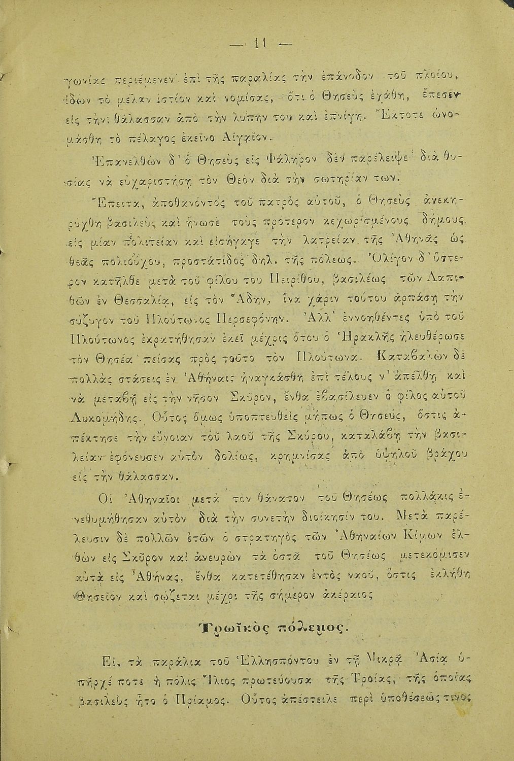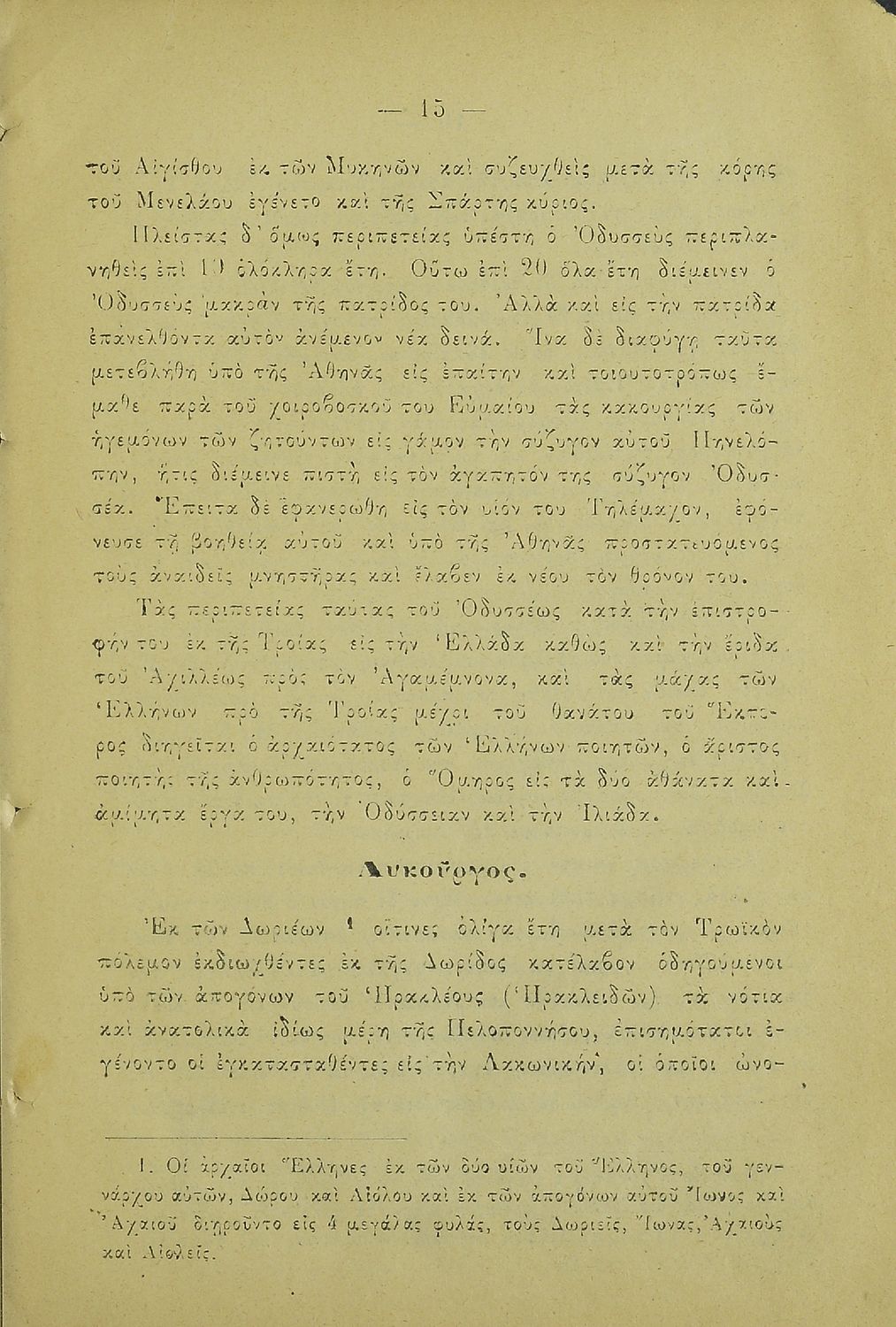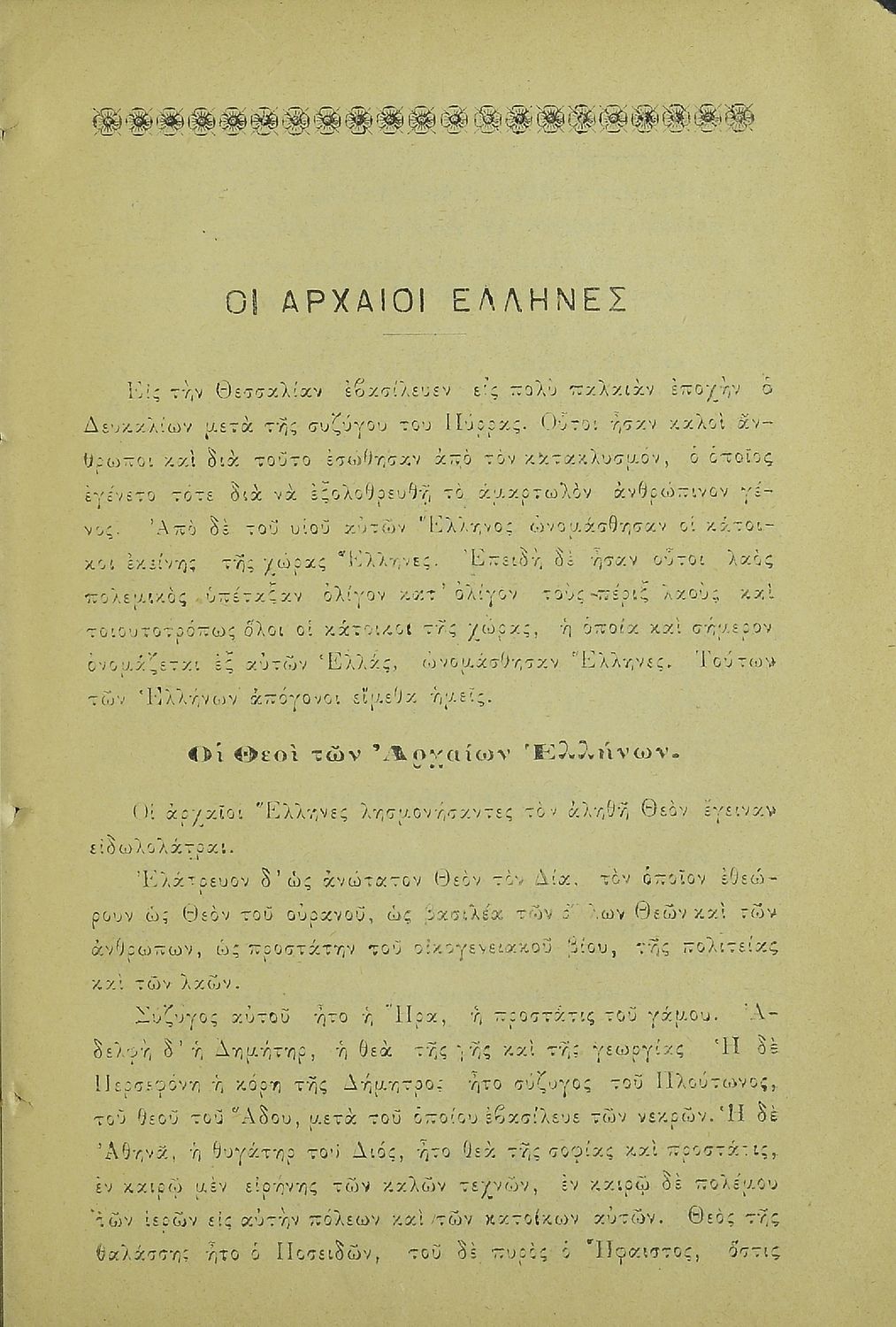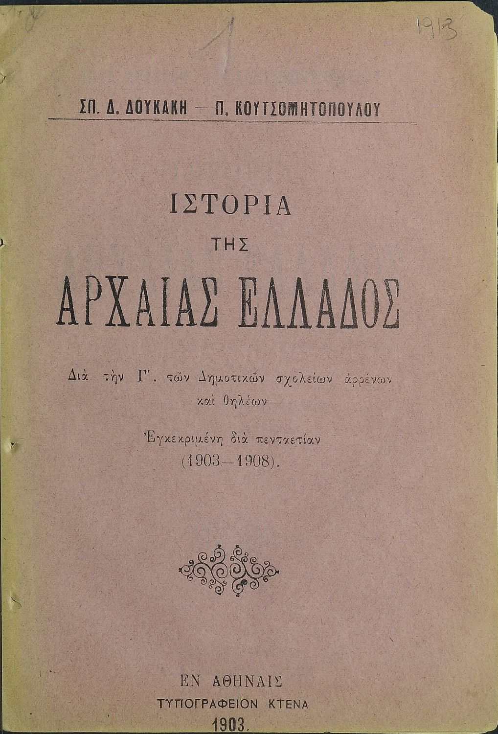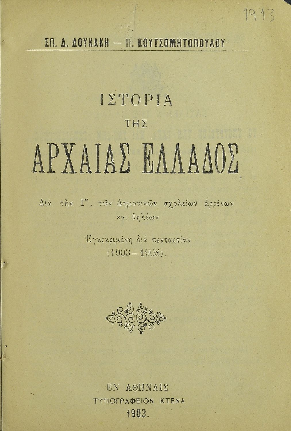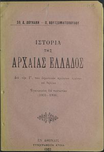 Βαθμίδα εκπαίδευσης: Πρωτοβάθμια Τάξη: Γ' Δημοτικού Μάθημα: Ιστορία Γλώσσα: Καθαρεύουσα Παρουσίαση περιεχομένου: Σχολικό εγχειρίδιο Ιστορίας Γ΄ Δημοτικού που καλύπτει το διάστημα από τους προϊστορικούς χρόνους ως τη Μακεδονική Ηγεμονία. |