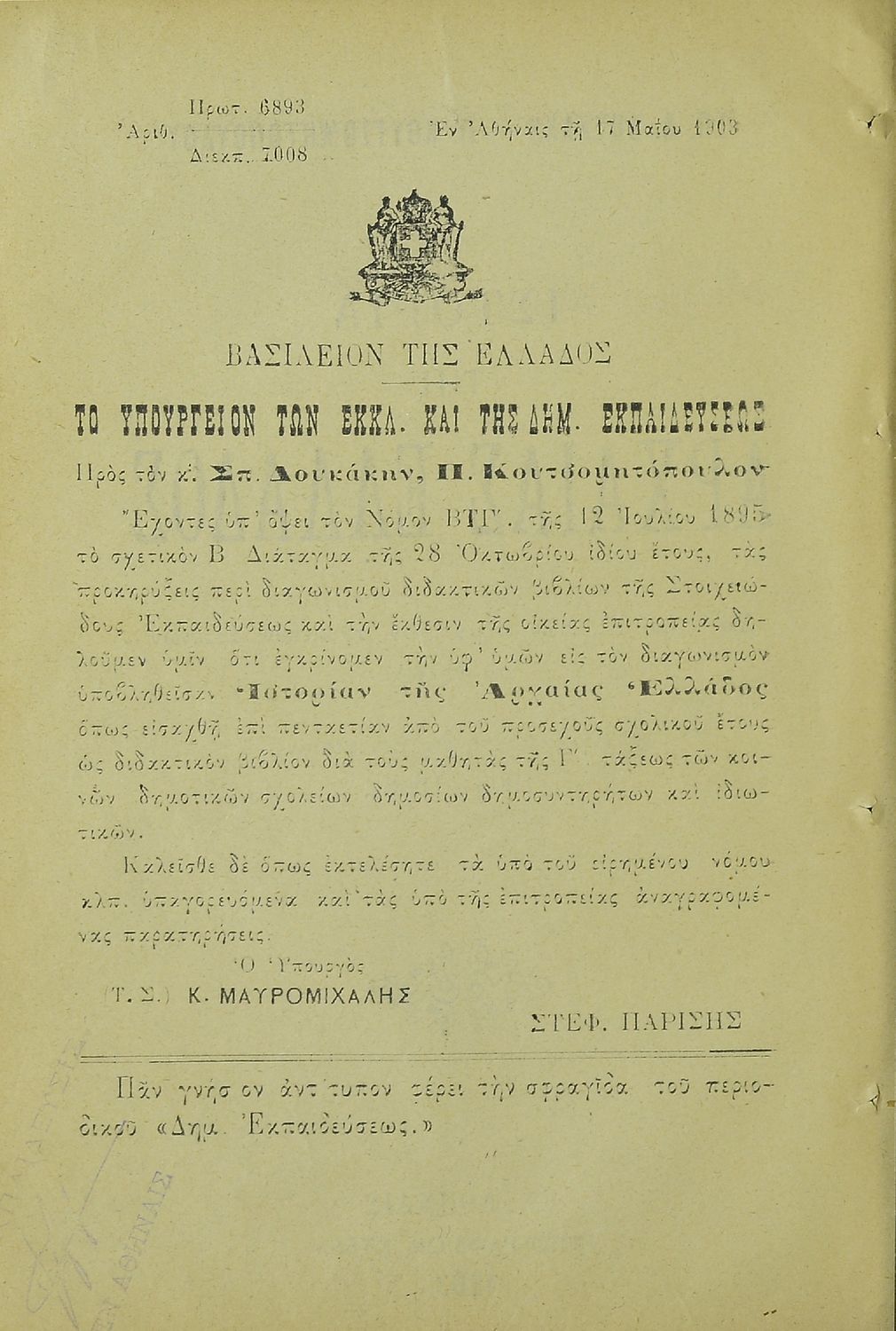 Εκδότης: Τυπογραφείο Κτενάς Έτος έκδοσης: 1903 Τόπος έκδοσης: Αθήνα Υπουργική απόφαση / Σύμβαση: 6893/17-5-1903 Έτος έγκρισης: 1903 |