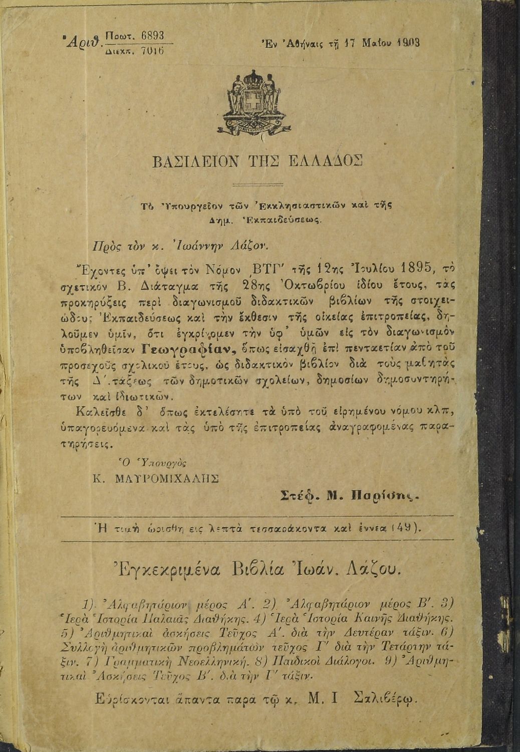 Υπουργική απόφαση / Σύμβαση: 6893/17-5-1903