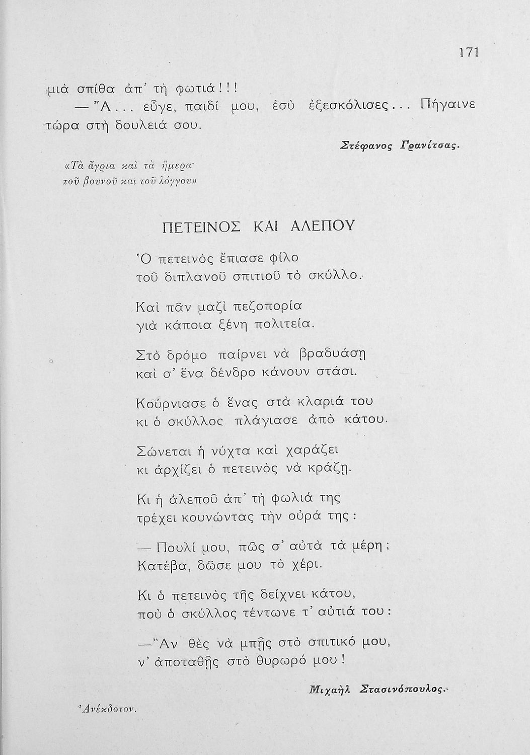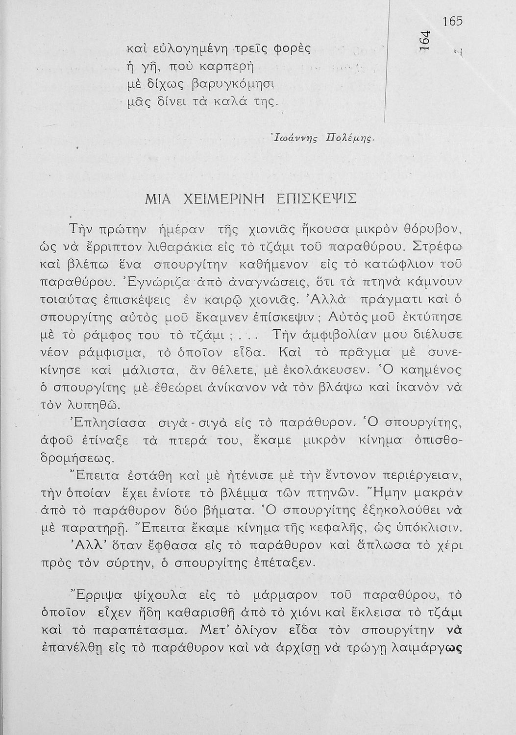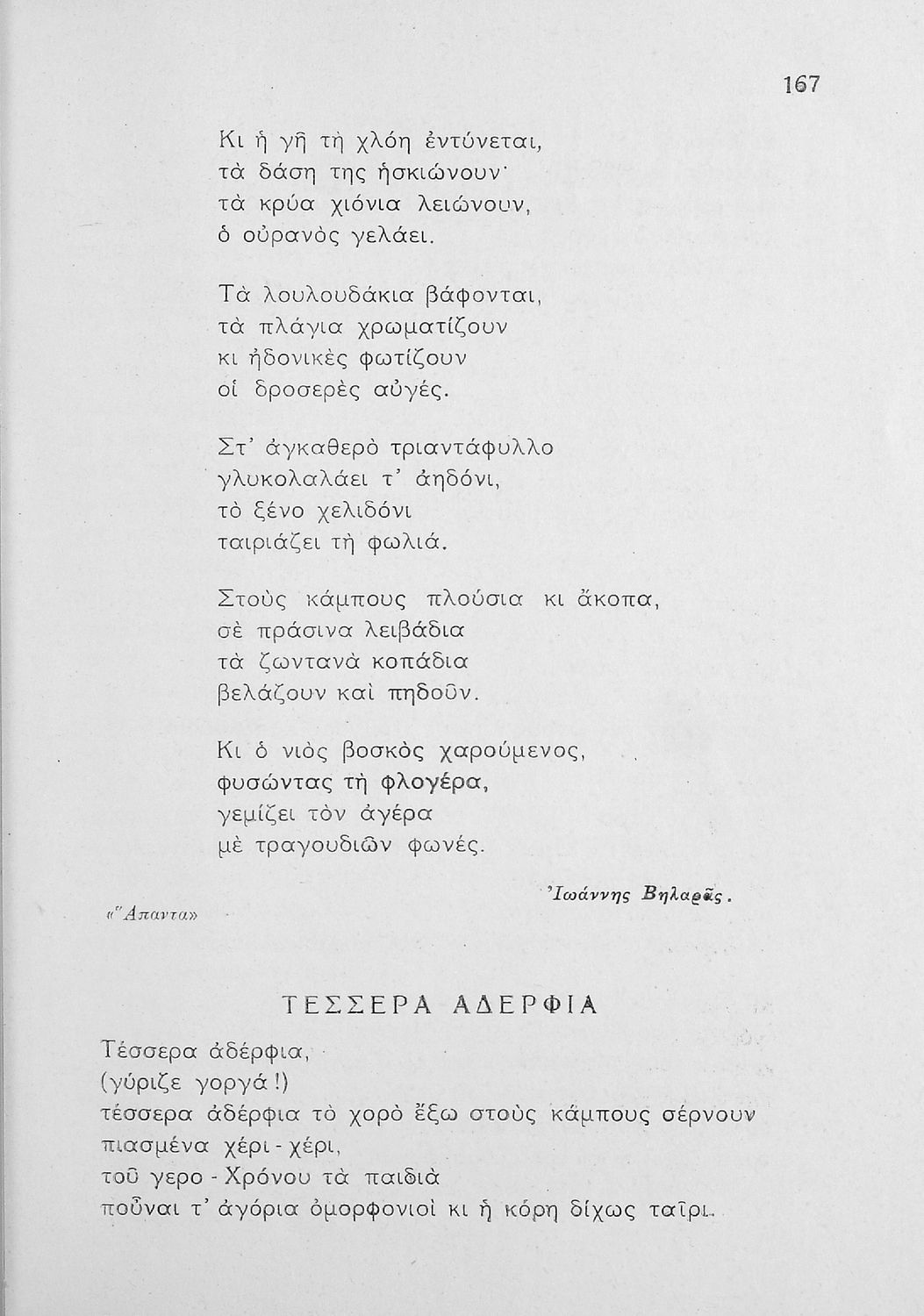 Σχολικό εγχειρίδιο Νέων Ελληνικών Α΄ Γυμνασίου και Α' Αστικού Σχολείου που περιλαμβάνει ποιήματα και πεζά Ελλήνων συγγραφέων εμπνευσμένα από τη θρησκευτική ζωή, την αρχαία και νεώτερη ελληνική ιστορία, την οικογενειακή και κοινωνική ζωή και την ελληνική ύπαιθρο. Περιέχει και παράρτημα με βιογραφίες των συγγραφέων και λεξιλόγιο.