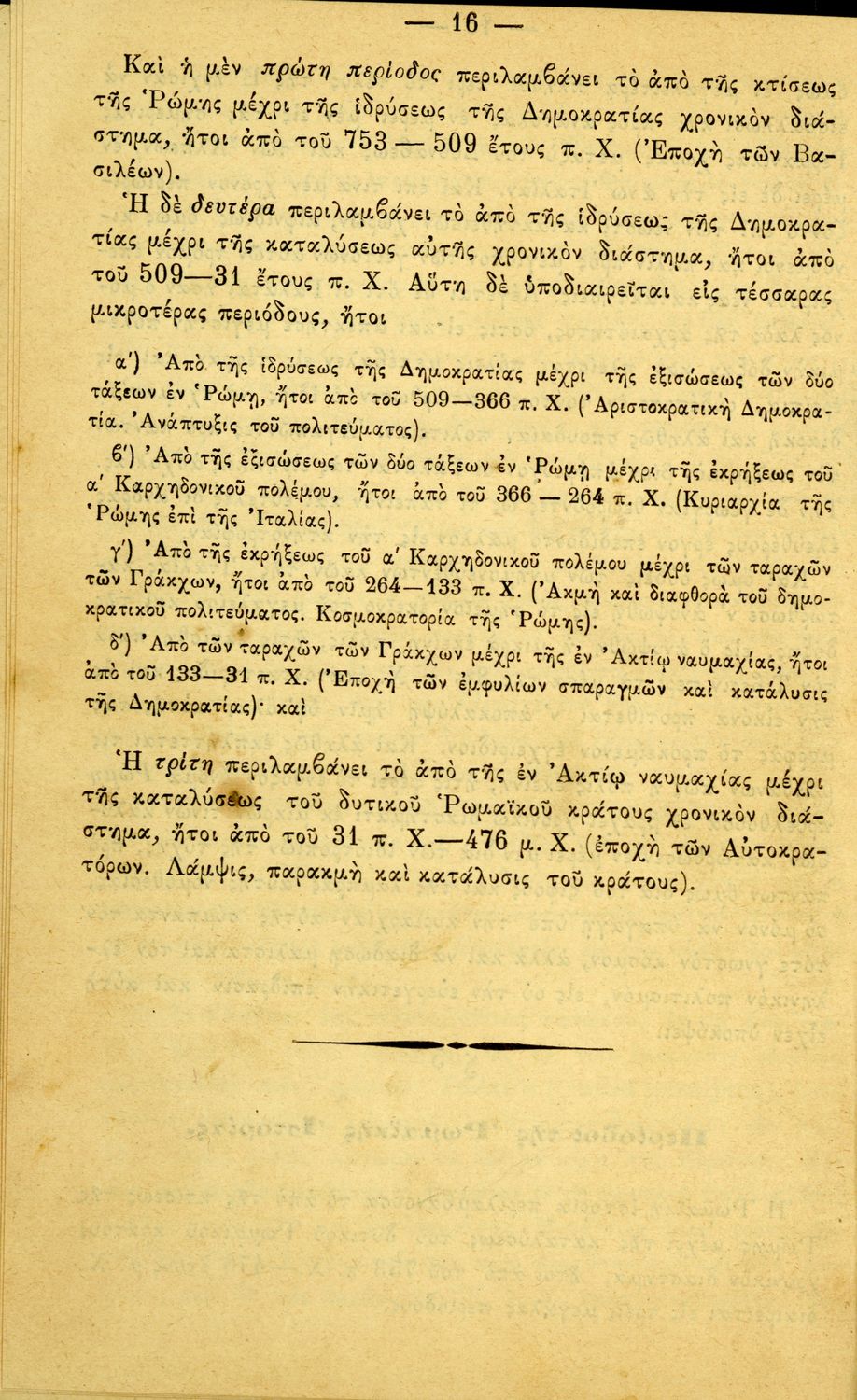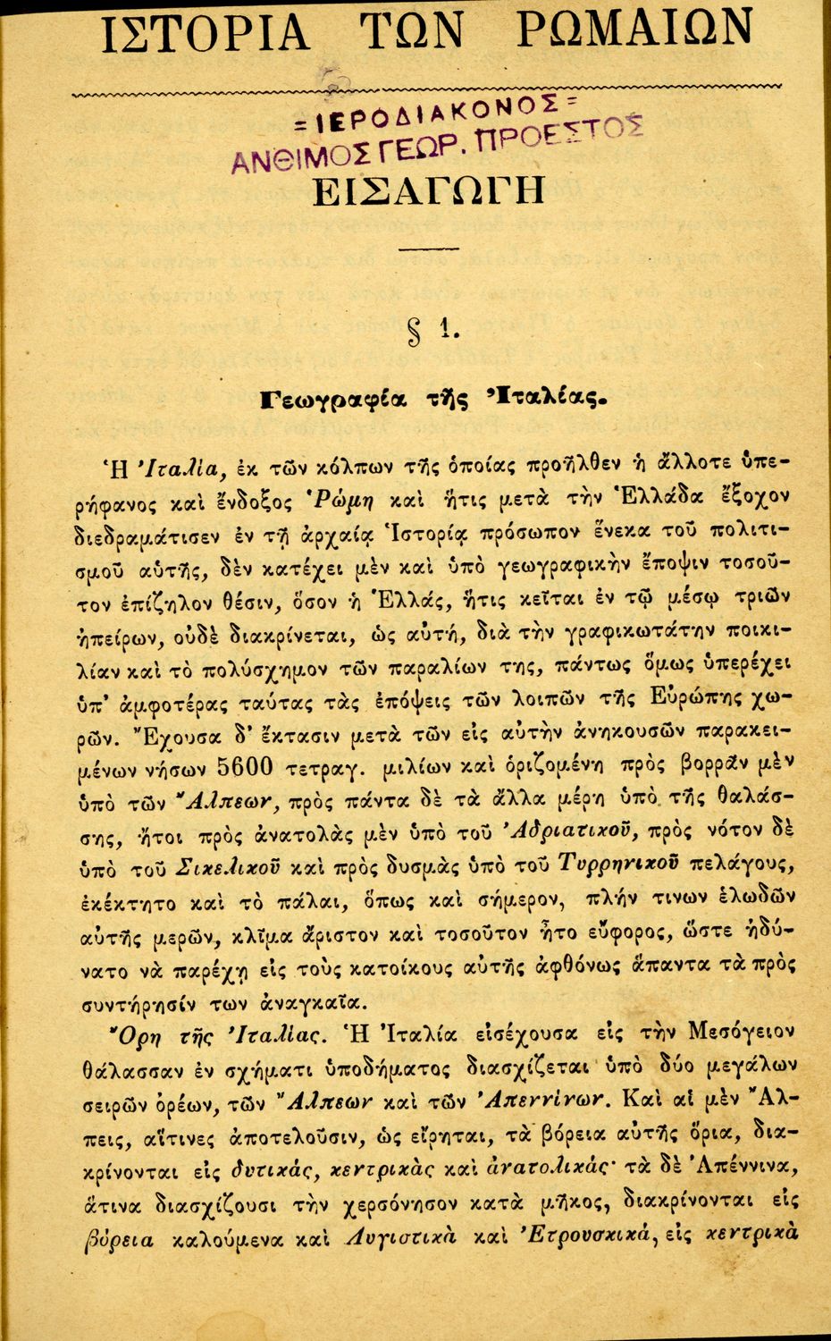 Βαθμίδα εκπαίδευσης: Δευτεροβάθμια Τάξη: Γυμνάσιο Μάθημα: Ιστορία Γλώσσα: Καθαρεύουσα Παρουσίαση περιεχομένου: Σχολικό εγχειρίδιο Ιστορίας Γυμνασίου που περιλαμβάνει την ιστορία της Ρώμης από την ίδρυση της μέχρι και το 400 μ. Χ και εστιάζει στις κτίσεις της Ρώμης, το πολίτευμά της και στα πνευματικά ρεύματα και είδη φιλοσοφικής σκέψης που αναπτύχθηκαν κατά αυτή την περίοδο. |