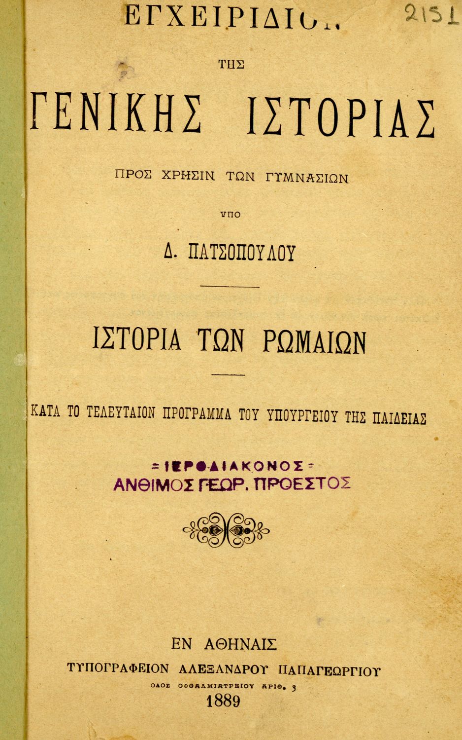 Κωδικός αναγνώρισης: 20-02151 Τίτλος: Εγχειρίδιον της γενικής ιστορίας προς χρήσιν των Γυμνασίων - Ιστορία των Ρωμαίων Συγγραφέας: Δ. Πατσόπουλος Μέγεθος και υπόστρωμα: Σχολικό εγχειρίδιο, 19εκ., σκληρό εξώφυλλο, 264 σελίδες. |