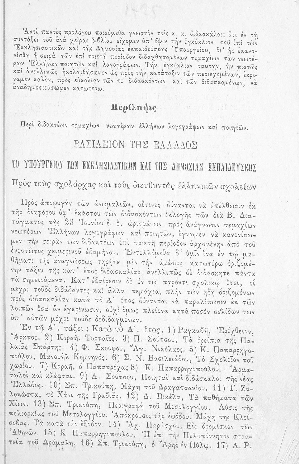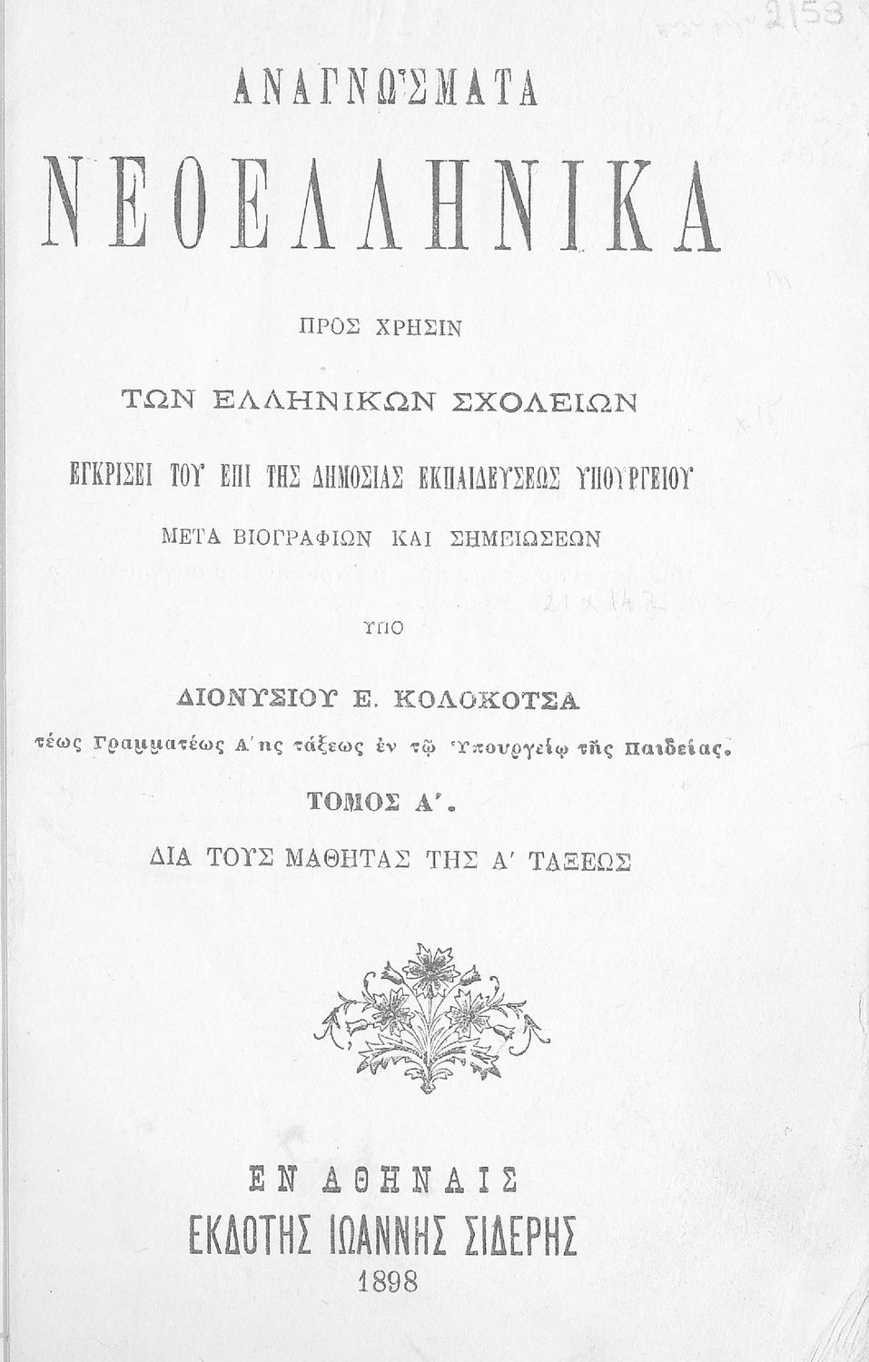 Σχολικό εγχειρίδιο Νέων Ελληνικών Γ' Ελληνικού Σχολείου και Α΄ Αστικού Σχολείου των Θηλέων που περιλαμβάνει ποιήματα και πεζά Ελλήνων συγγραφέων και δημοτικά τραγούδια εμπνευσμένα από την σύγχρονη ελληνική ...
