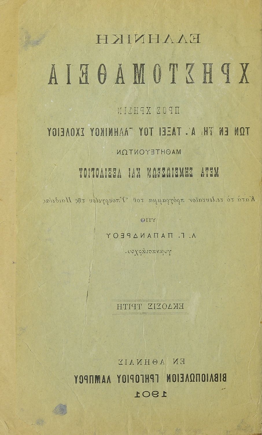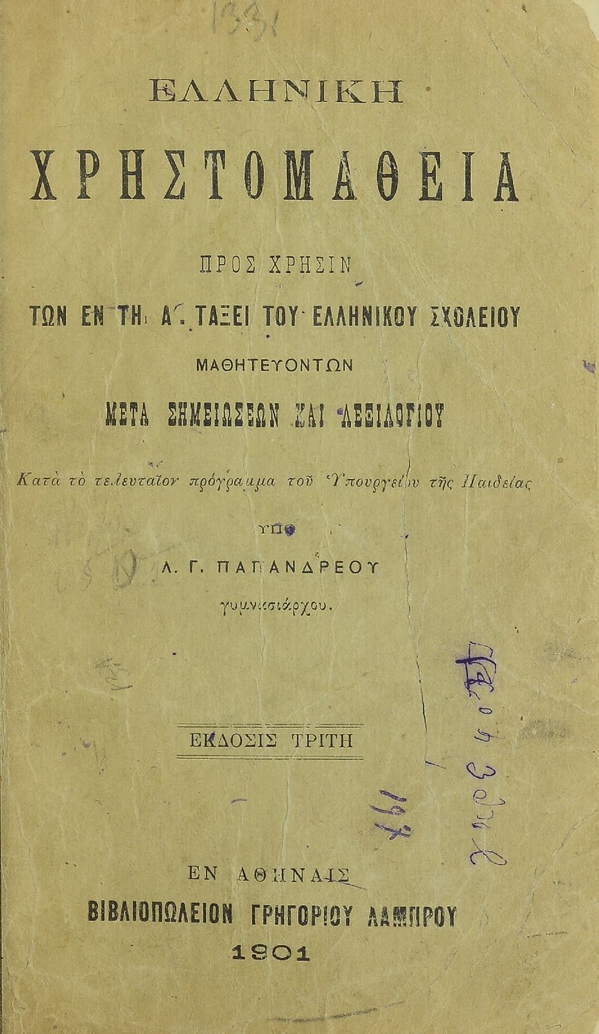 Τίτλος: Ελληνική χρηστομάθεια προς χρήσιν των εν τη Α΄ τάξει του Ελληνικού Σχολείου μαθητευόντων