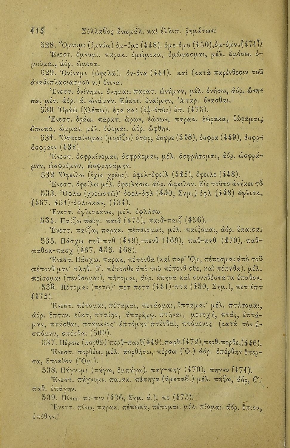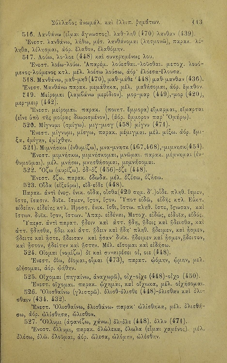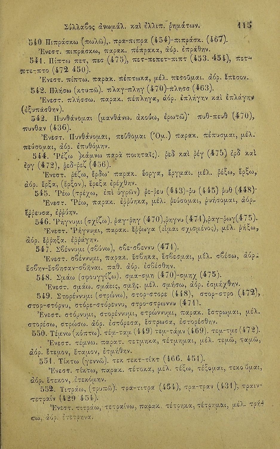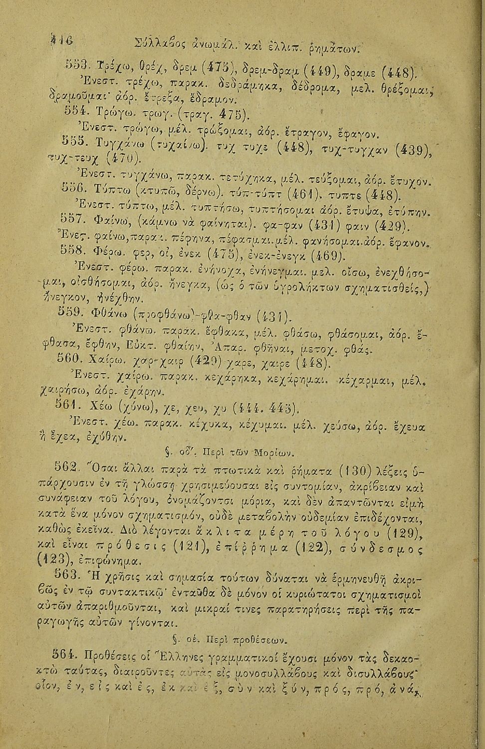 Μαθητικό βοήθημα Αρχαίων Ελληνικών για τα Ελληνικά Σχολεία, Παρθεναγωγεία και Γυμνάσια που περιλαμβάνει γραμματική της αρχαίας ελληνικής και κατάλογο ανωμάλων ρημάτων.