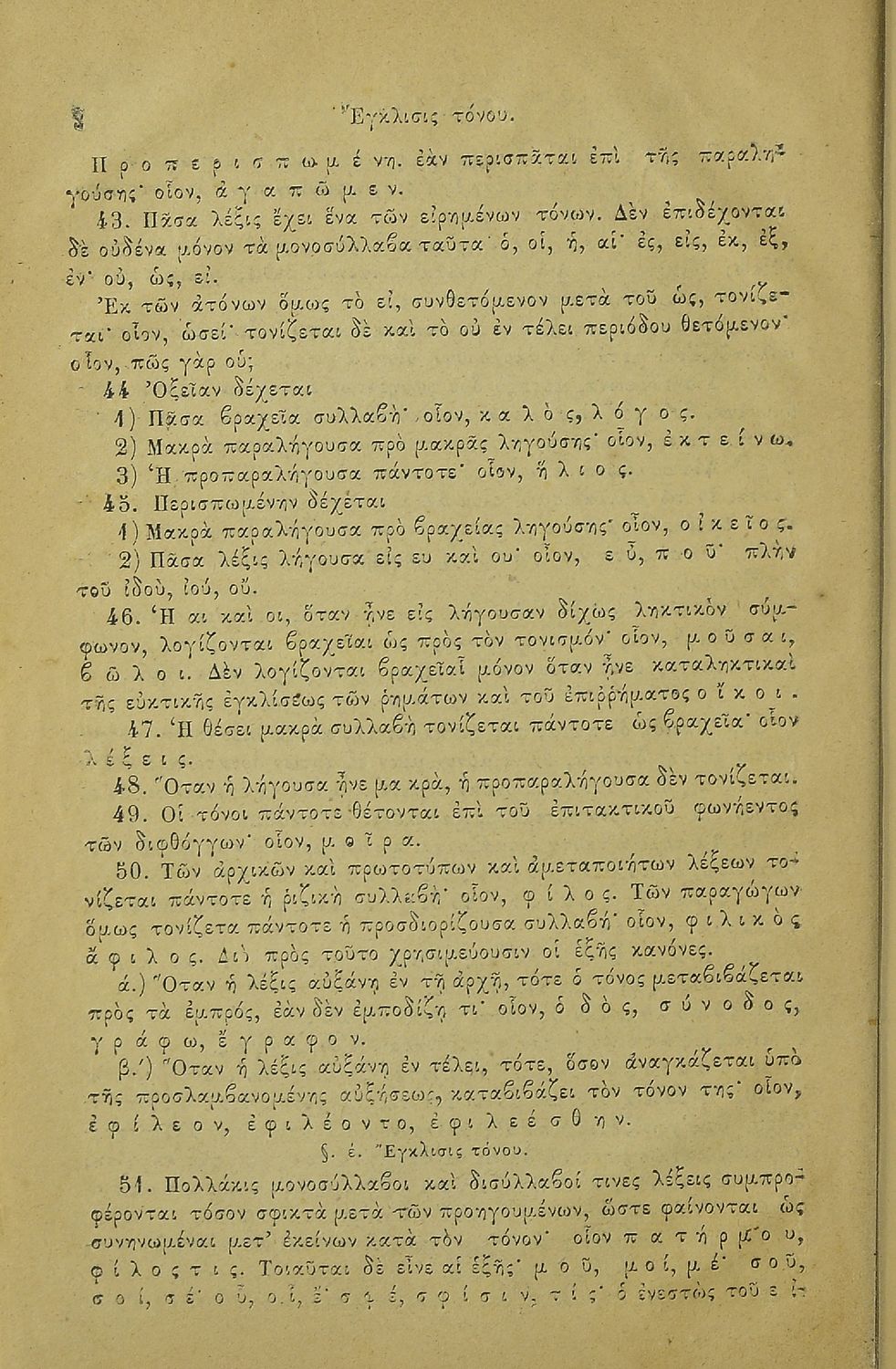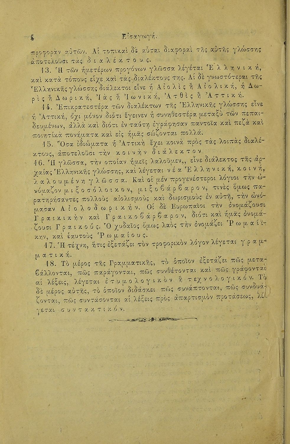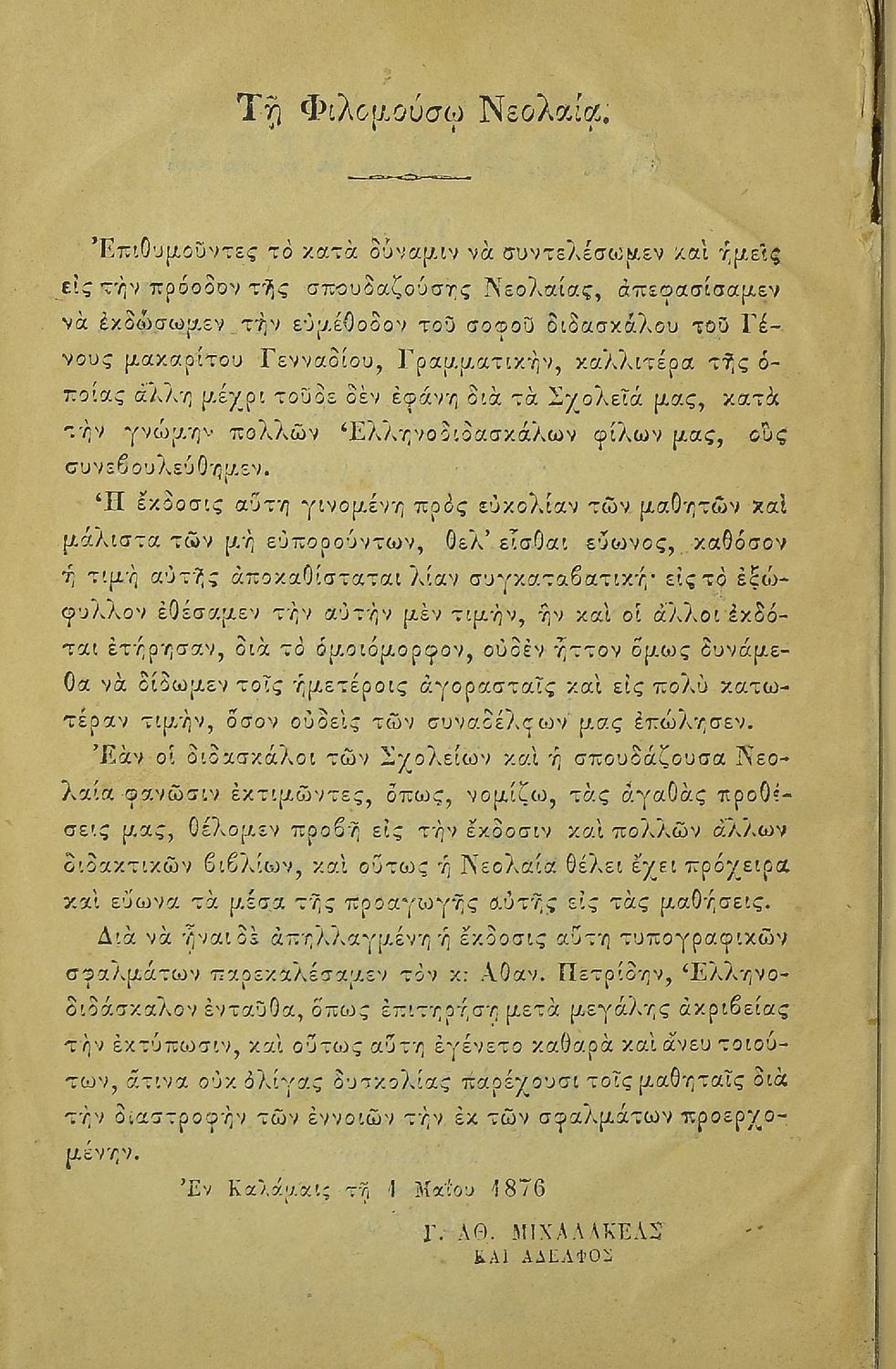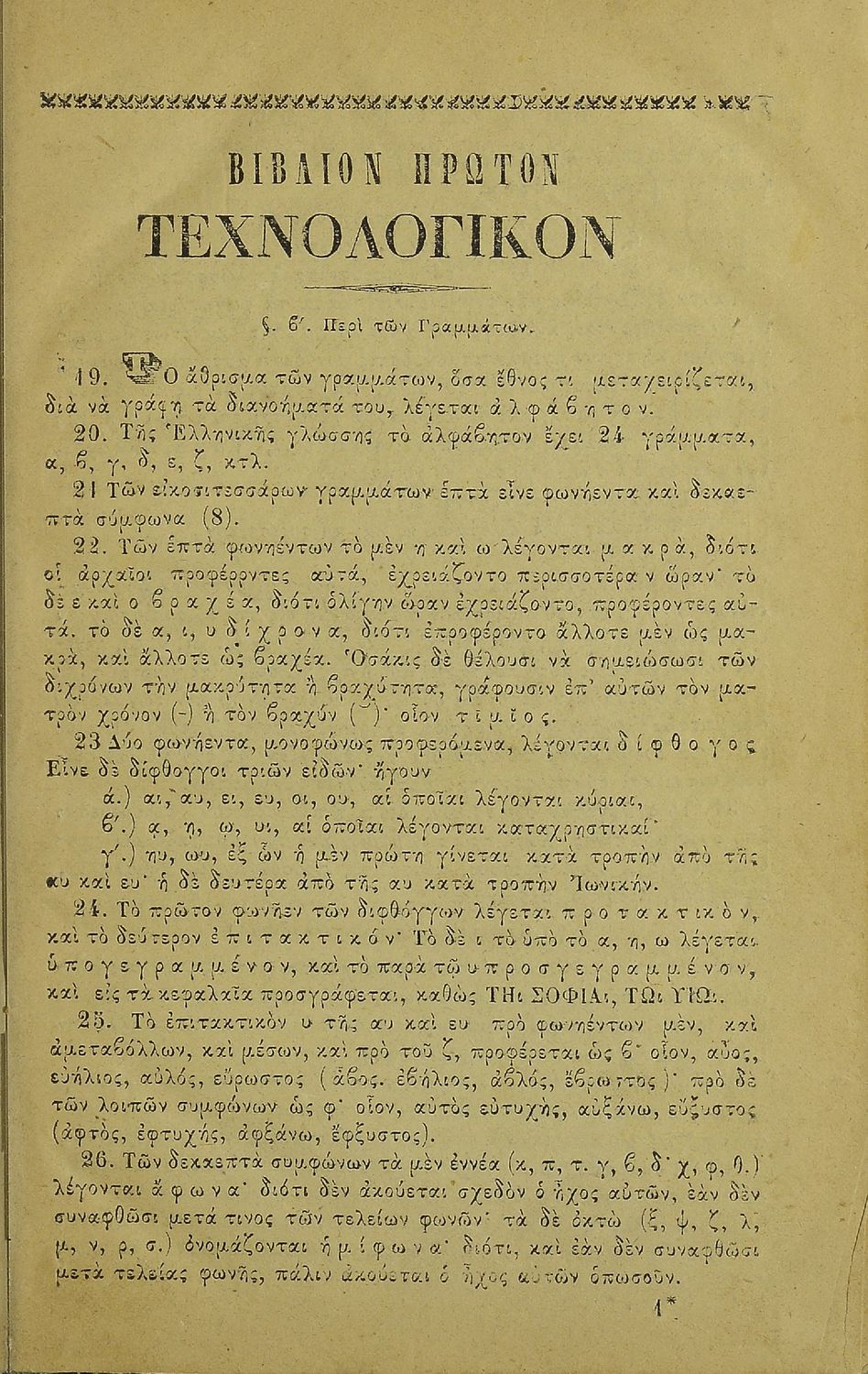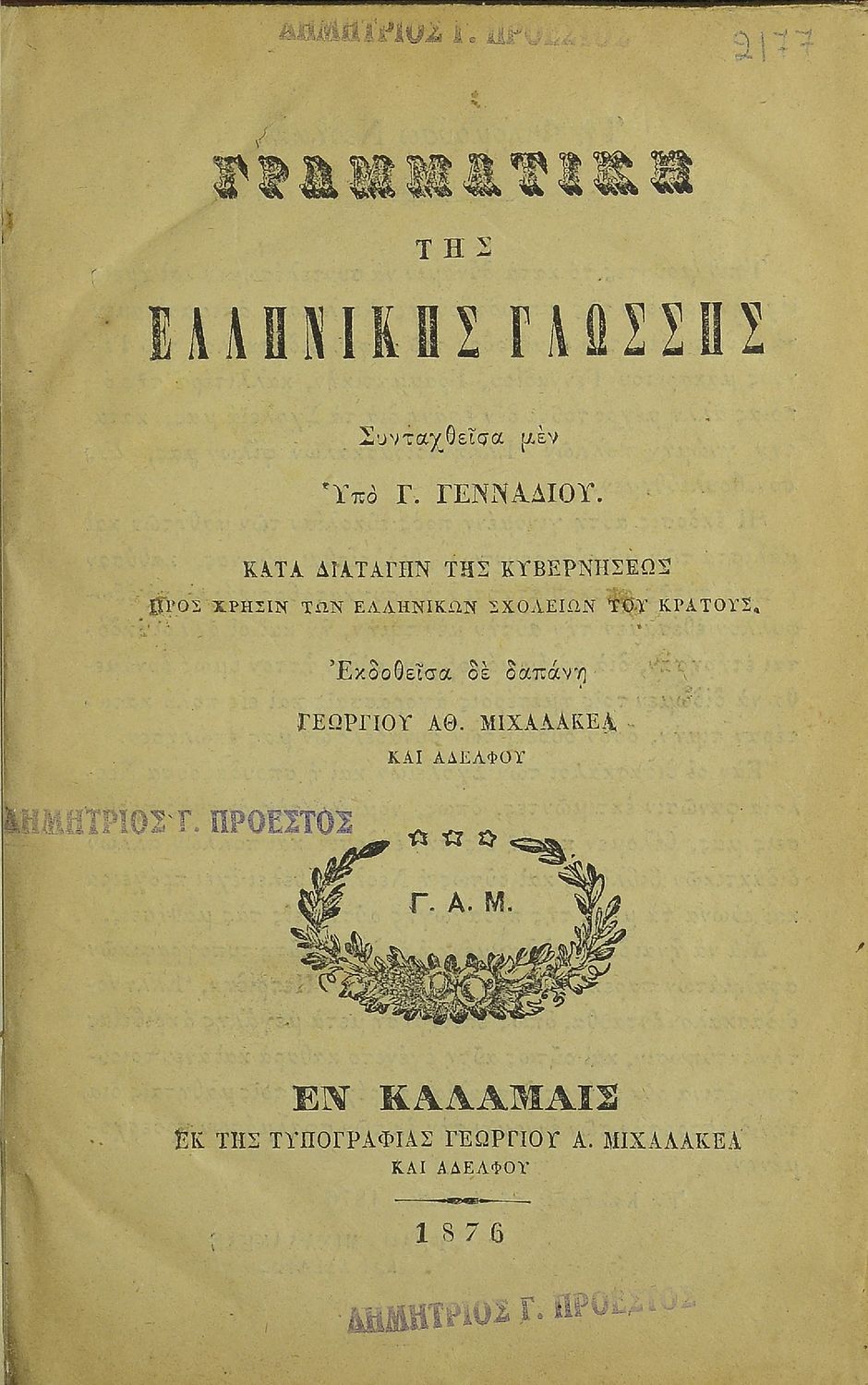 Σχολικό εγχειρίδιο Αρχαίων Ελληνικών για τα Ελληνικά Σχολεία και Παρθεναγωγεία που περιέχει τους κανόνες γραμματικής και είναι χωρισμένο σε φθογγολογικό, τυπολογικό και ετυμολογικό μέρος.