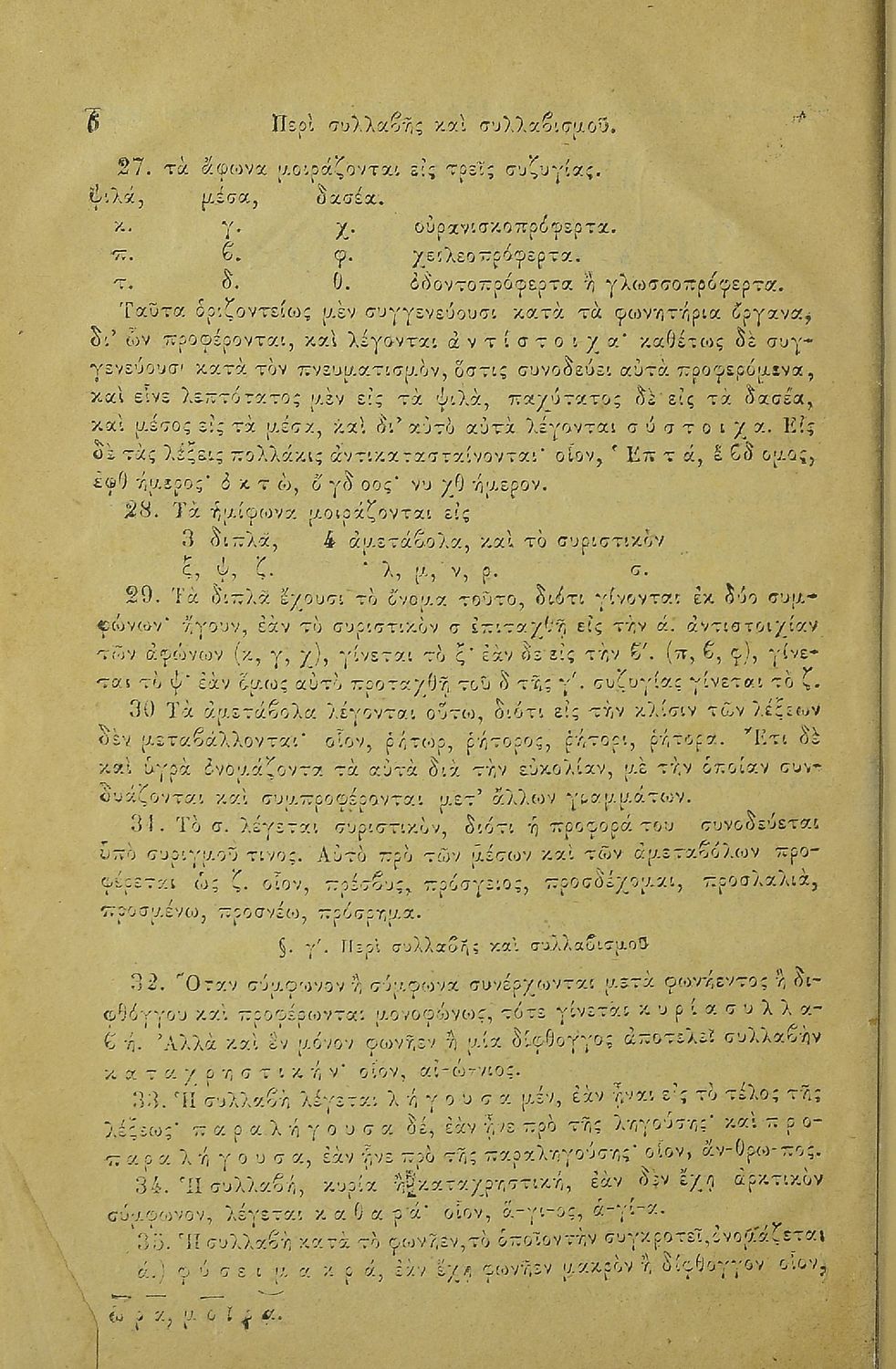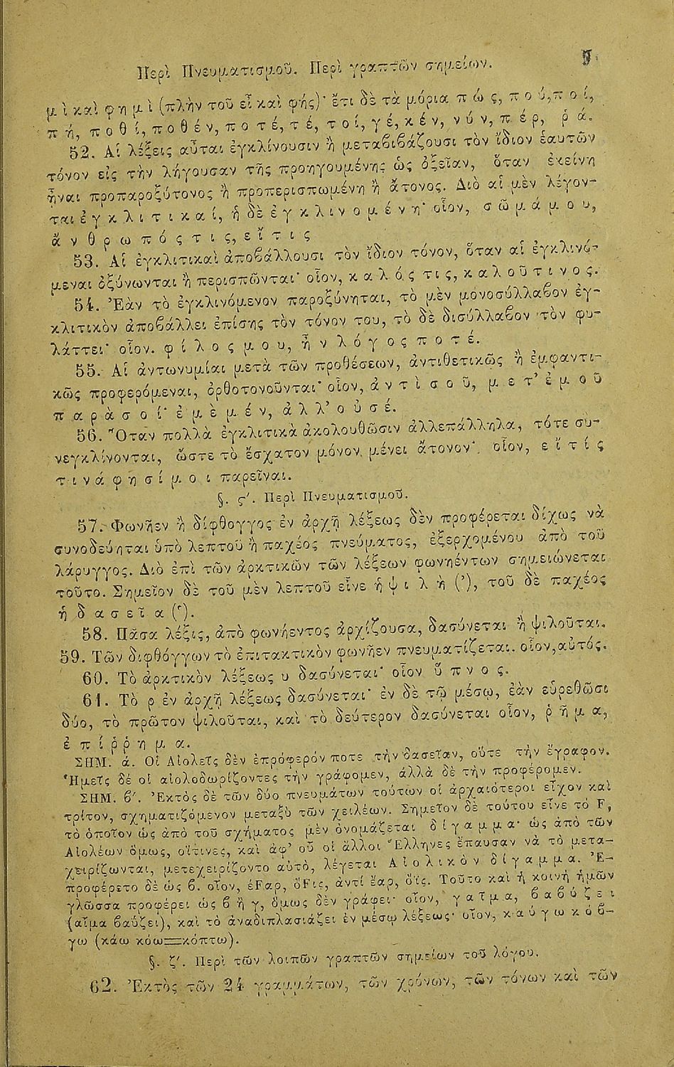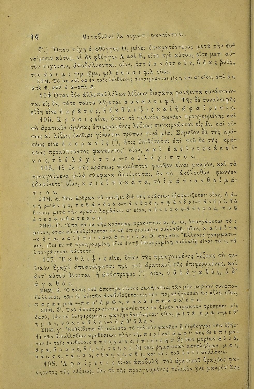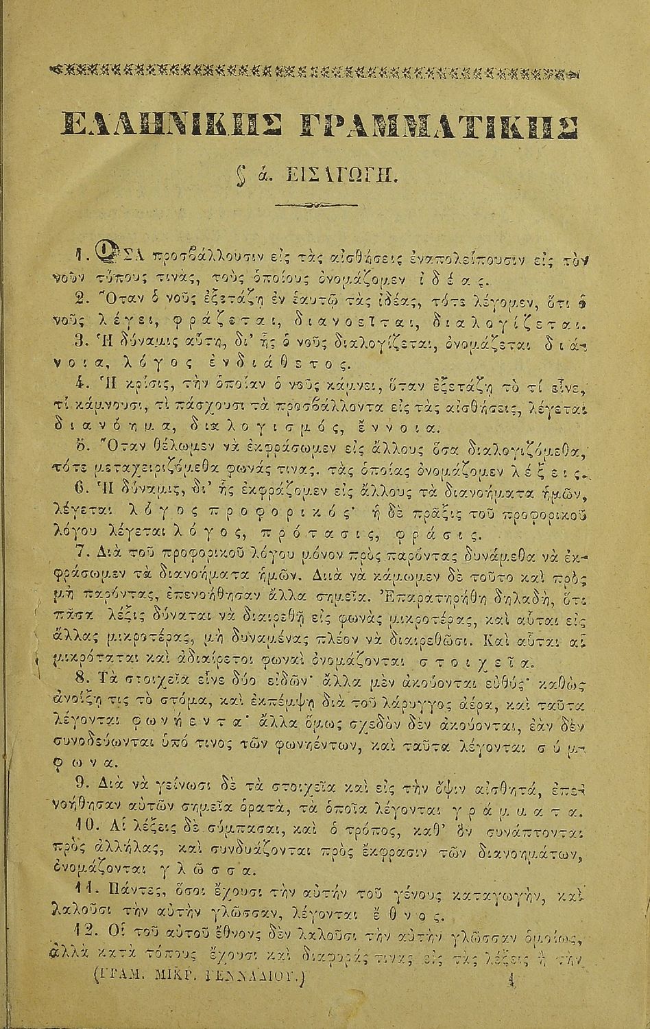Σχολικό εγχειρίδιο Αρχαίων Ελληνικών για τα Ελληνικά Σχολεία και Παρθεναγωγεία που περιέχει τους κανόνες γραμματικής και είναι χωρισμένο σε φθογγολογικό, τυπολογικό και ετυμολογικό μέρος.
